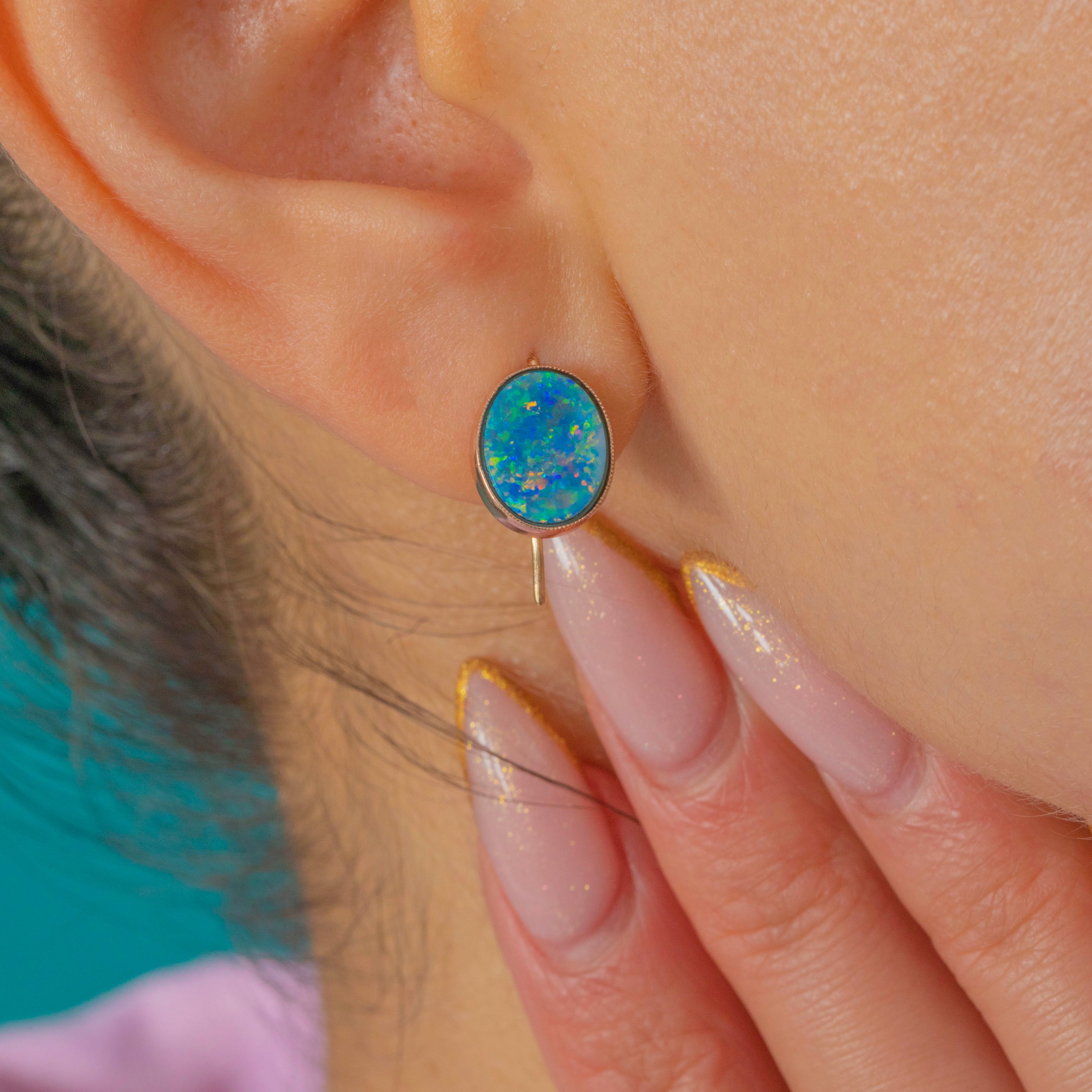 These Art Deco Opal Doublet earrings are a pretty and wearable antique pair, crafted in warm 9ct Gold. The Opals display shifting pastel tones that glow beautifully in the light, framed by smooth Gold bezels for a clean and timeless look.
