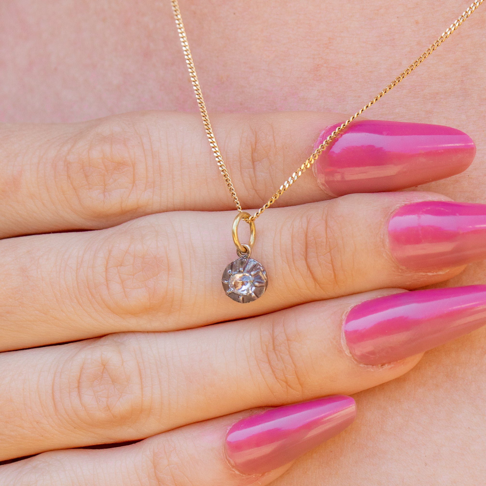 EXCELLENT. This Victorian Old-mine Cut Diamond charm is in excellent condition, with no chips or fleabites to note. She is securely held within her collet setting and is guaranteed to last a lifetime. The Diamond is radiant as ever, which is incredible considering her age. Need we say more?!