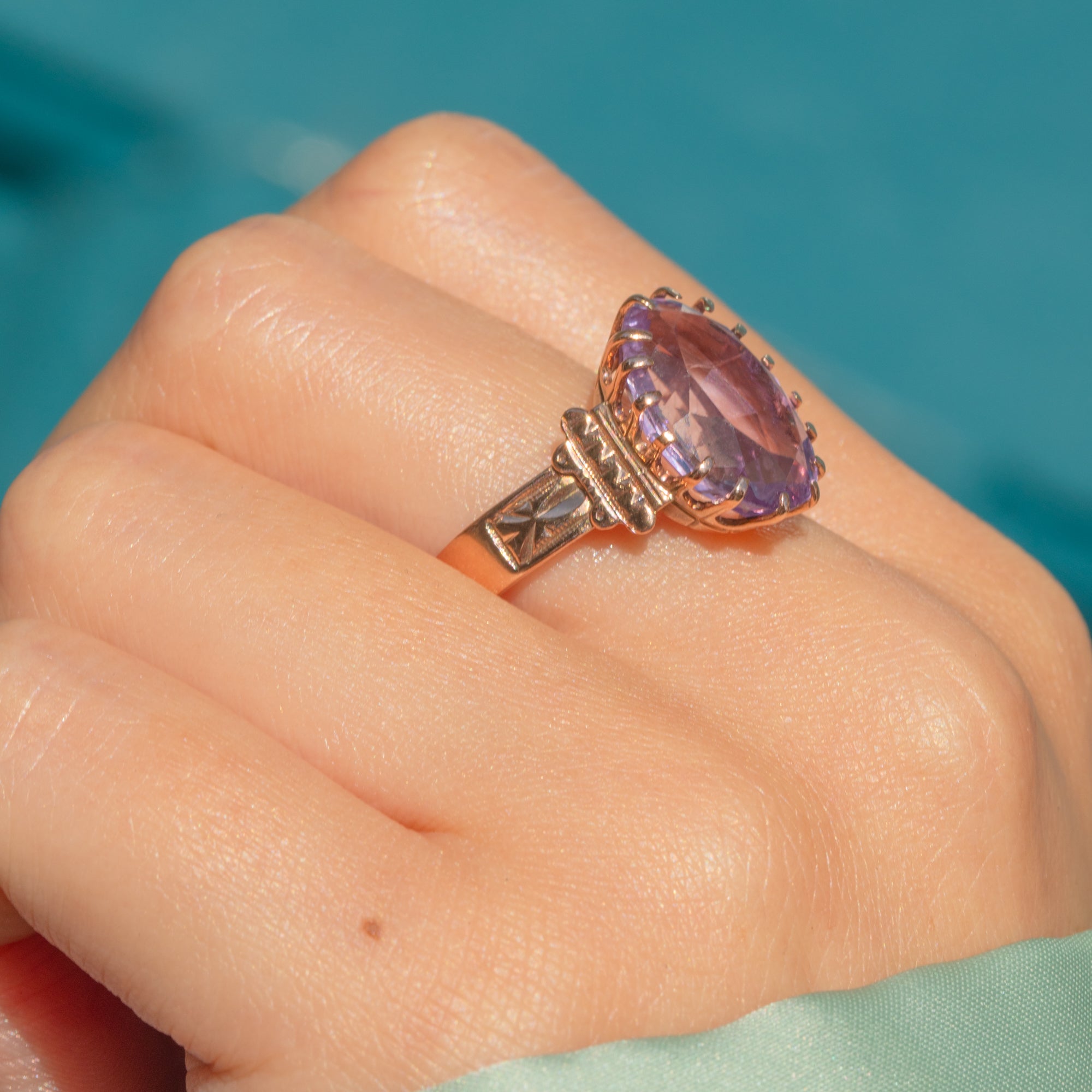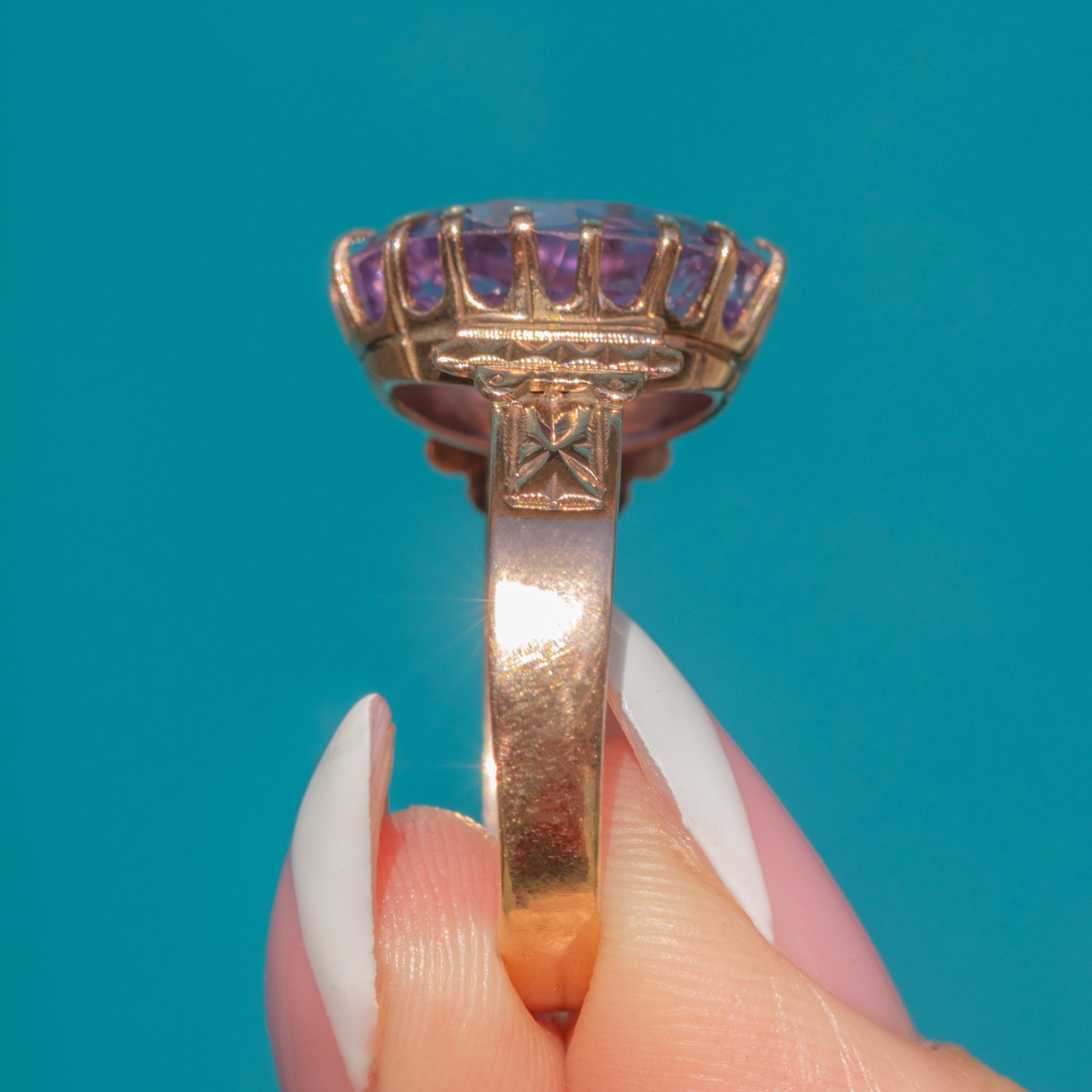 This Victorian Amethyst ring is a sight to behold, with her rich 14ct Gold shank exuding opulence and shoulders displaying intricate engravings fit for royalty!