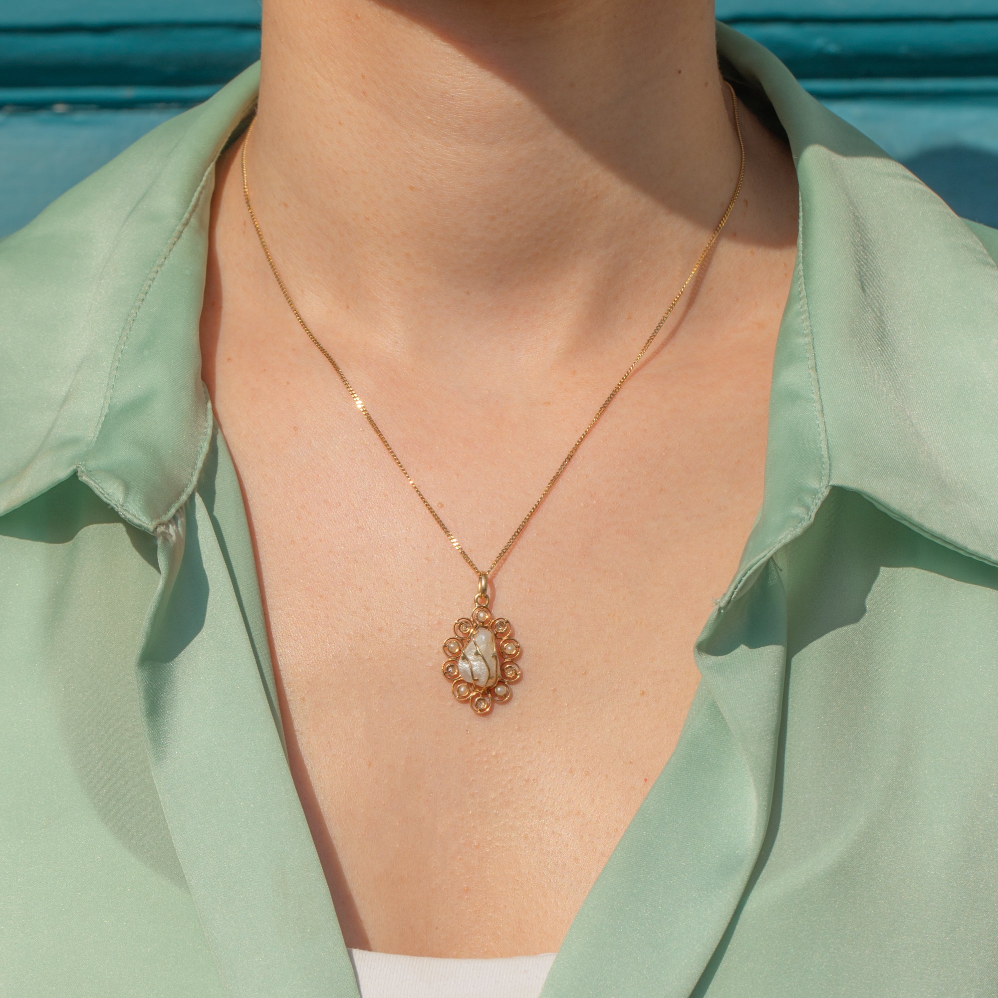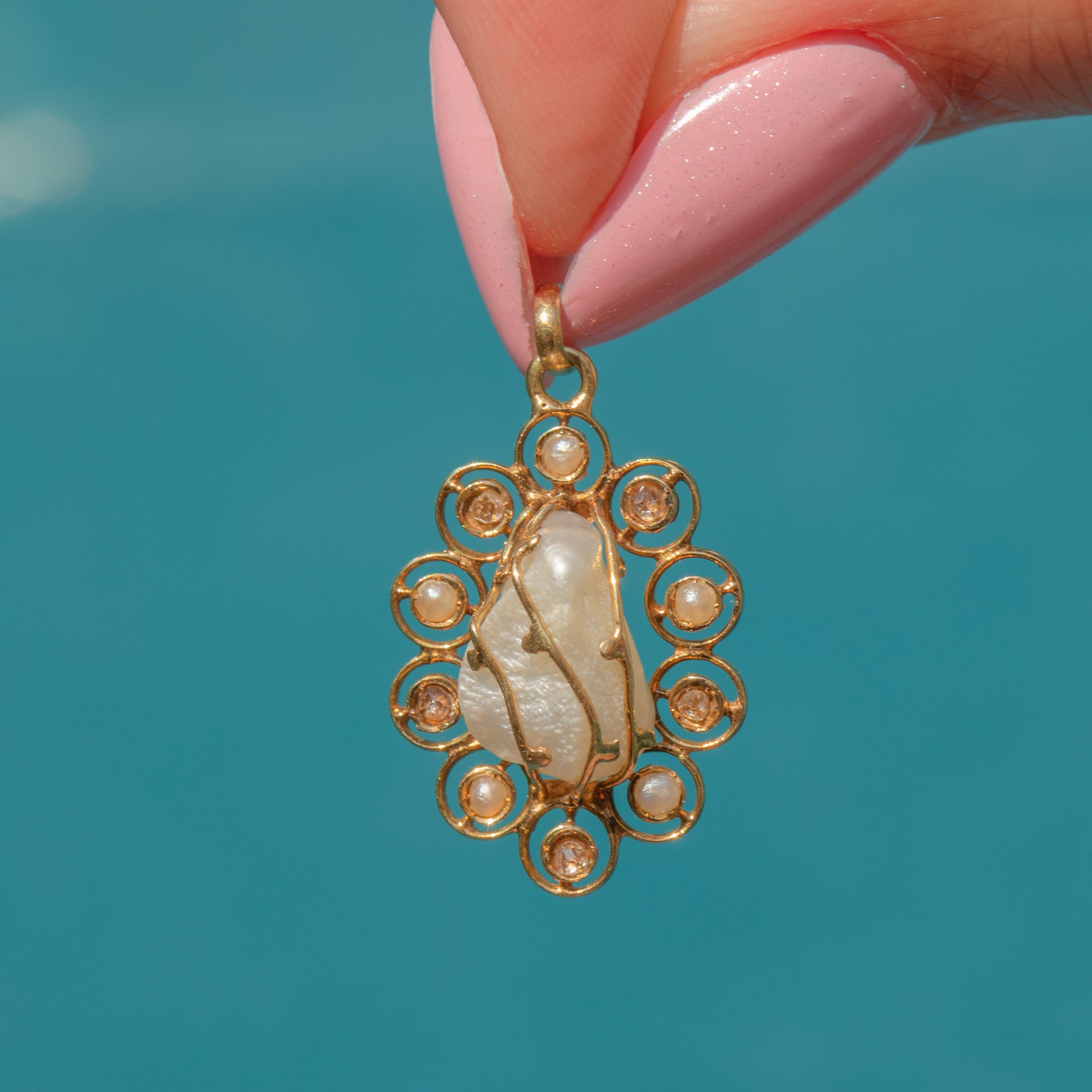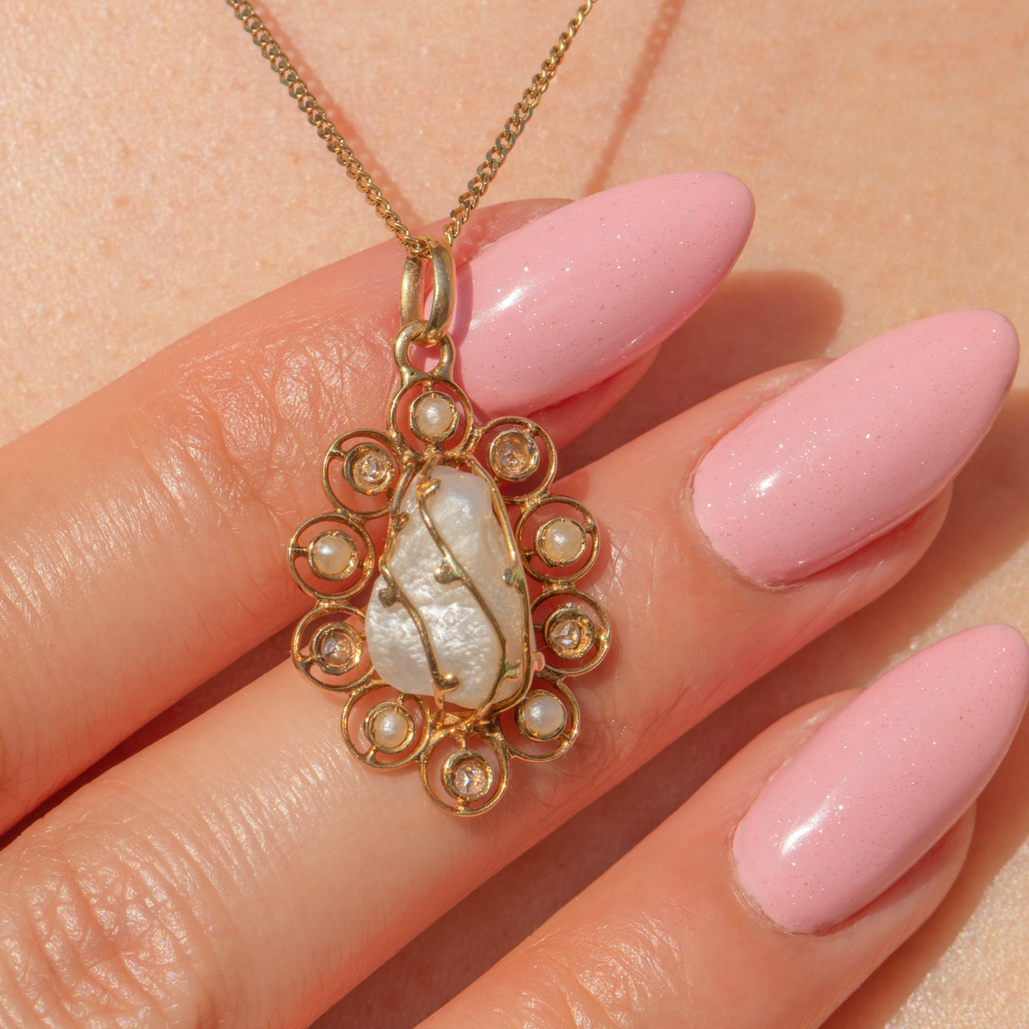 Delicate circles of 14ct Gold halo the Baroque Pearl, dotted with alternating Seed Pearls and rose-cut Diamonds that glint in the light. Simply suspend this Victorian pendant from a fine Gold chain to add a touch of whimsical charm to your attire!