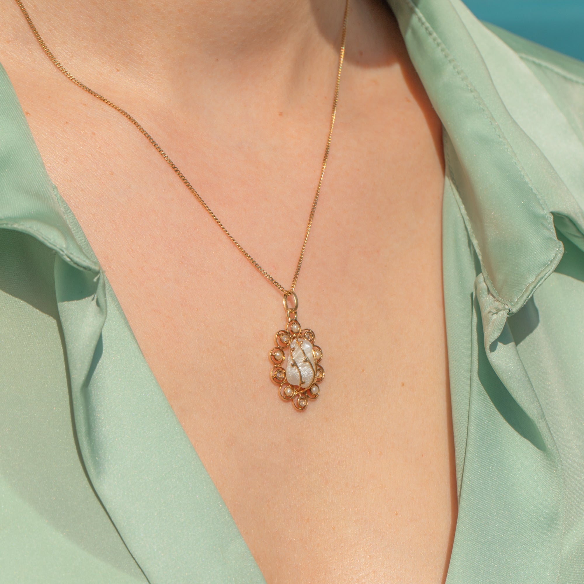 This antique 14ct Gold Baroque Pearl Diamond pendant is a unique piece for your collection! A shimmering Baroque Pearl sits centrestage, its natural form wrapped in Gold wire to create a distinctive design.