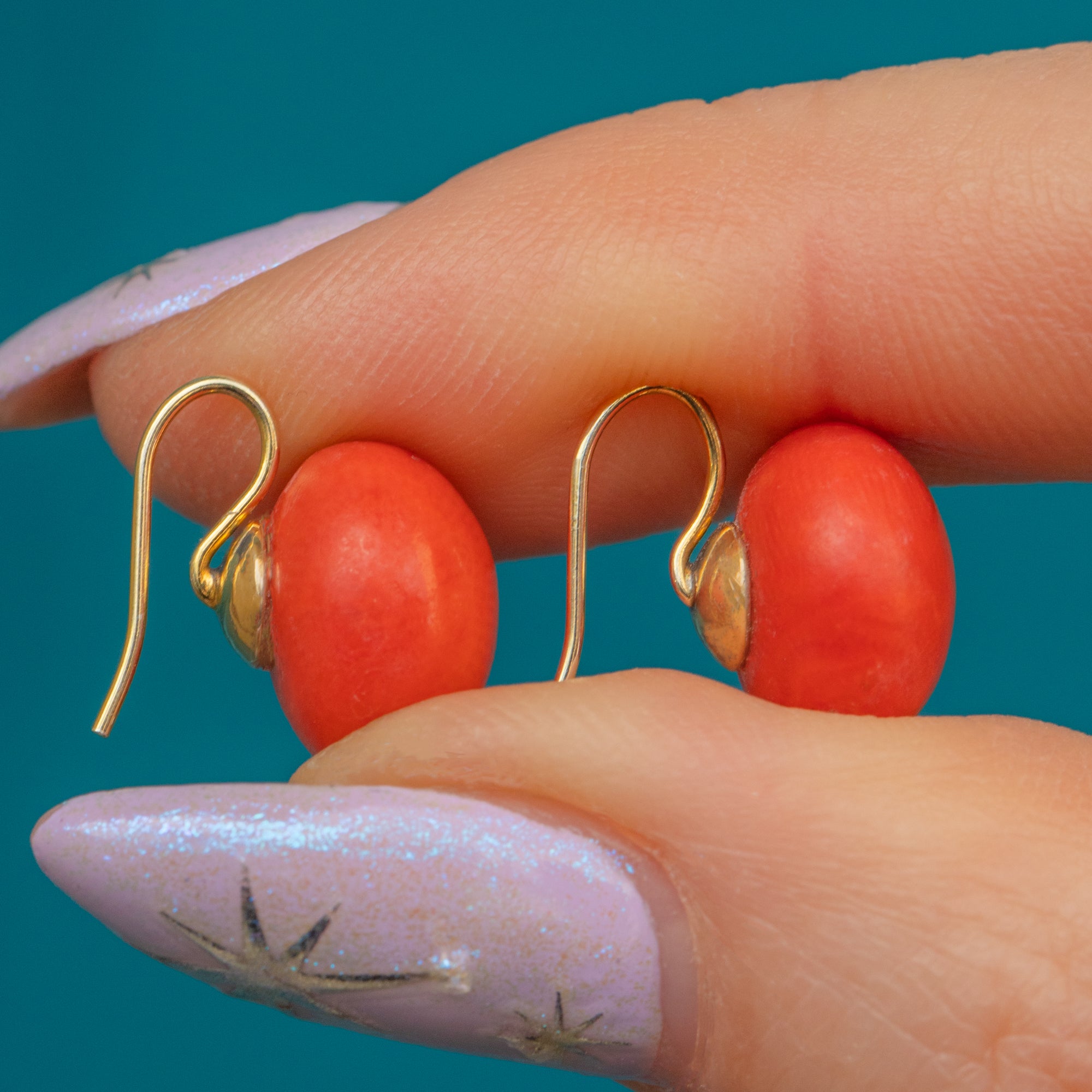 VERY GOOD-EXCELLENT. These antique 14ct Gold Coral button earrings are in wonderful condition. The Coral are smooth with only minor signs of surface wear, commensurate with age, and are securely affixed to their posts. The Gold is bright and the hooks are robust, providing secure and comfortable wear!