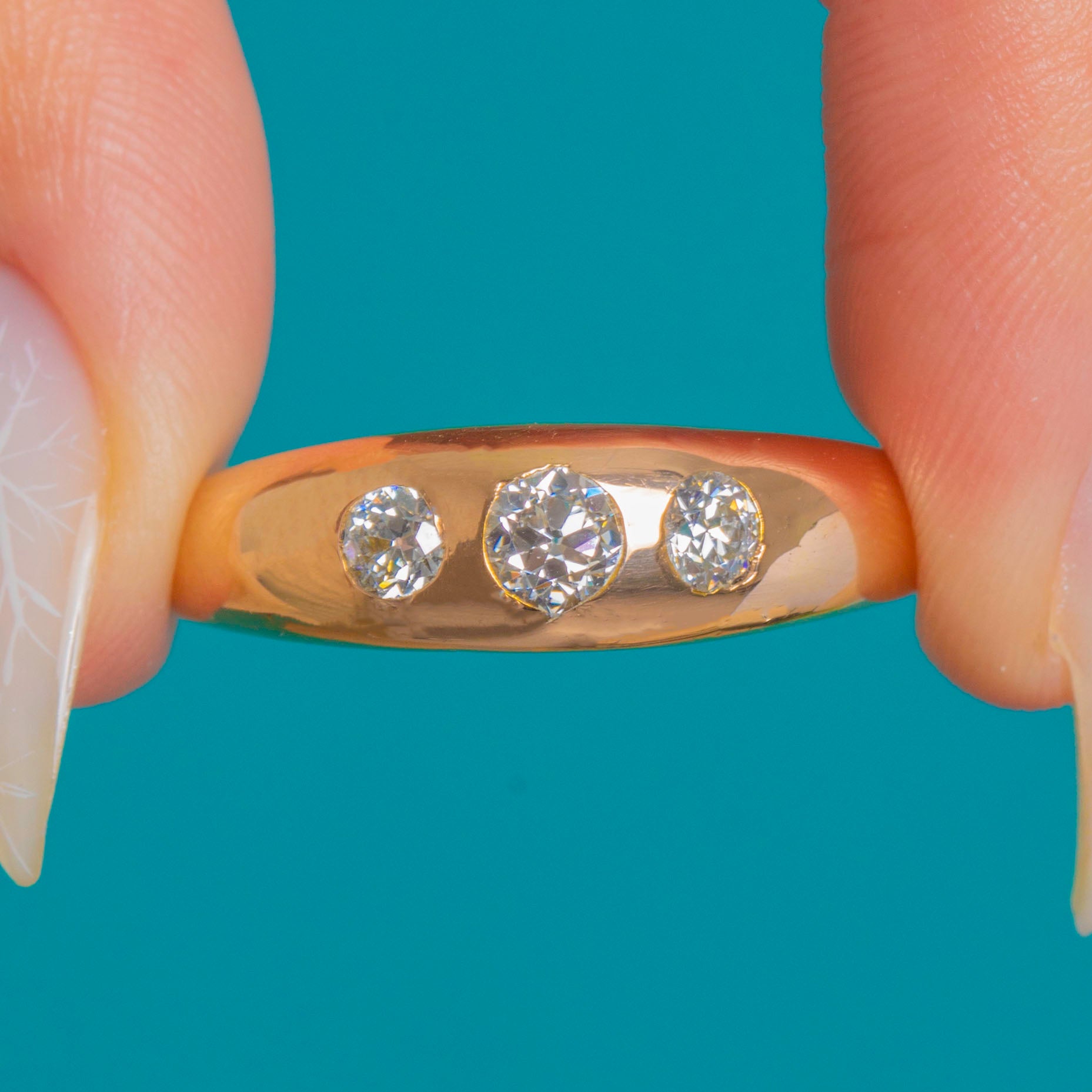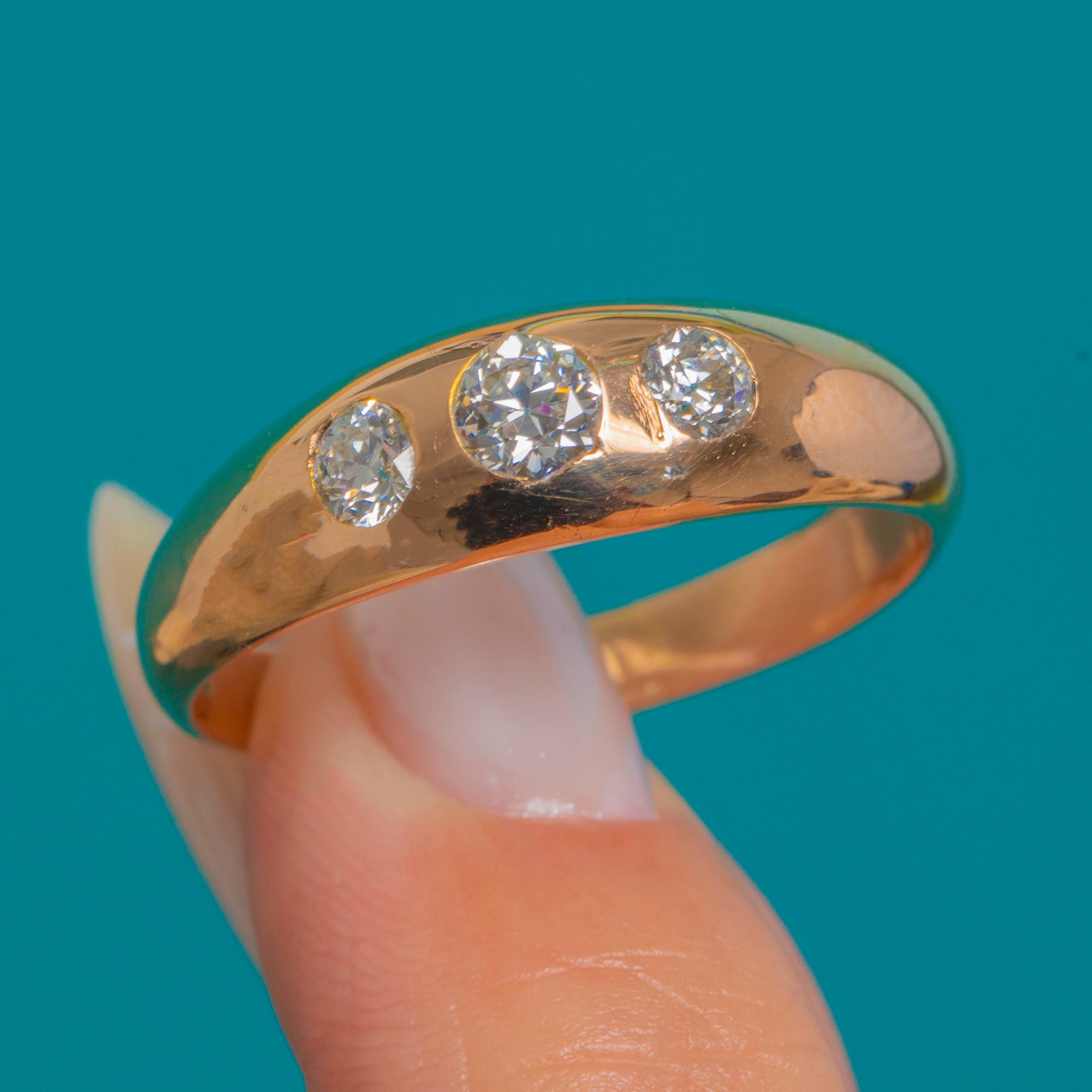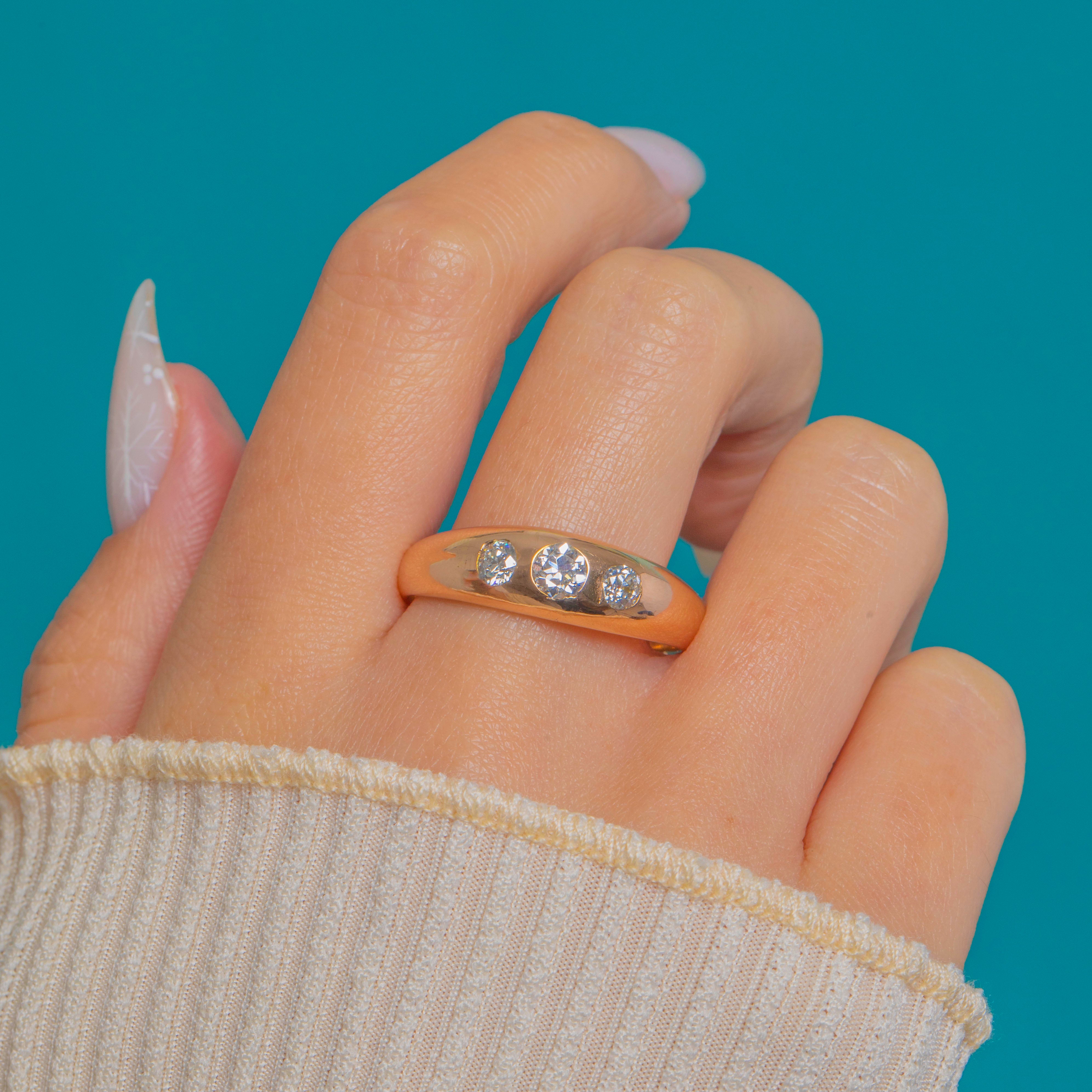 Sleek, sculptural and so wearable, this antique trilogy ring showcases three Old European Cut Diamonds set flush into a domed 14ct Gold band. The low-profile gypsy settings and polished curves give it that effortless Victorian elegance, while the graduated Diamonds sparkle crisply against the warm glow of the Gold.