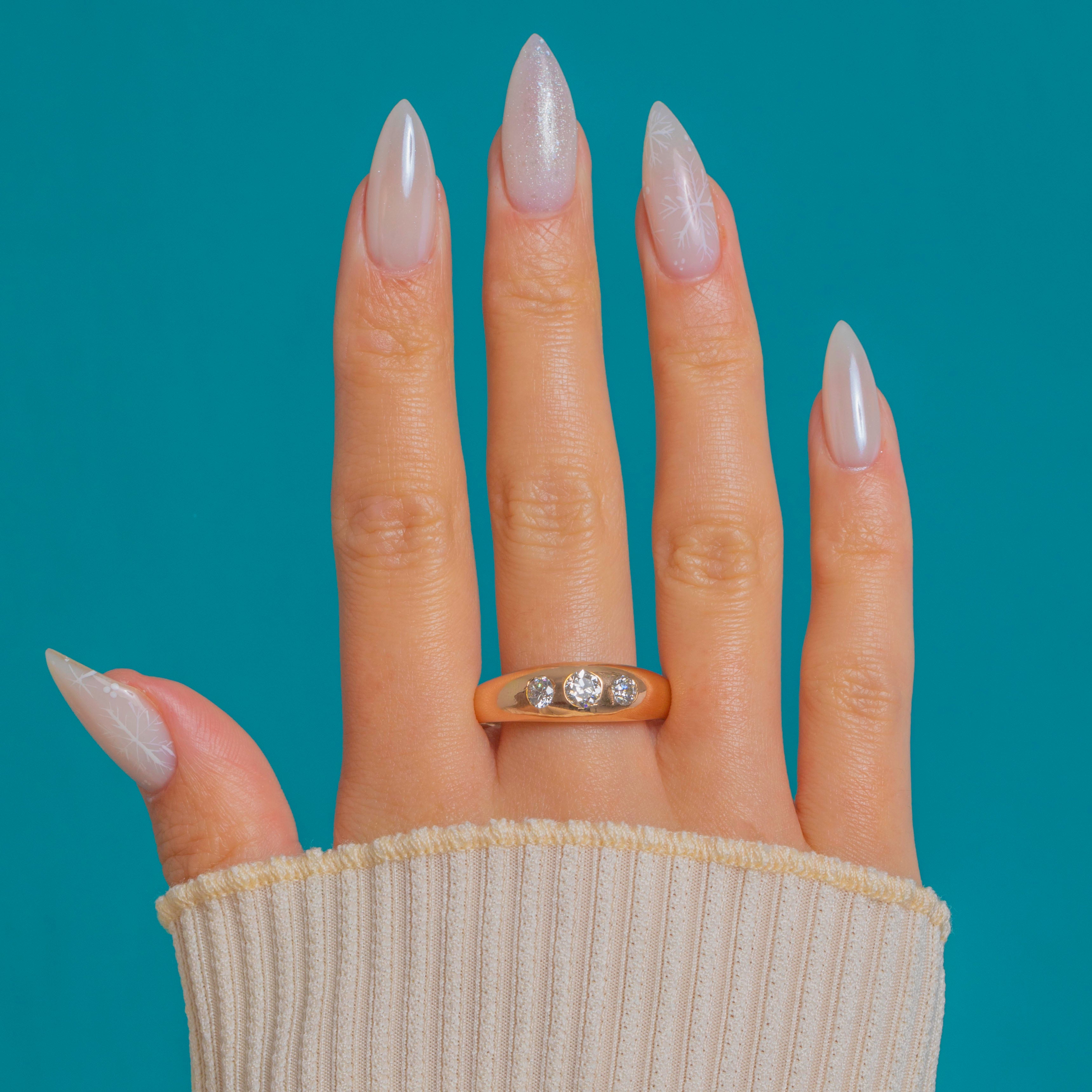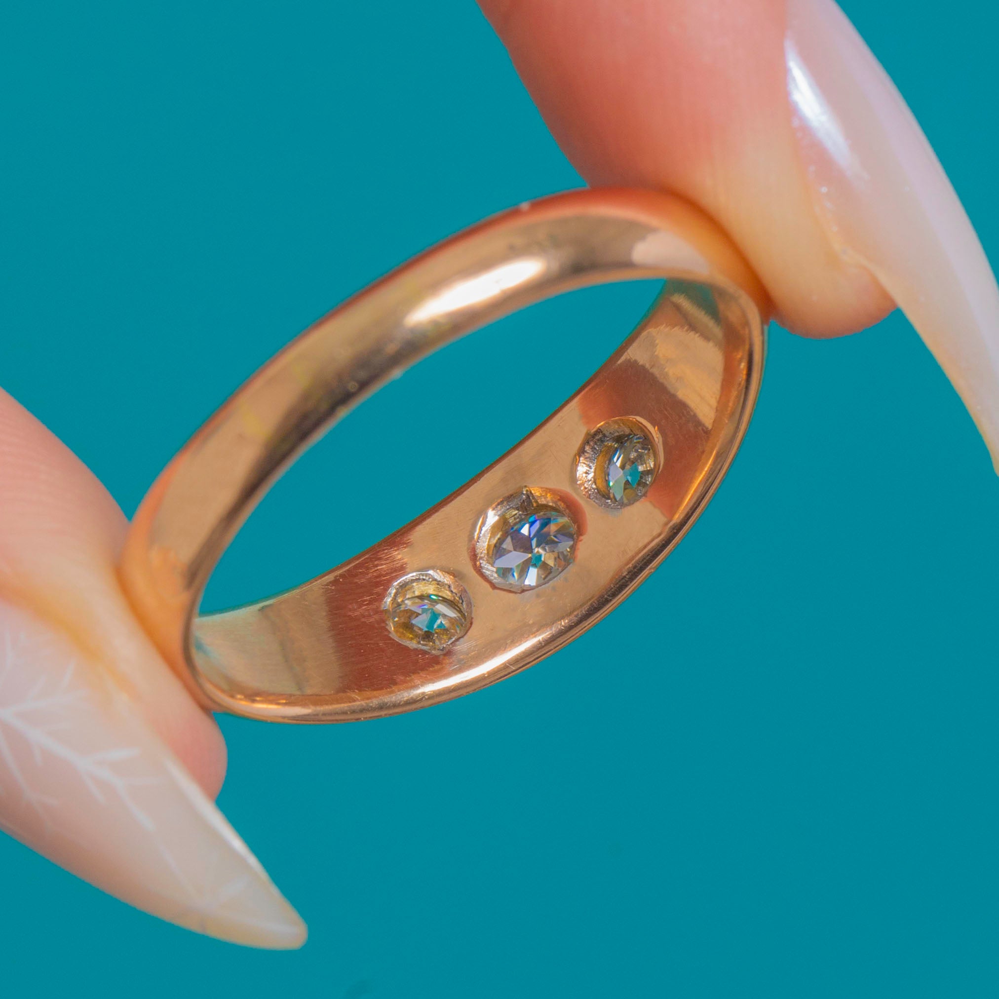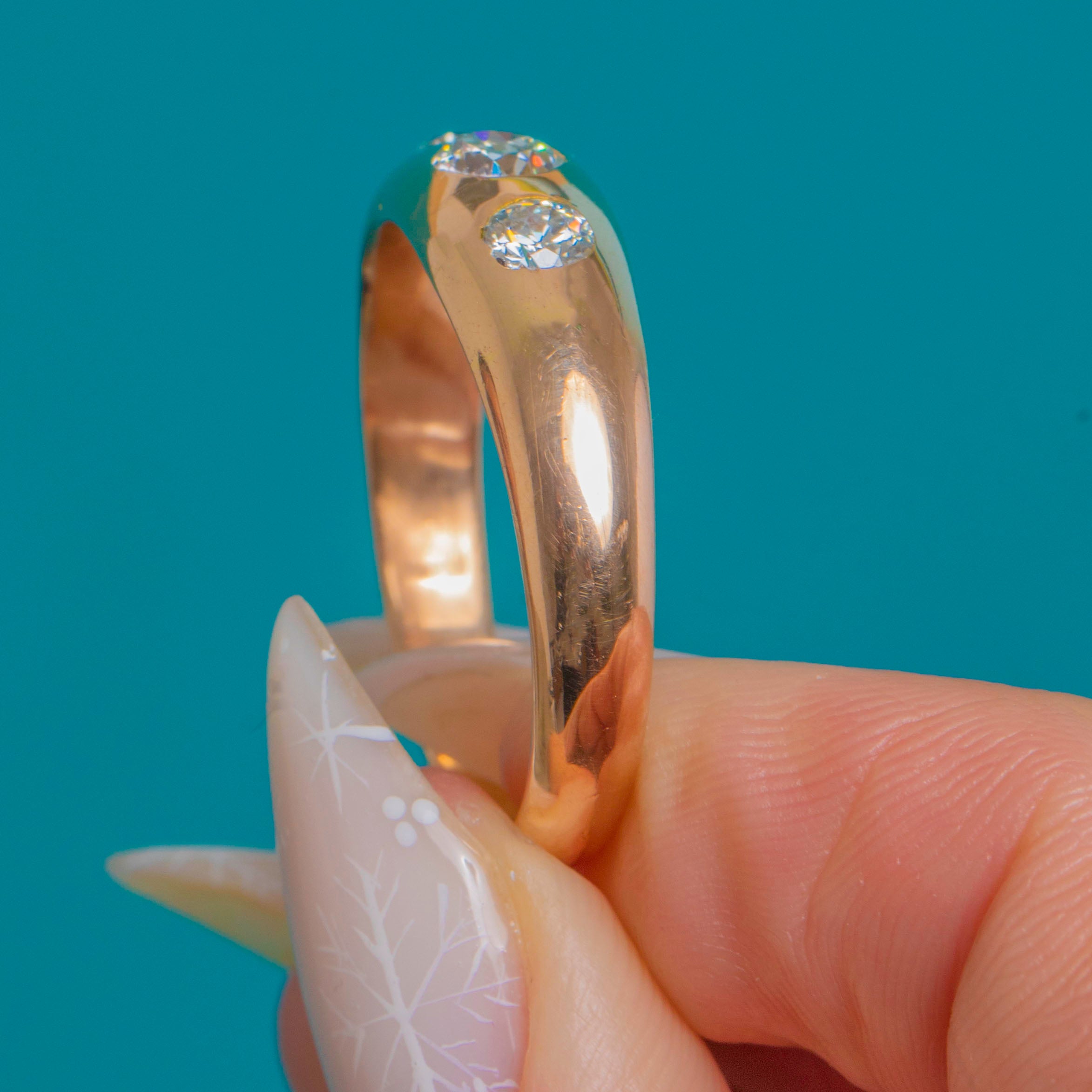 Sleek, sculptural and so wearable, this antique trilogy ring showcases three Old European Cut Diamonds set flush into a domed 14ct Gold band. The low-profile gypsy settings and polished curves give it that effortless Victorian elegance, while the graduated Diamonds sparkle crisply against the warm glow of the Gold.