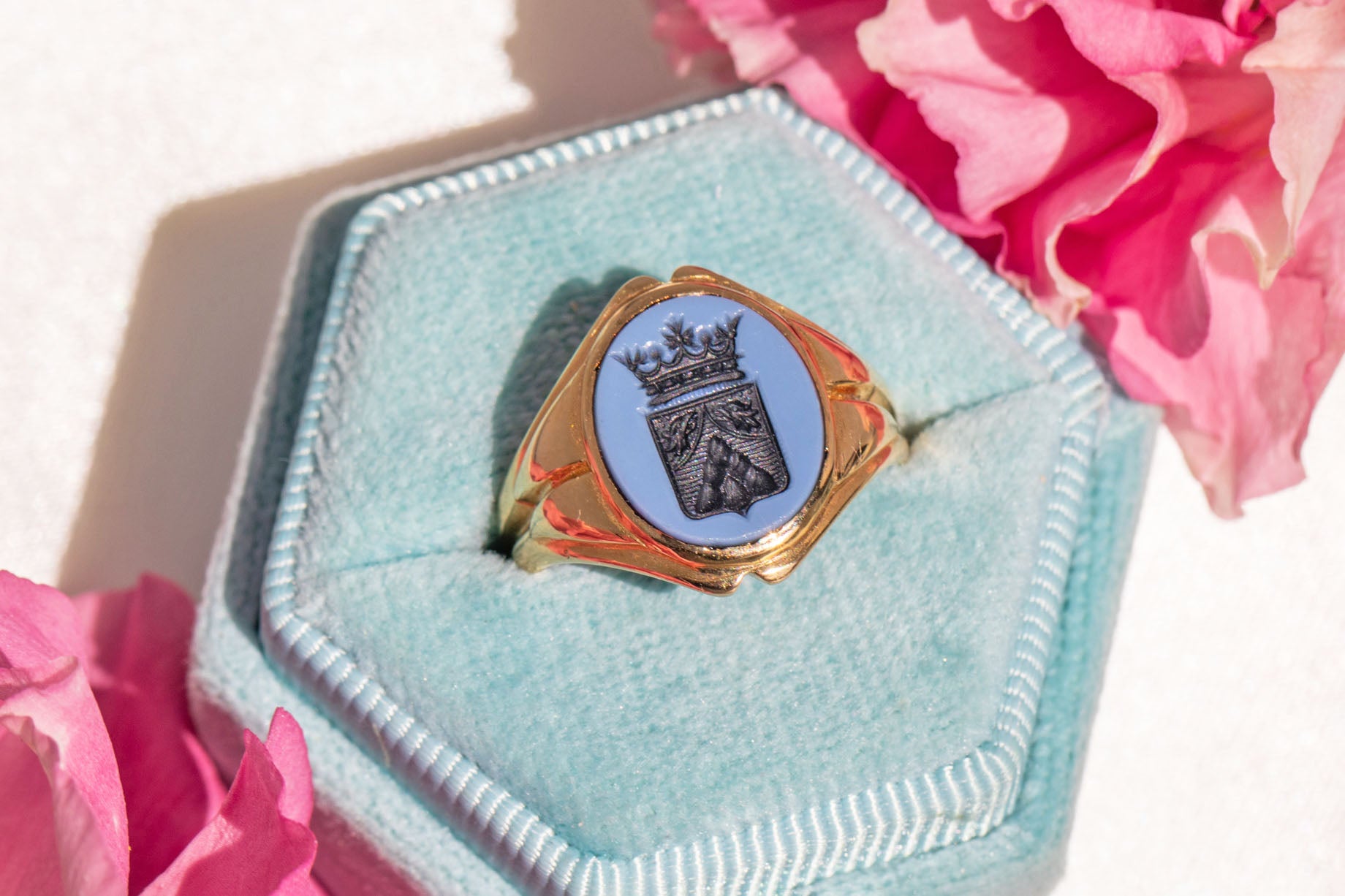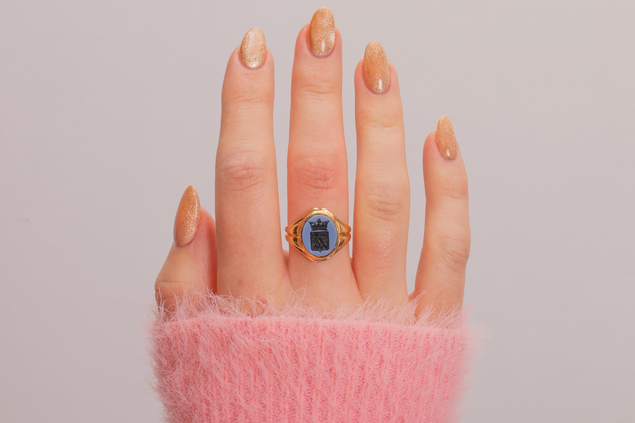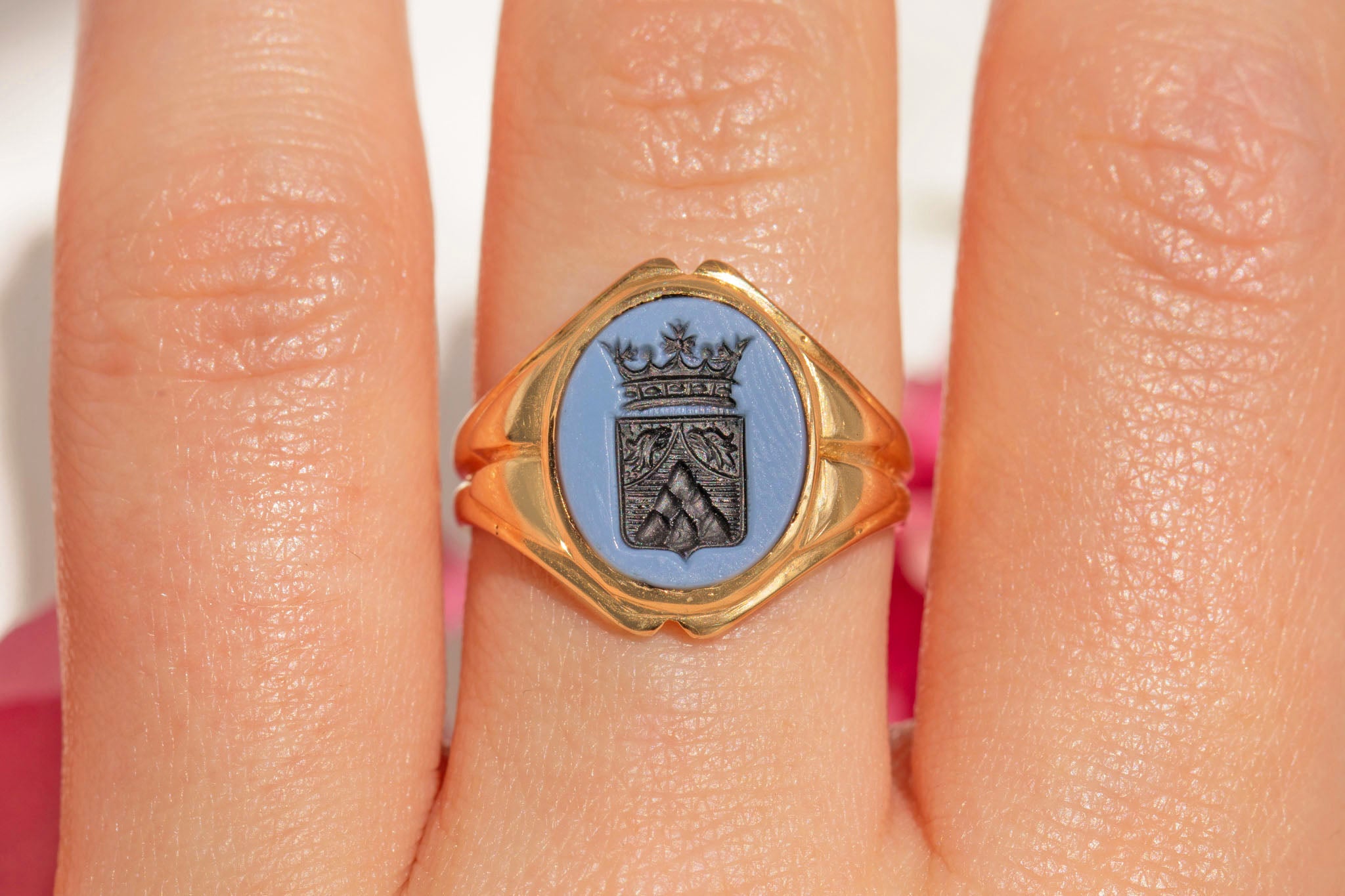 Her antique signet ring head is composed of a flint grey banded Agate with a royal heraldic intaglio carved into her hard stone, revealing her charcoal black colour underneath. We believe this would have been a family heirloom, with their family crest engraved into her Agate. A truly remarkable piece rich with history!