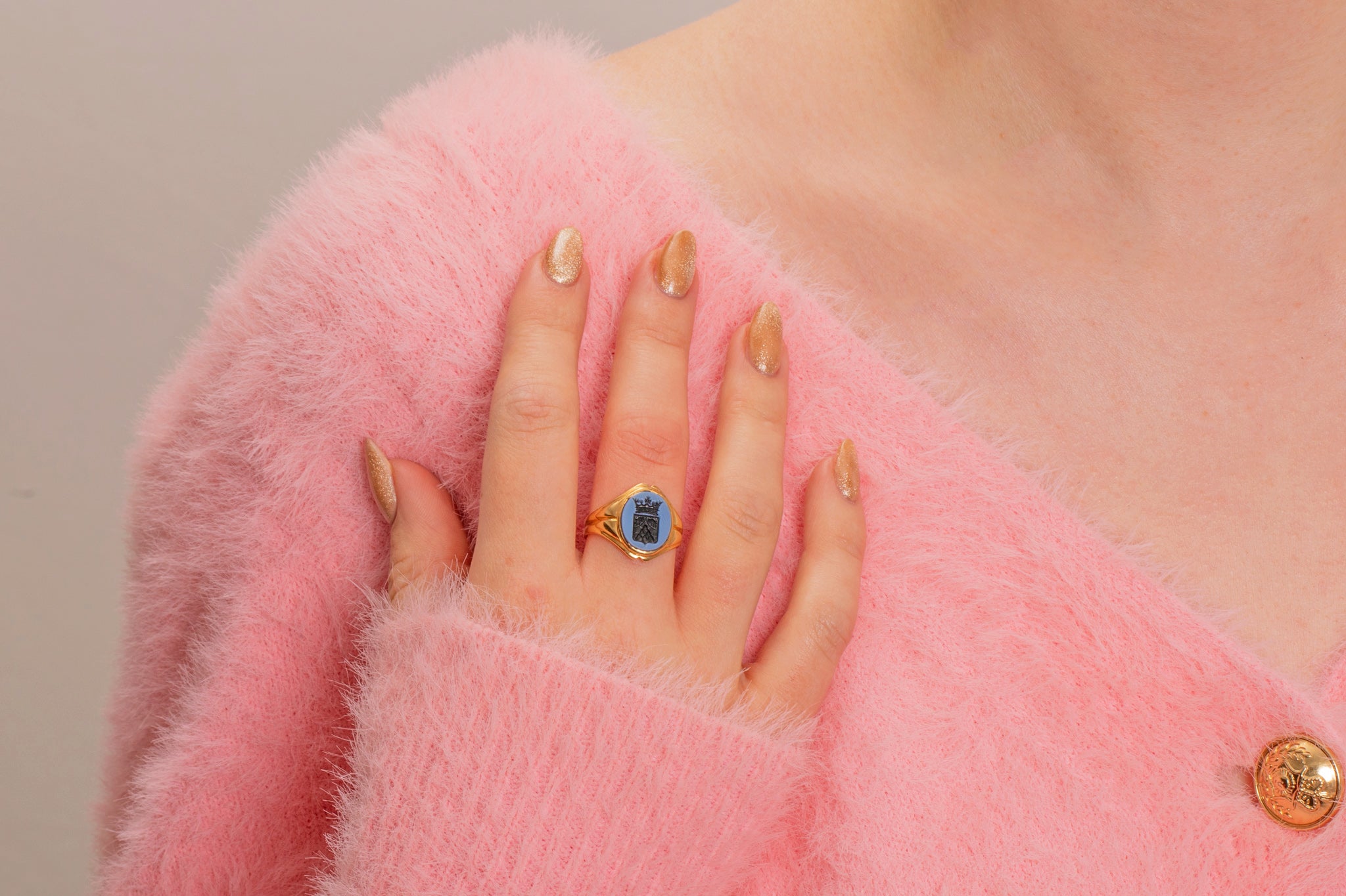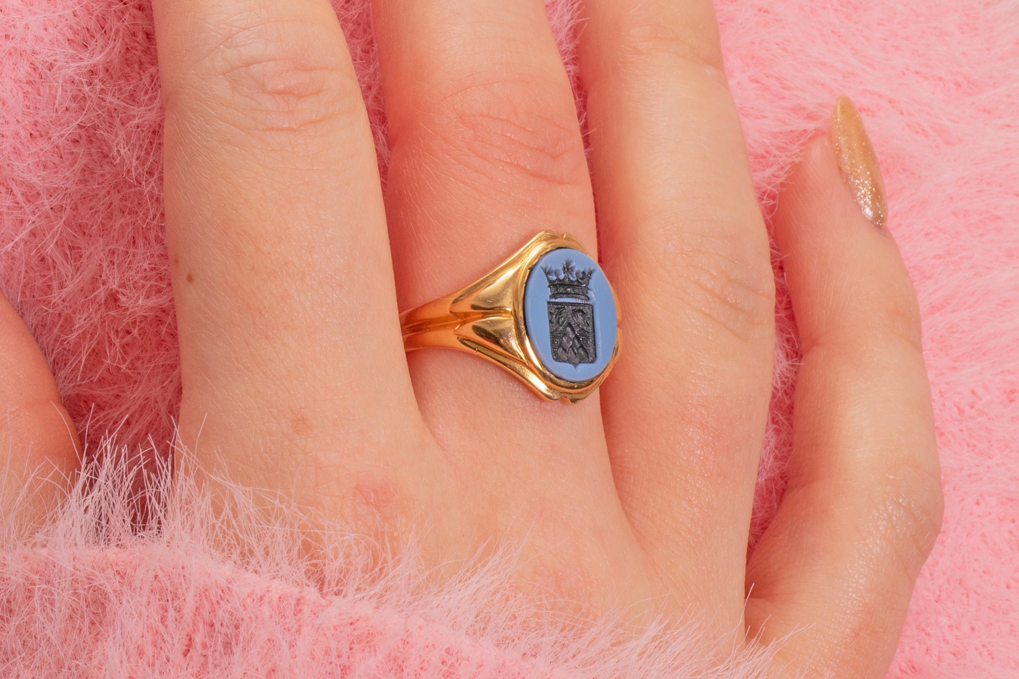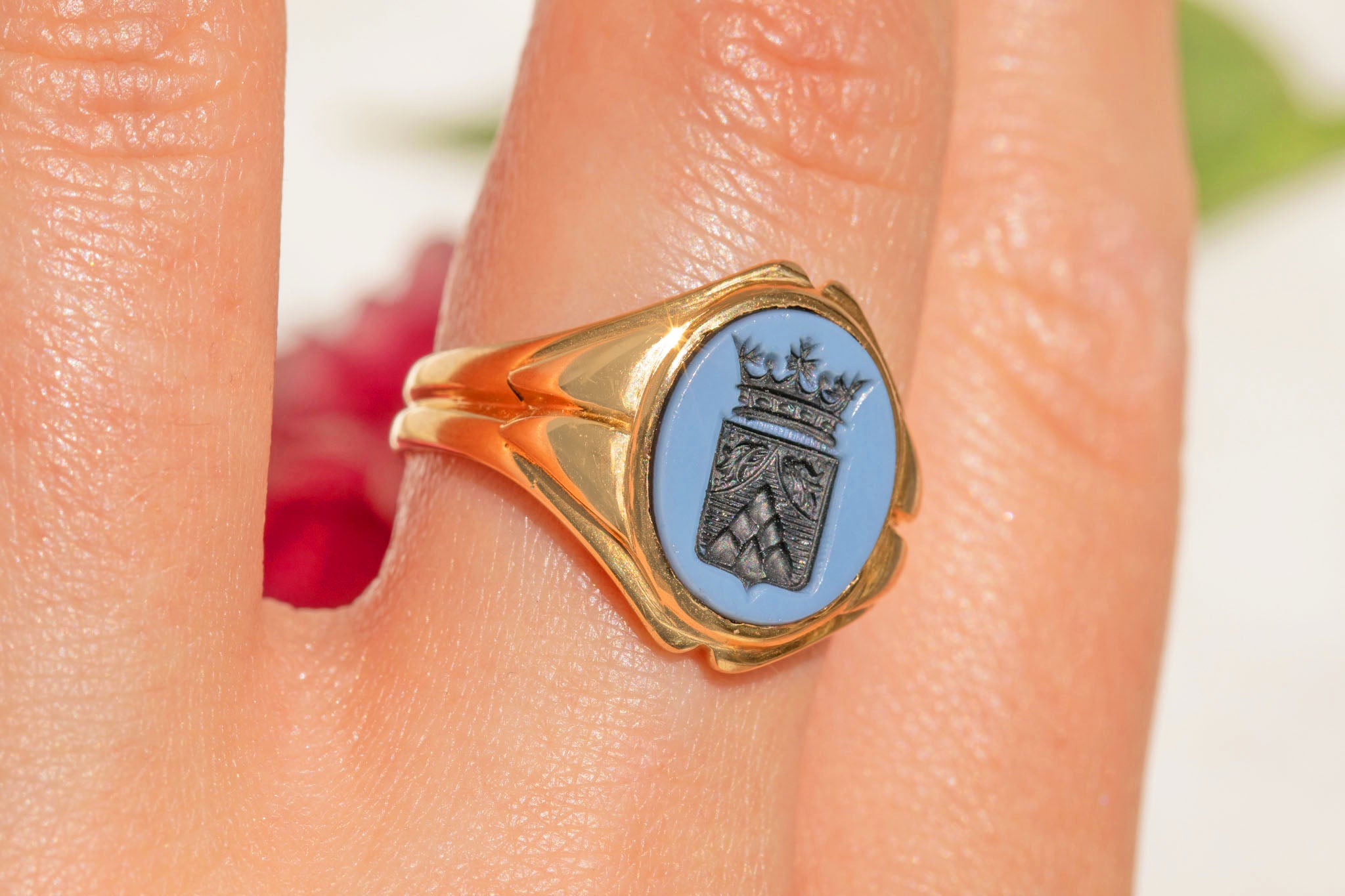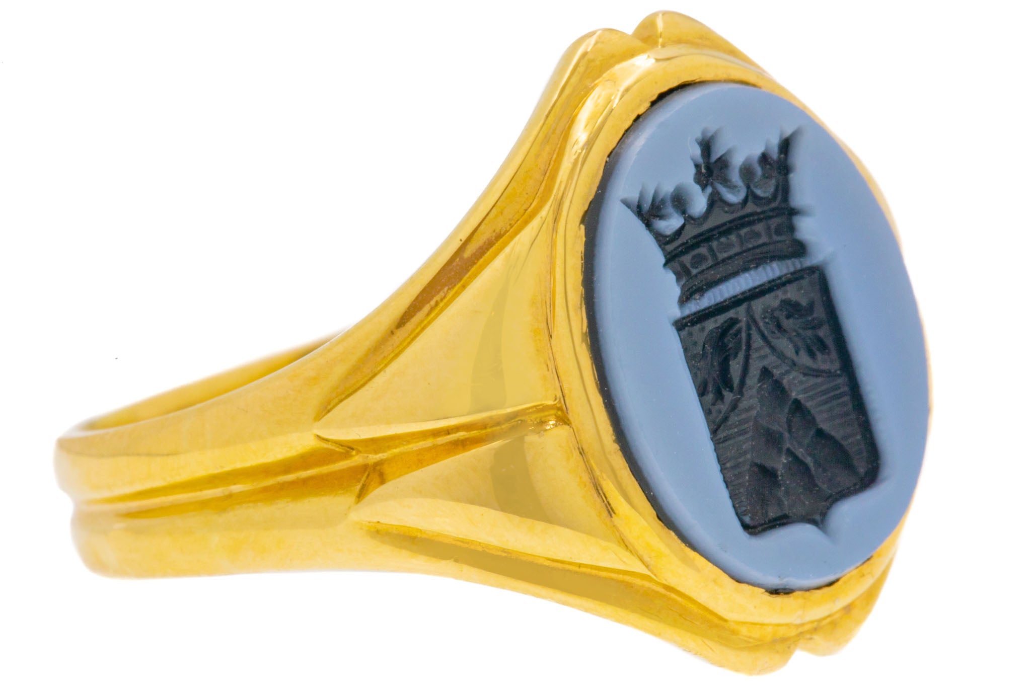 Her antique signet ring head is composed of a flint grey banded Agate with a royal heraldic intaglio carved into her hard stone, revealing her charcoal black colour underneath. We believe this would have been a family heirloom, with their family crest engraved into her Agate. A truly remarkable piece rich with history!
