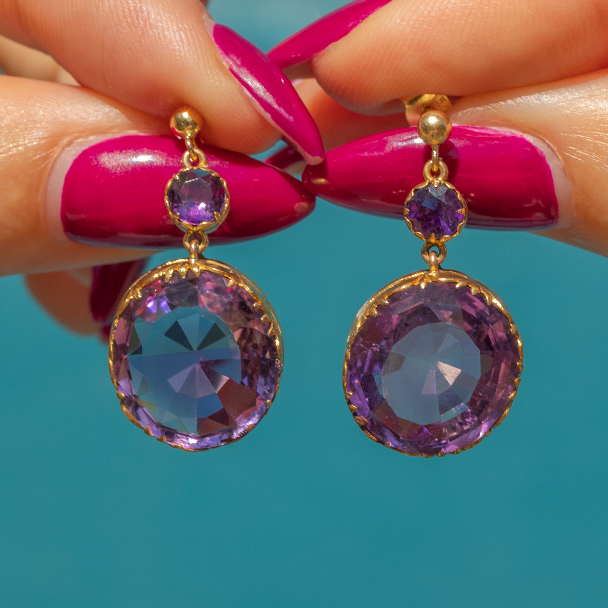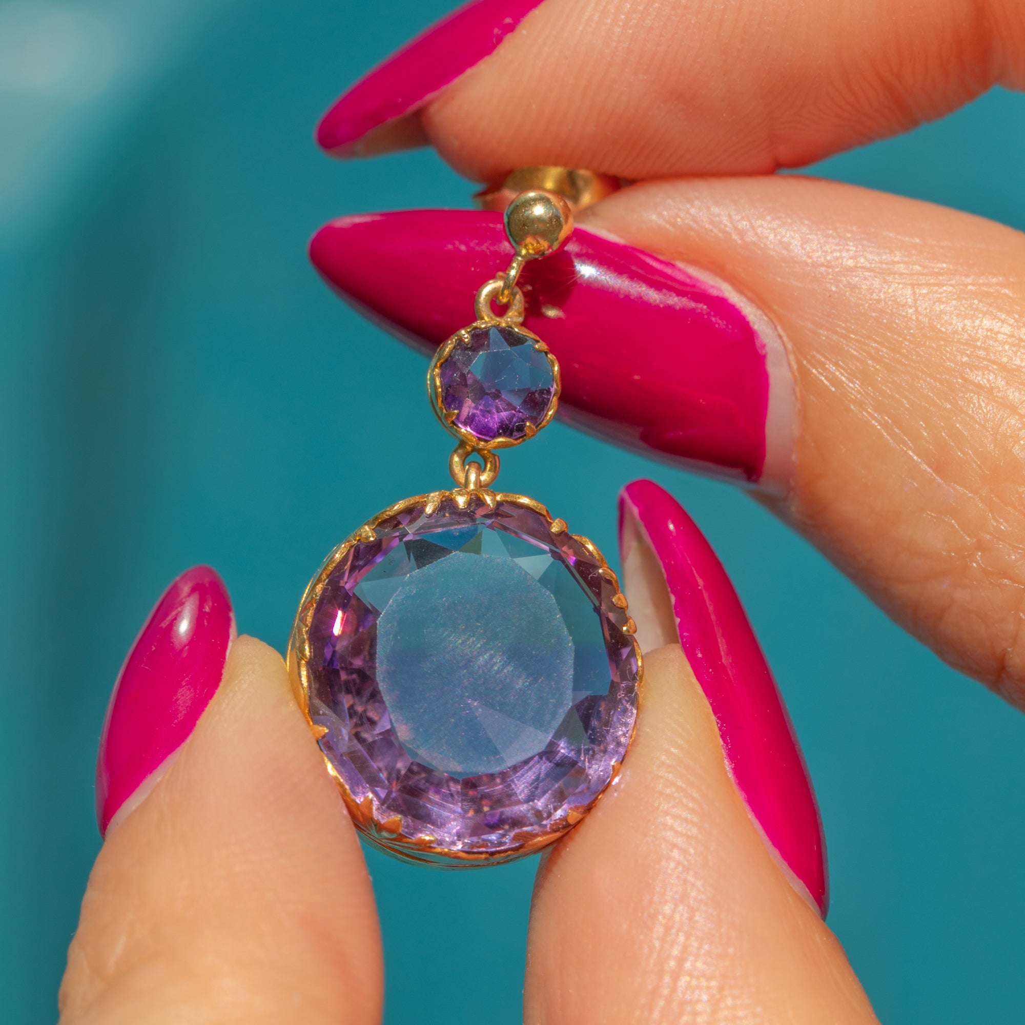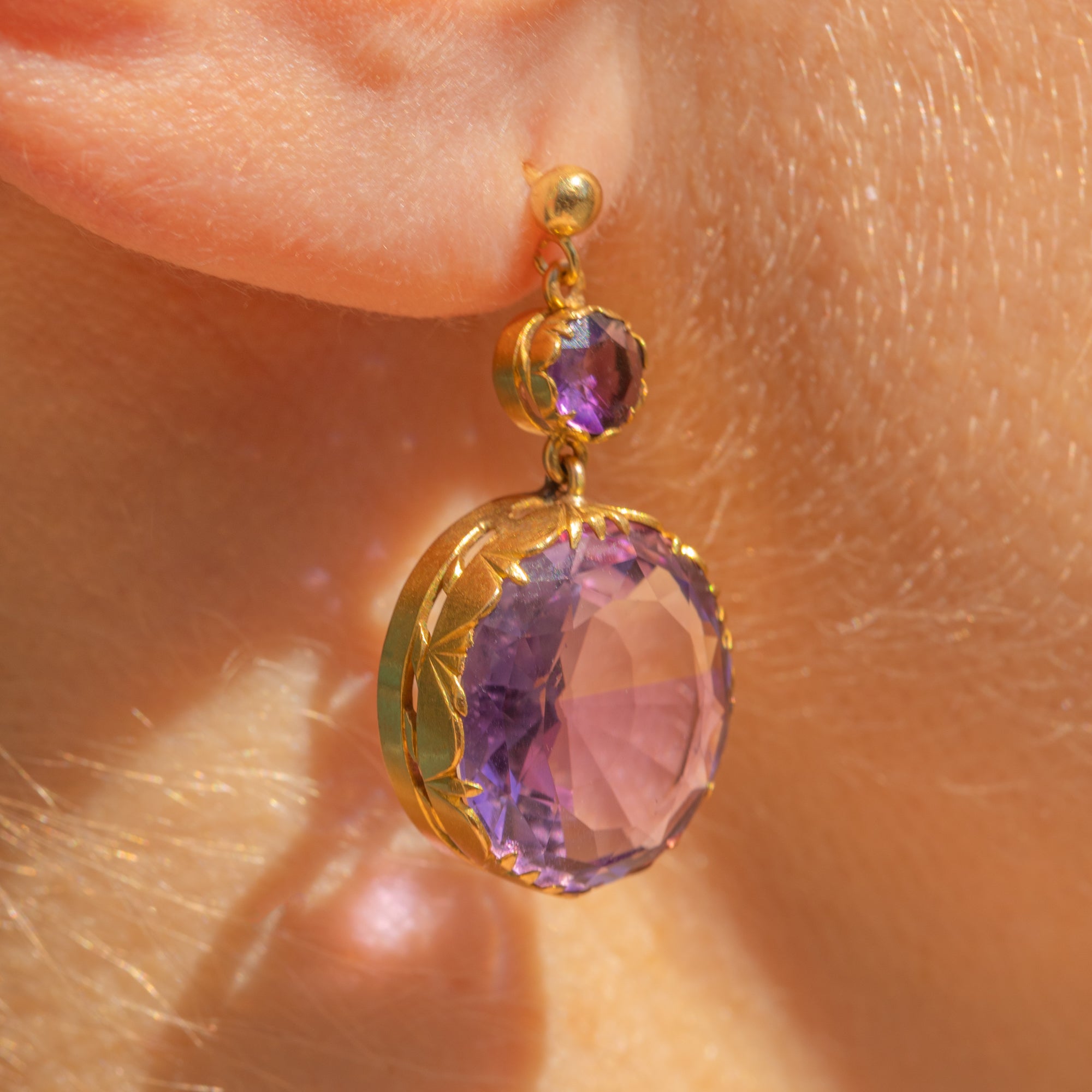 VERY GOOD-EXCELLENT: The Amethysts are gorgeous and secure in their settings, free from any chips or surface wear. The Gold is buttery with no signs of wear to the settings; you can be sure the gemstones are held securely all day long. There is some evidence of a previous conversion, from when they used to be part of a larger suite of jewellery, allowing you to enjoy them as this standout pair of earrings!
