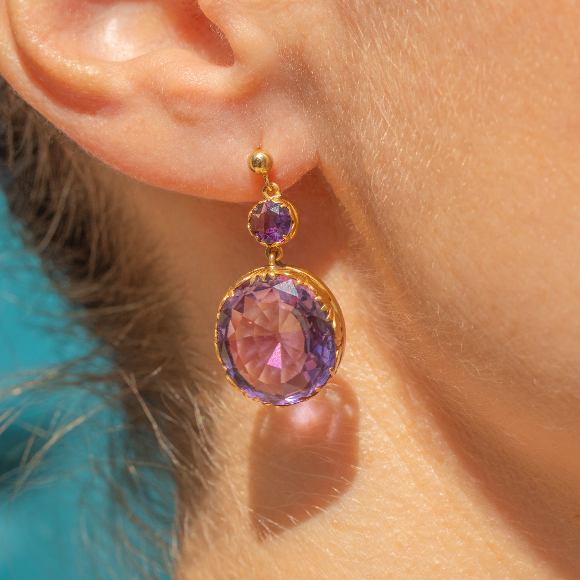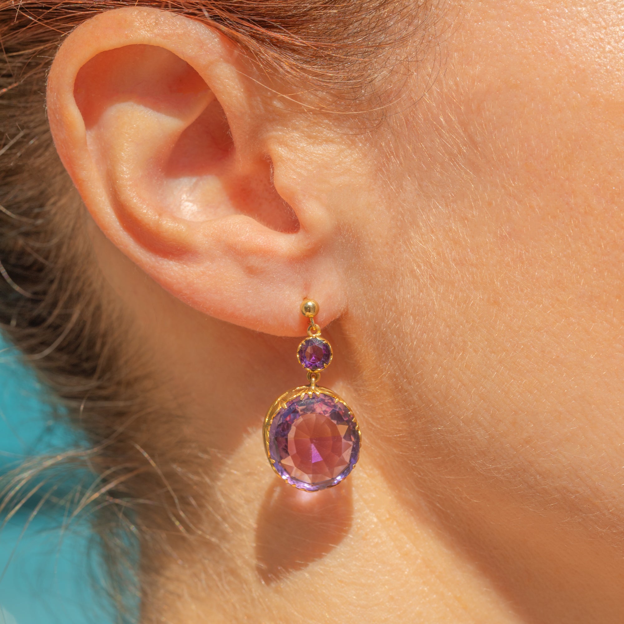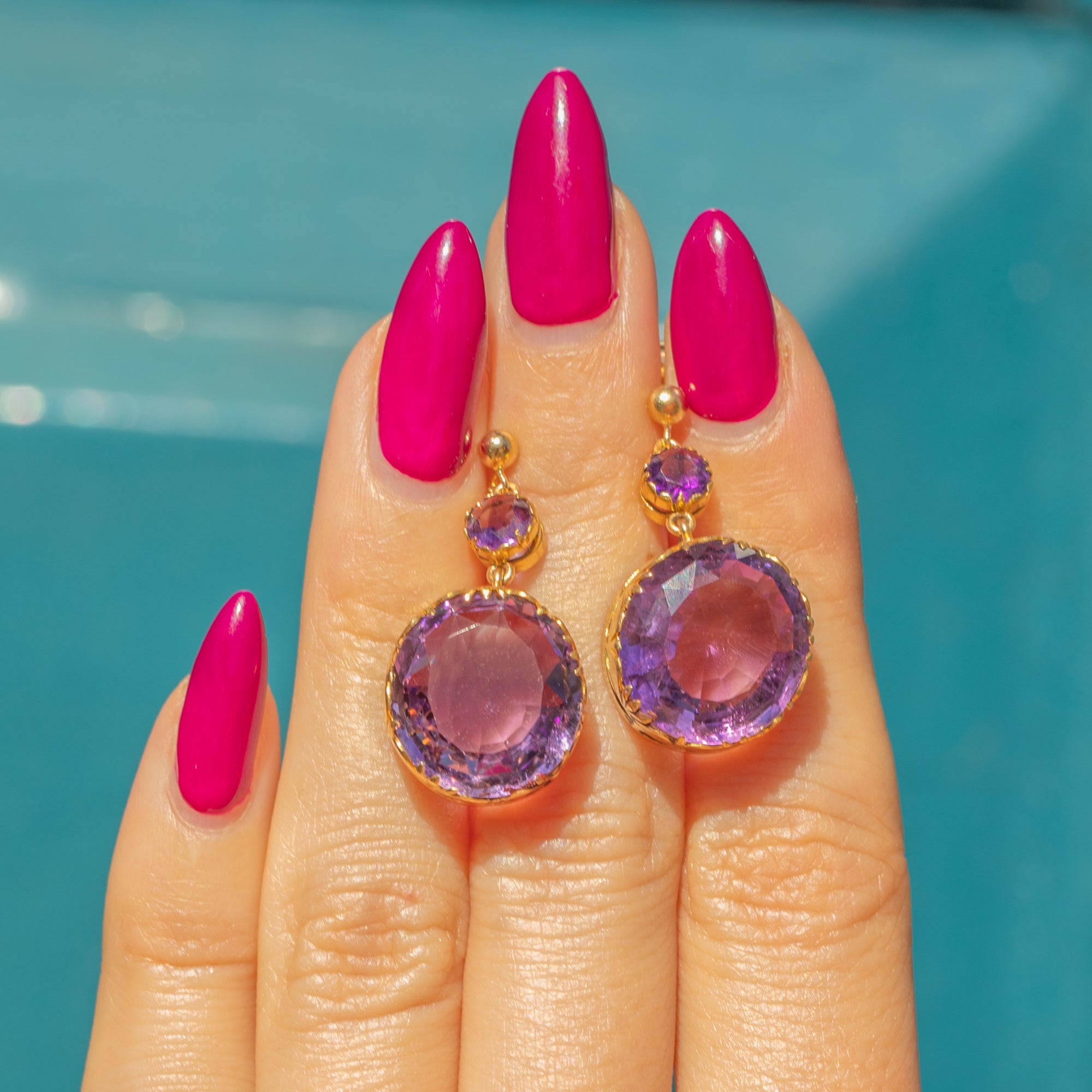 VERY GOOD-EXCELLENT: The Amethysts are gorgeous and secure in their settings, free from any chips or surface wear. The Gold is buttery with no signs of wear to the settings; you can be sure the gemstones are held securely all day long. There is some evidence of a previous conversion, from when they used to be part of a larger suite of jewellery, allowing you to enjoy them as this standout pair of earrings!