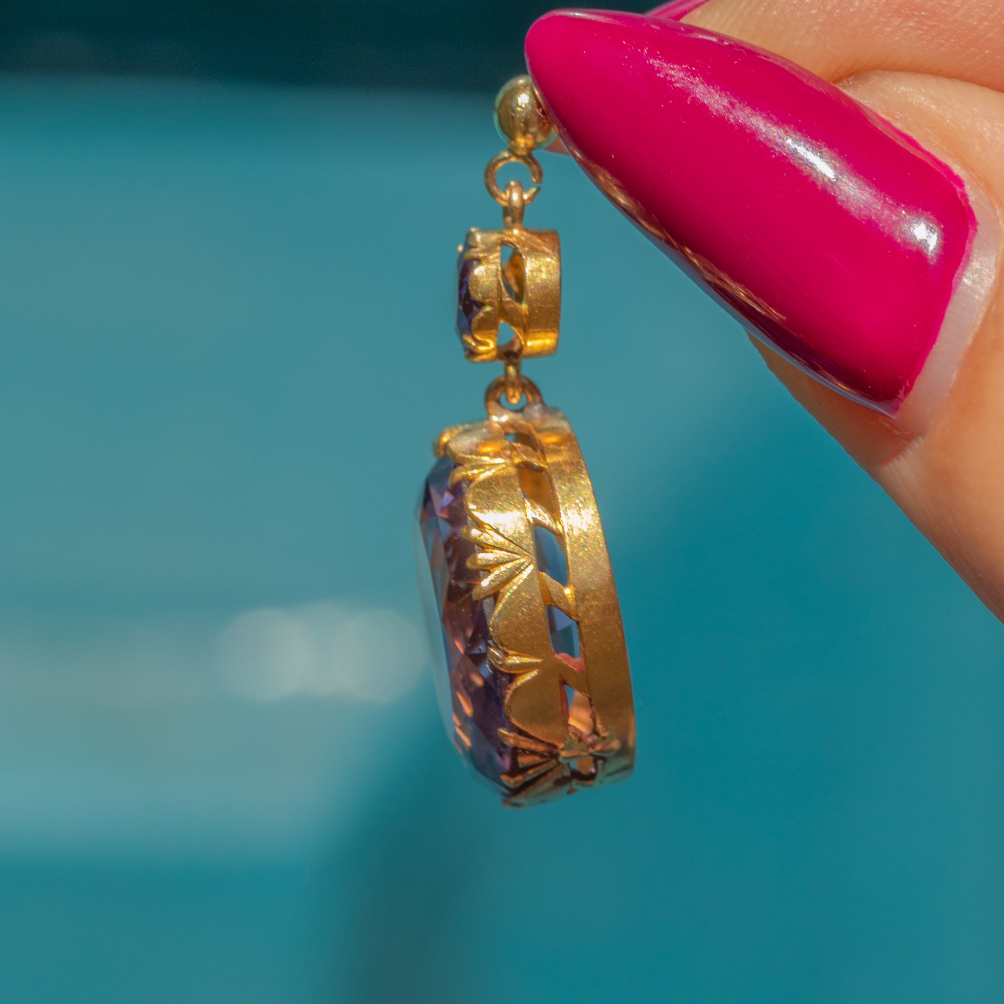 These antique Amethyst earrings are the perfect pair to add regal allure to any attire! Their settings are crafted from buttery 15ct Gold in a gorgeous ornamental drop style, each holding two lavender-hued Amethysts, boasting an incredible 11.36cts combined.