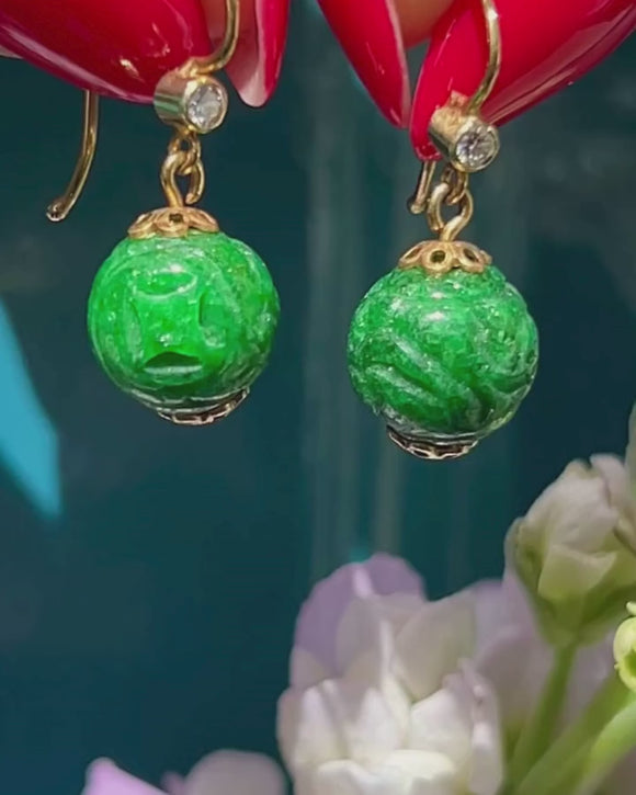 EXCELLENT. These antique 15ct Gold carved Jade & Diamond drop earrings are in excellent condition! The Jade spheres are immaculate with crisp carved details covering their entirety. The Diamonds are free from fleabites or abrasions and although the top of the setting on one of them is slightly worn, they are both secure within their bezels. With brightly saturated 15ct Gold and generously sized earring hooks, you can confidently wear these outstanding Art Deco earrings!