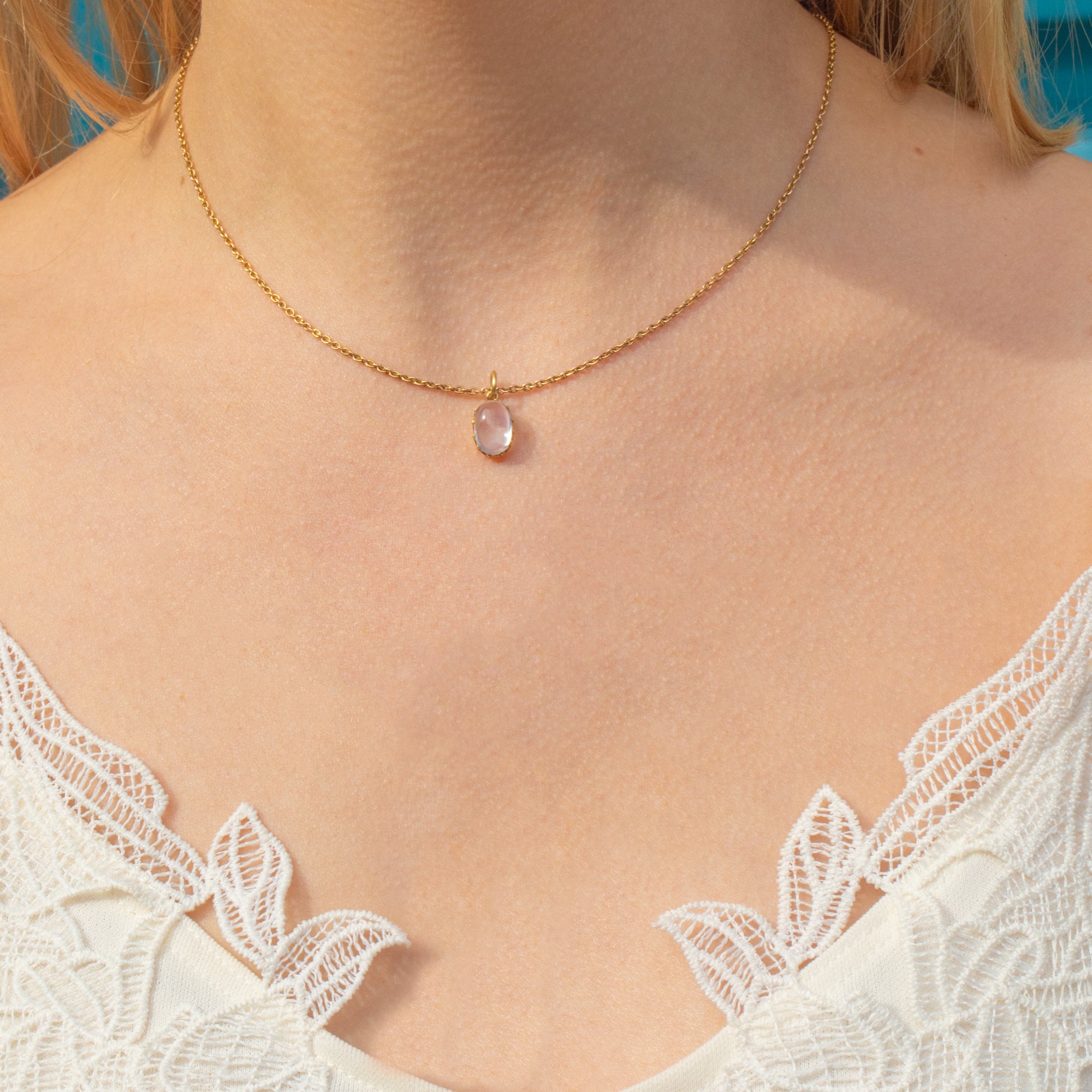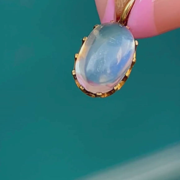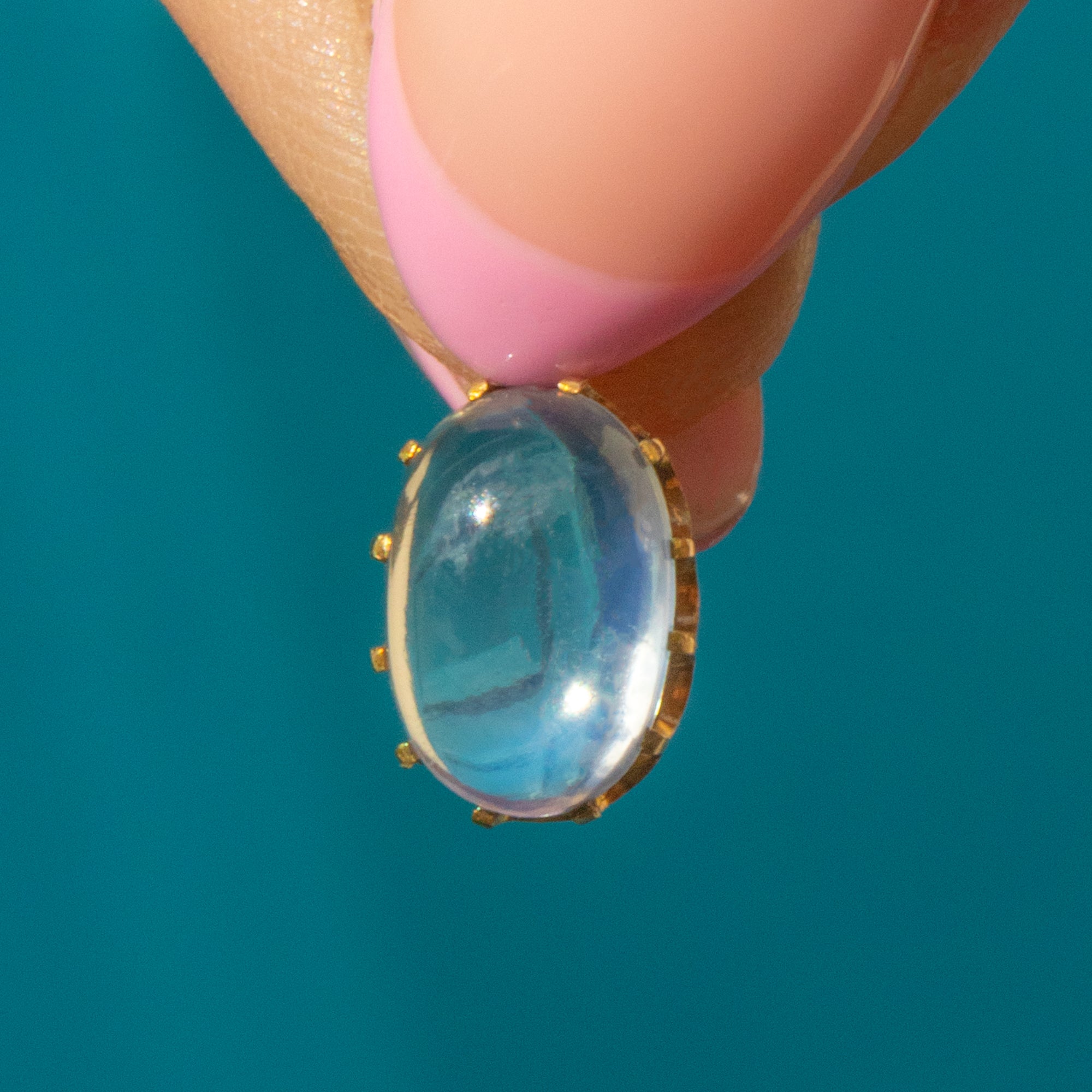 EXCELLENT. This antique 15ct Gold Ceylon Moonstone charm is in excellent condition! Her Moonstone cabochon is secure within its claw settings, with a lustrous milky blue schiller, she is a testament to Mother Nature! The Gold has held a strong structure and an admirable gloss throughout. Complete with a soldered jump ring, she is ready to adorn your neck the moment you open your pink Lillicoco box!
