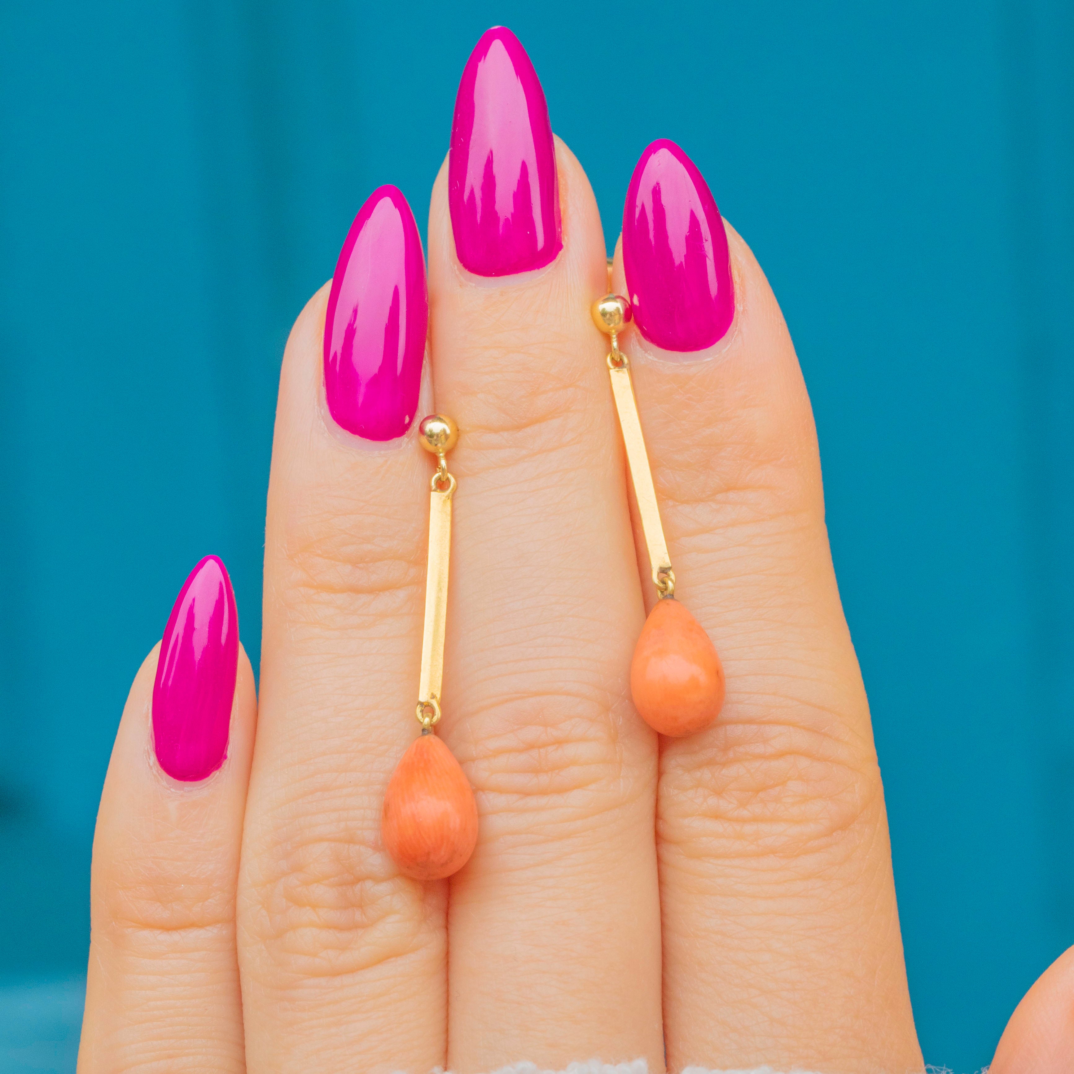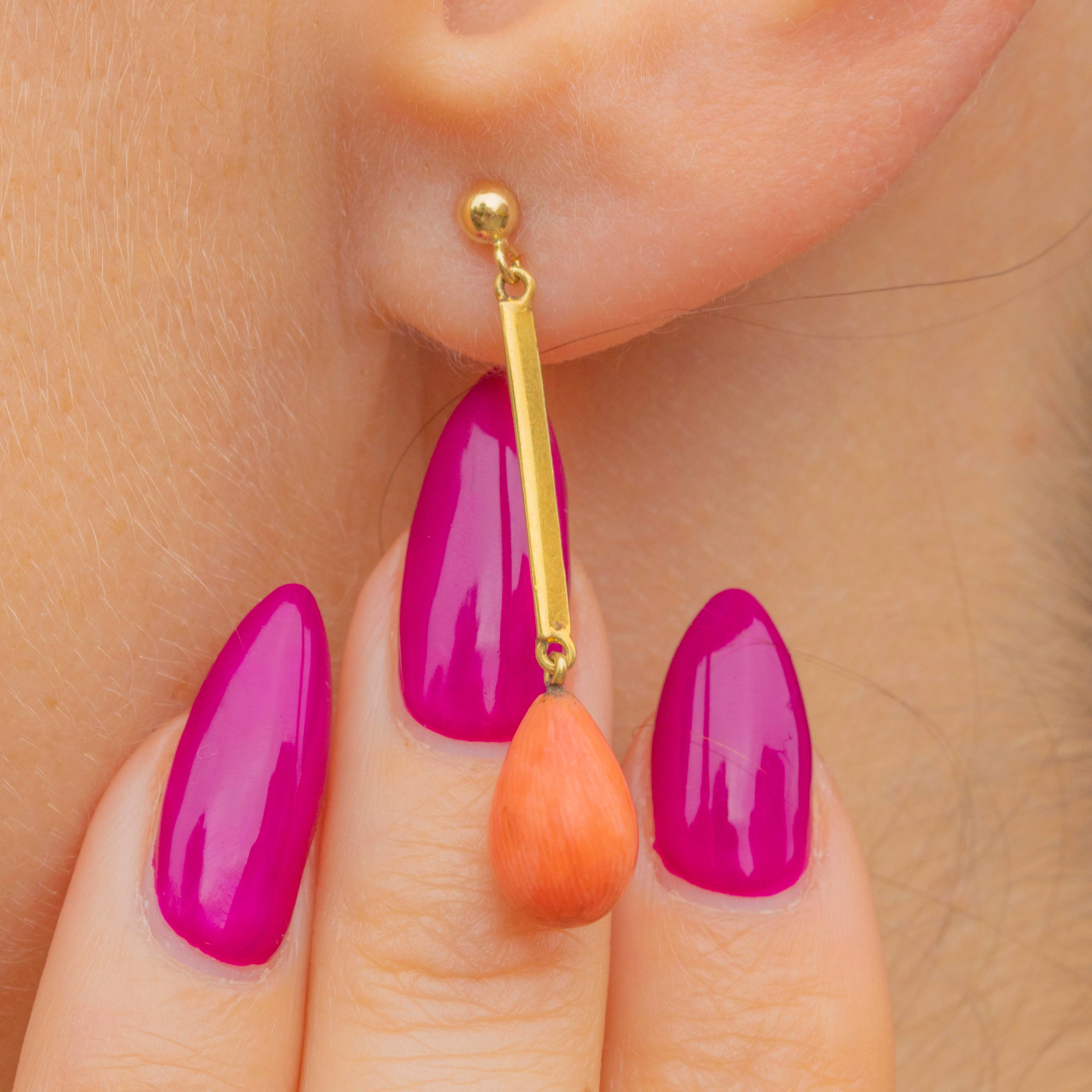 The natural Coral drops have a lovely sunset orange hue, perfectly complemented by the glossy 15ct Gold settings and dance with movement as they suspend from your lobes.