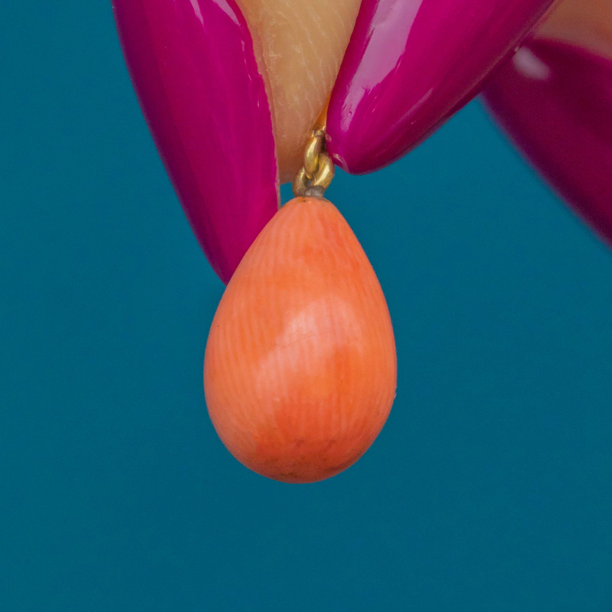 These antique drop earrings are complete with a smooth droplet of peachy pink Coral, each suspended from an elegant 15ct Gold knife drop bar.