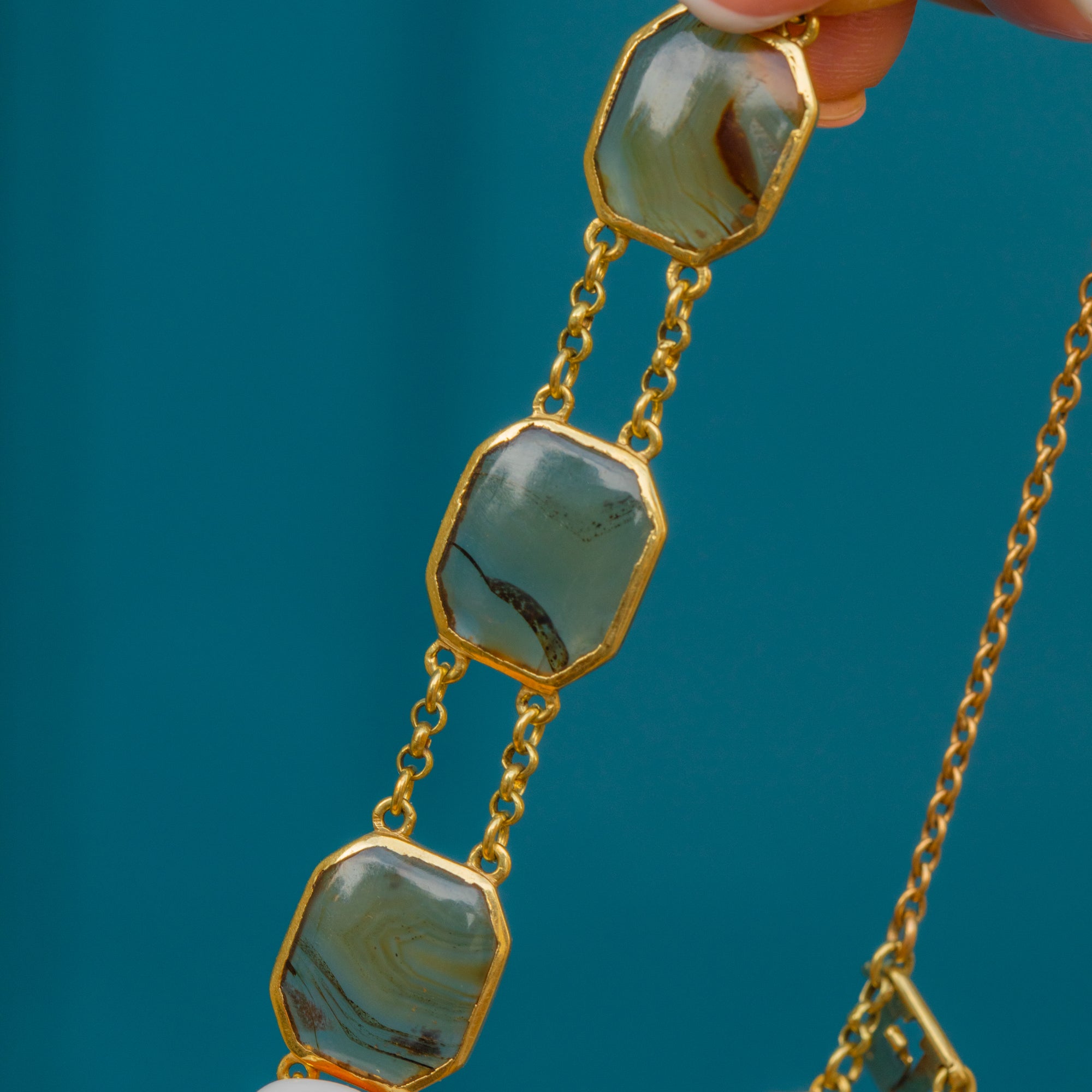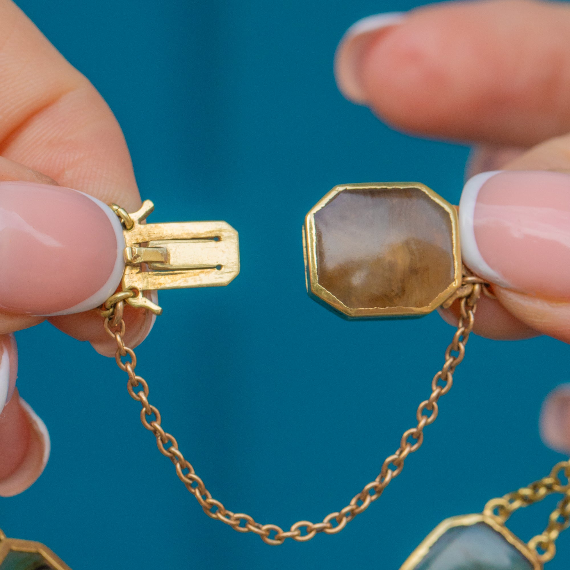 MATERIALS: Tests as 15ct Gold bezel settings, 18ct Gold chain links, 9ct Gold safety chain, natural Agate.
