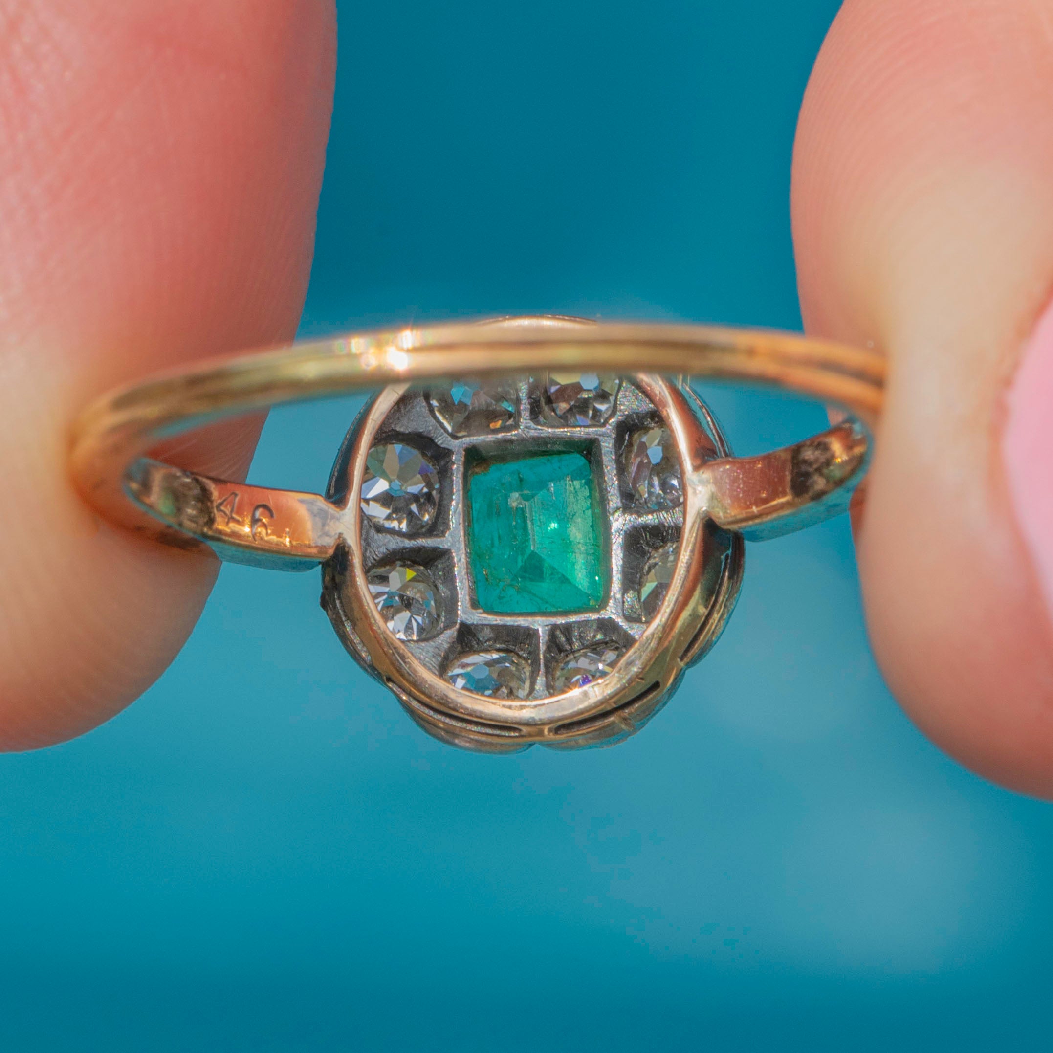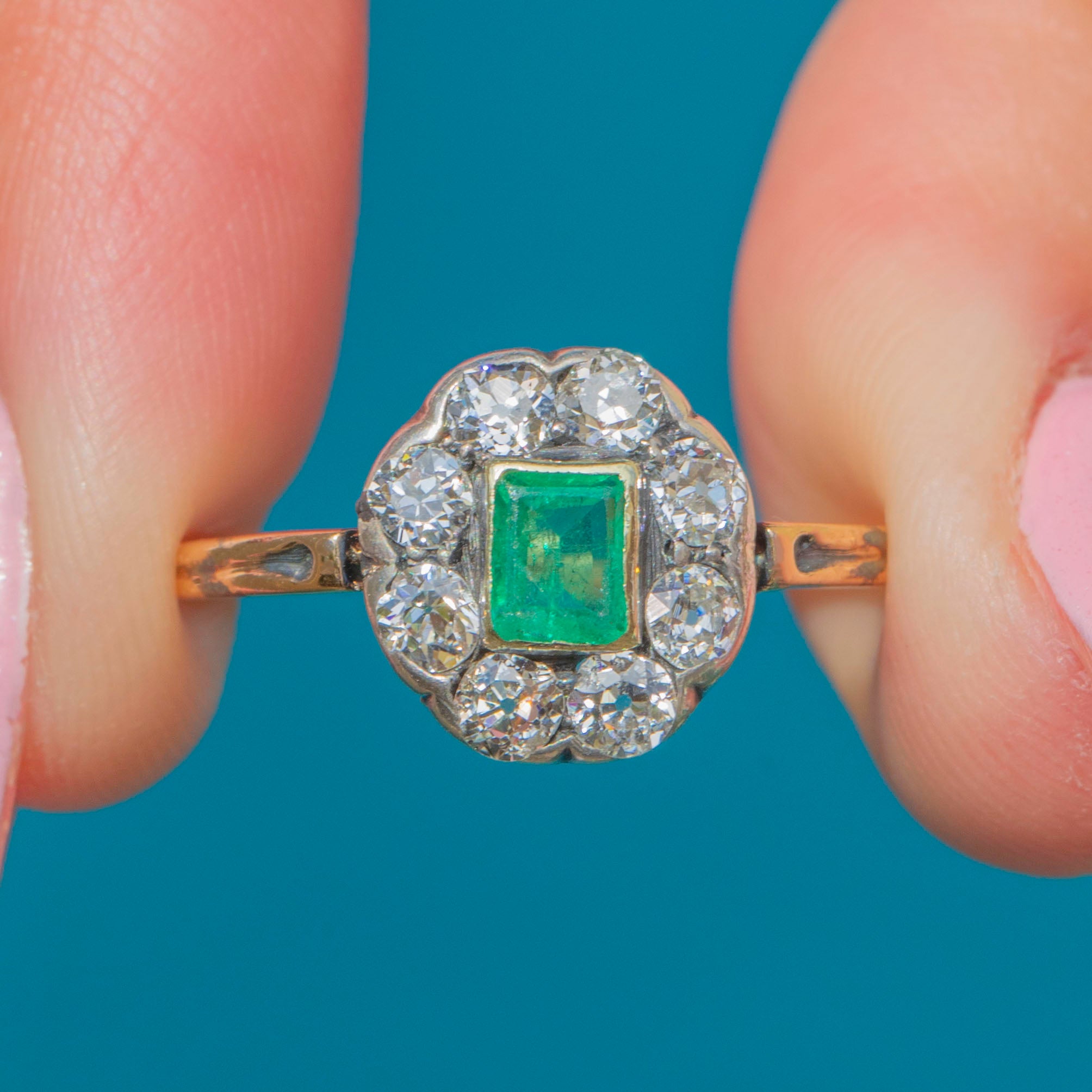 VERY GOOD: This antique 15ct Gold Emerald Diamond cluster ring is in very good condition. The gemstones are all present, with only the Emerald showing minor surface wear, commensurate with age. The Emerald is secure within its 15ct Gold bezel, and the Diamonds are securely set within lustrous Silver. Although the Gold shows mild age-related wear, it is still buttery, and the band has held its form well, providing secure wear. Endlessly pleasing to look at, this Victorian ring will take pride of place in your antique jewellery collection!
