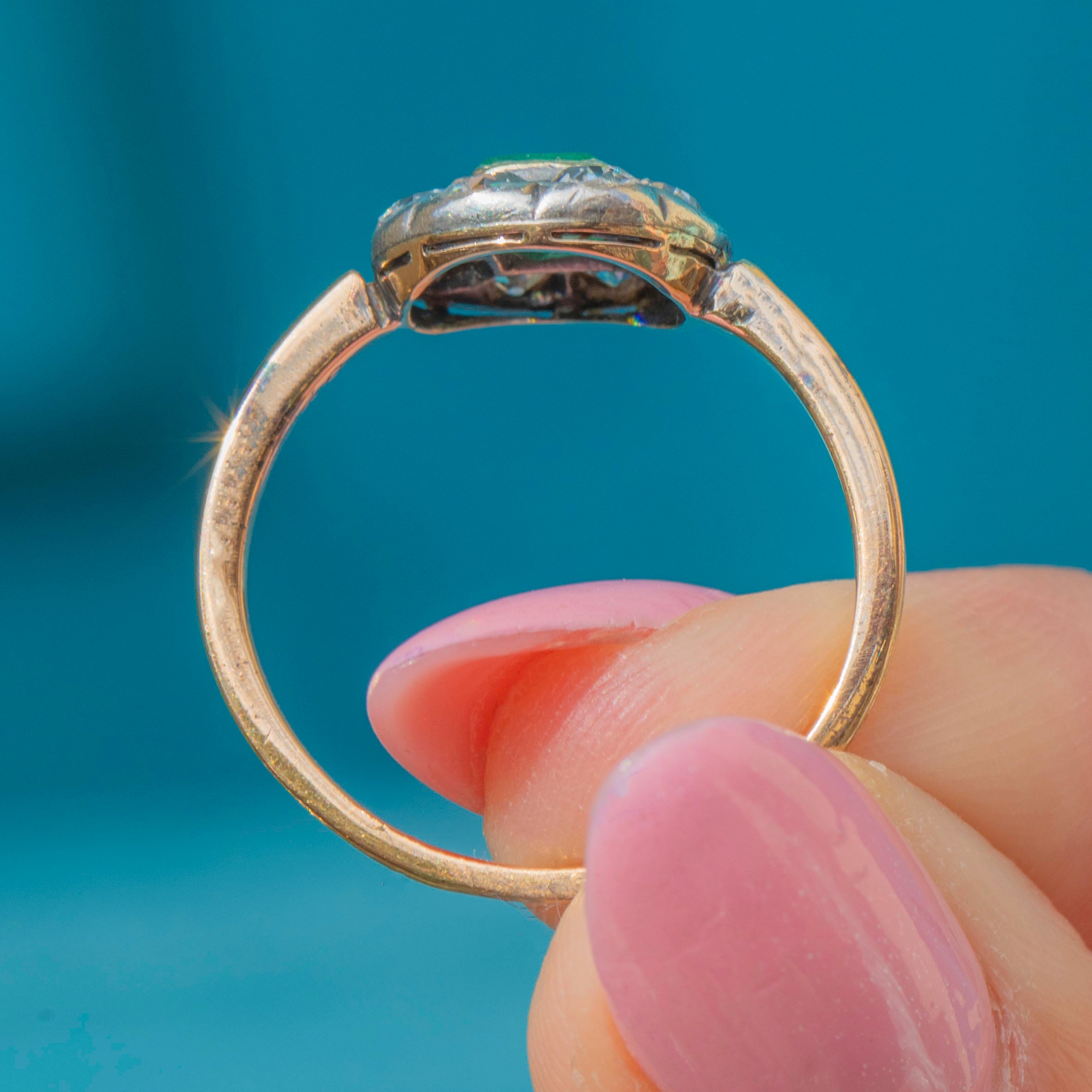 The impressive gemstones are arranged into an eye-catching floral cluster, providing wonderful finger coverage. Held round your finger by a luxurious 15ct Gold band, this Victorian Emerald Diamond exudes antique charm from its every curve.