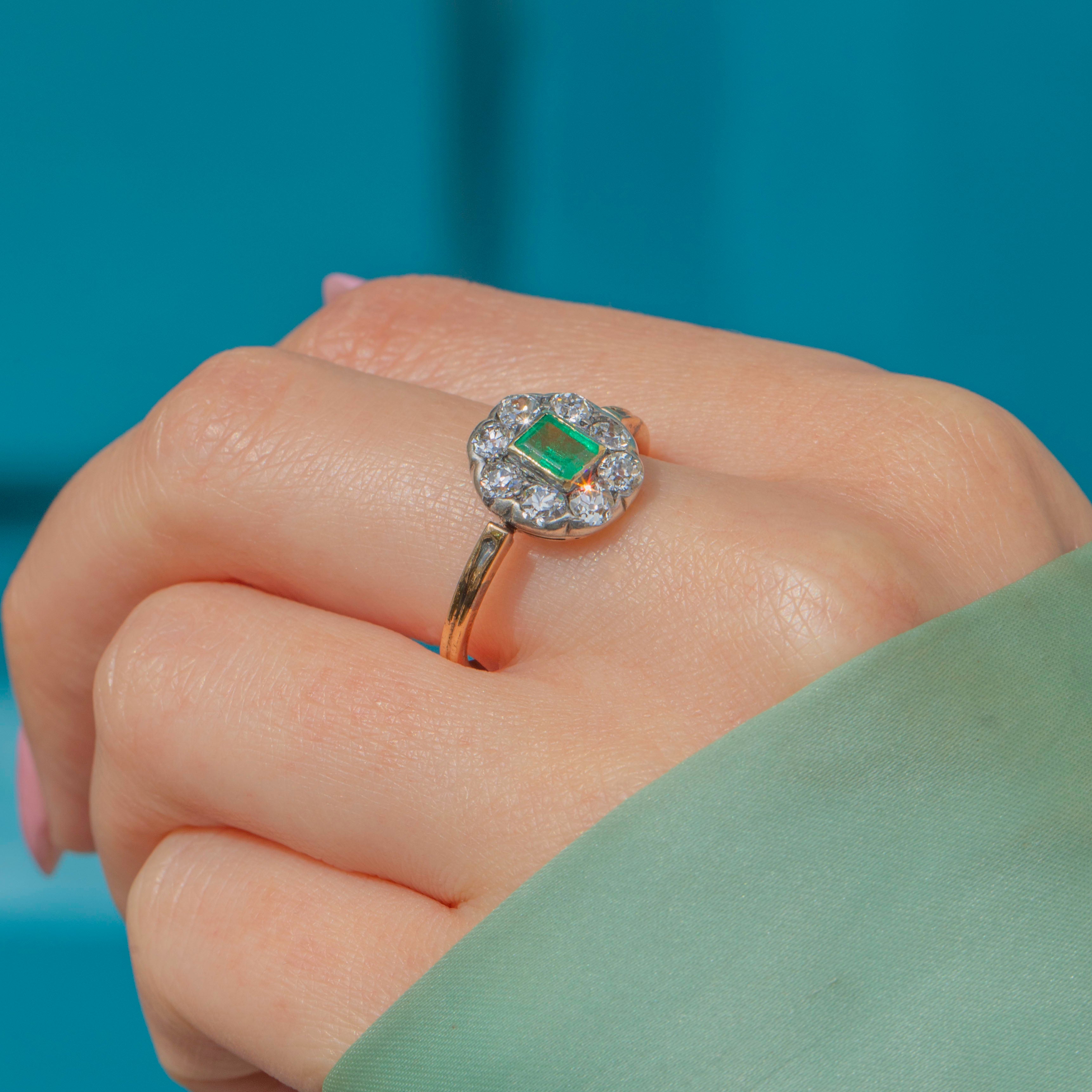 Antique 15ct Gold Emerald Diamond Cluster Ring, 0.65ct Emerald