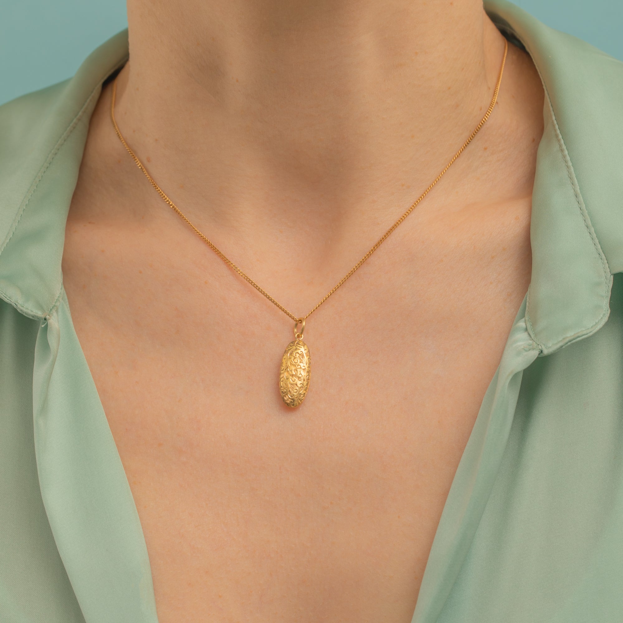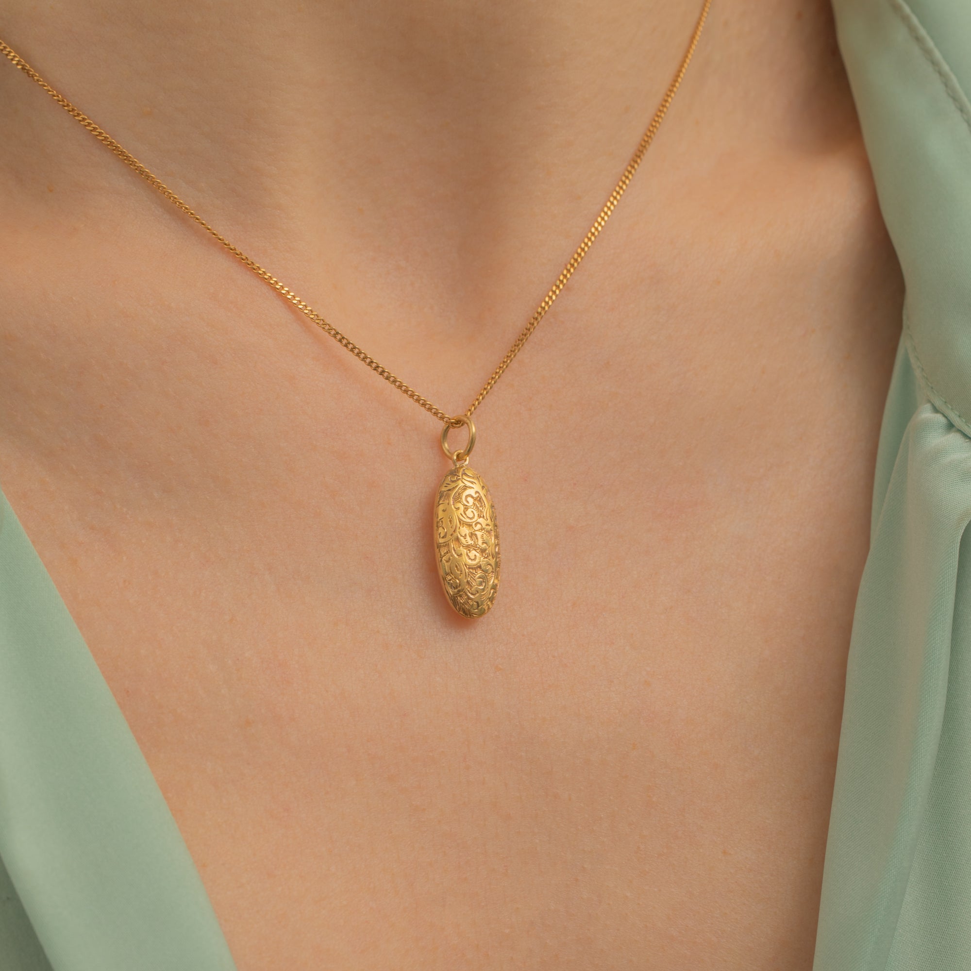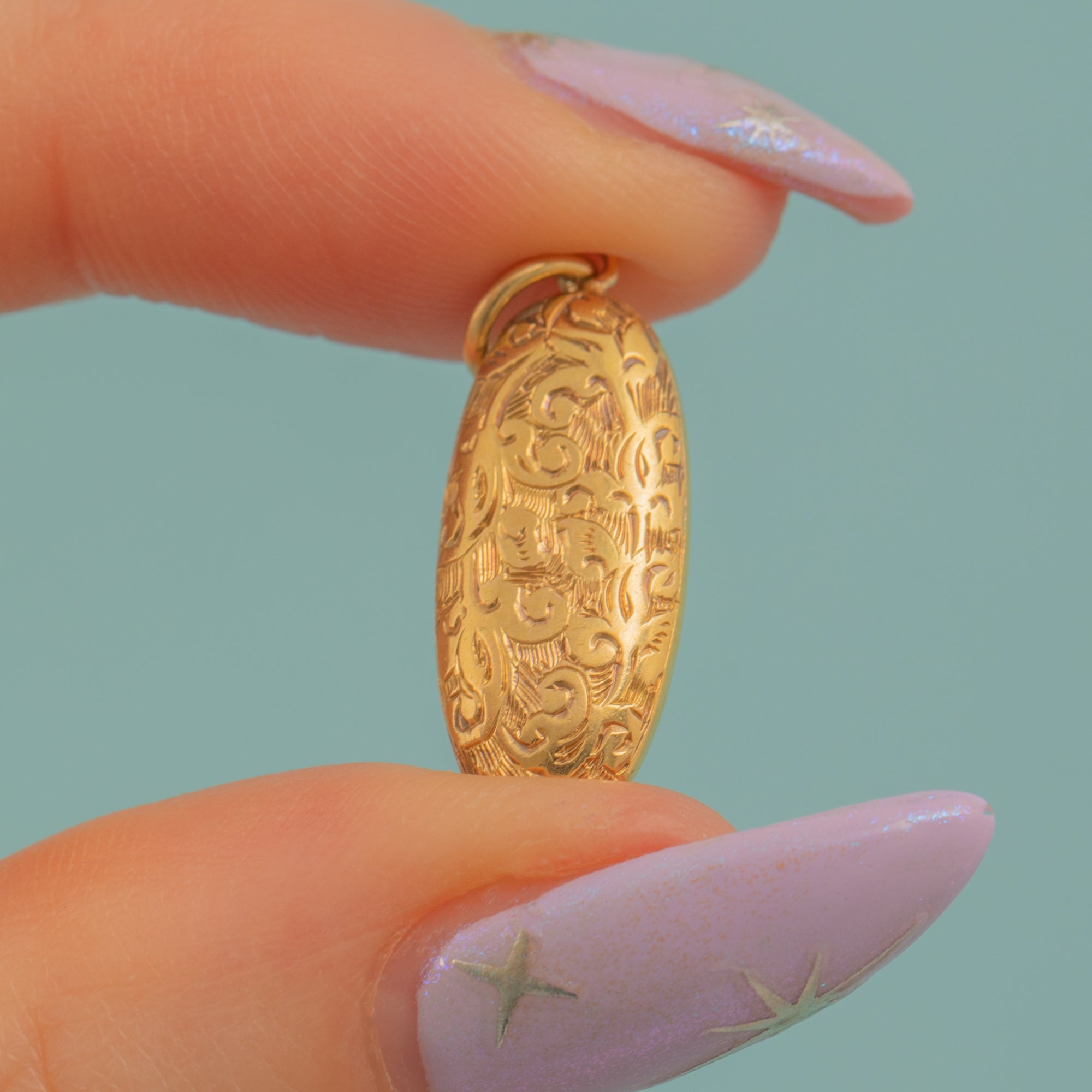 Add some effortless luxury to your outfit with this delightful antique 15ct Gold engraved lozenge pendant! Crafted from rare 15ct Gold, this Victorian charm has a bright saturation and displays ornate acanthus details across the front.