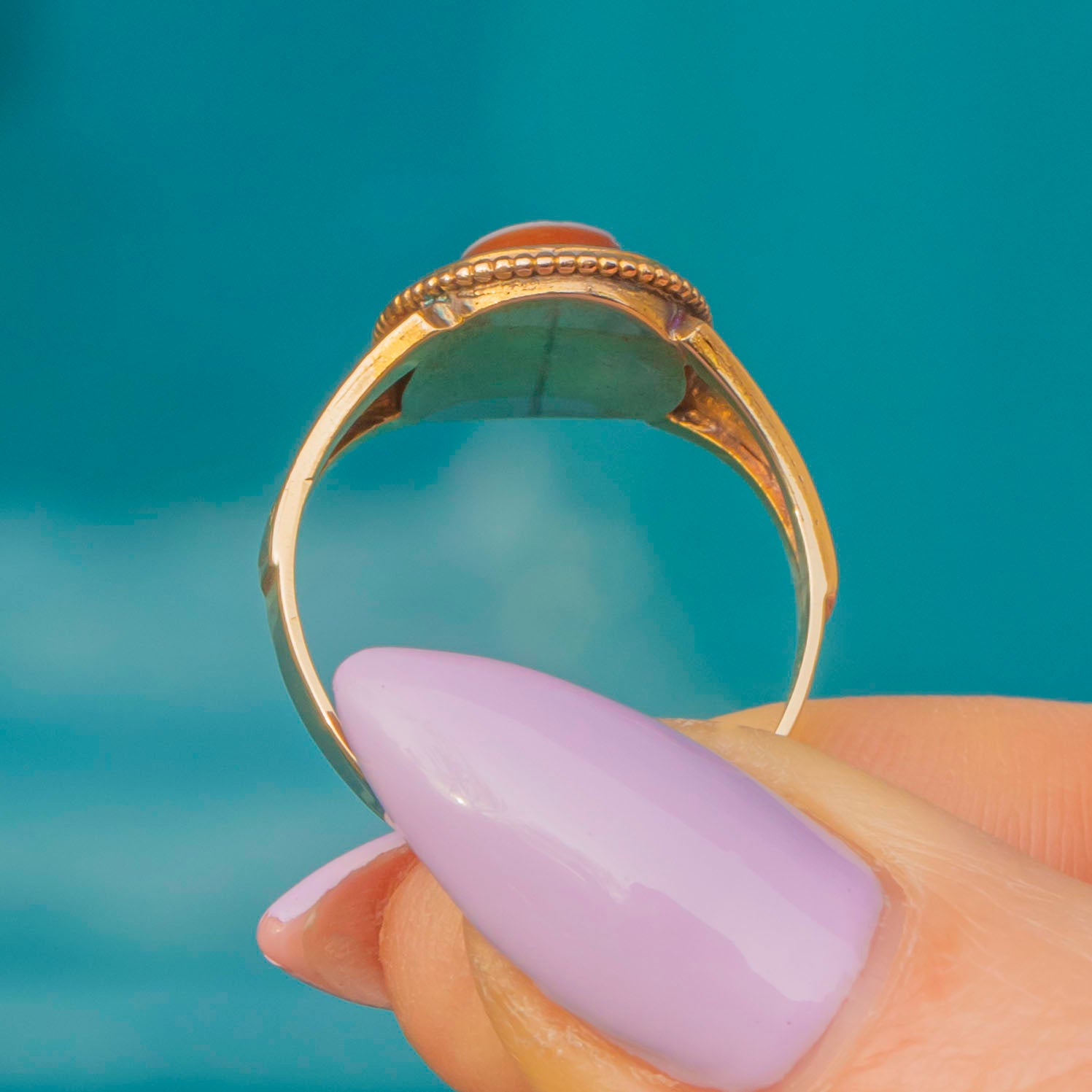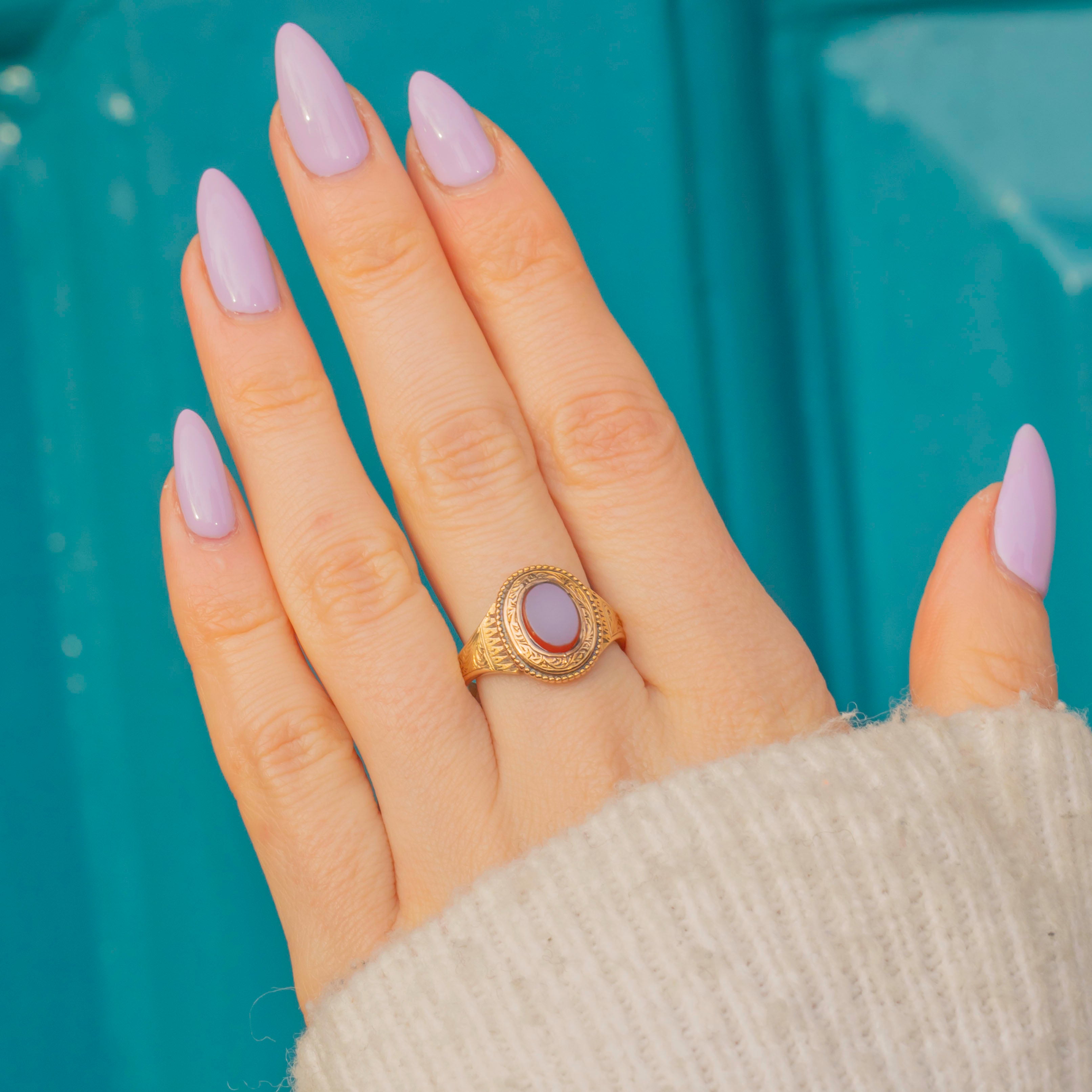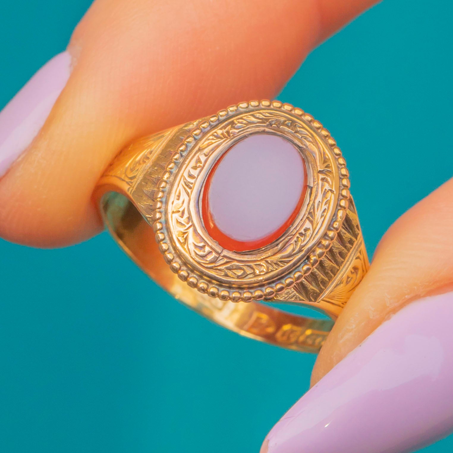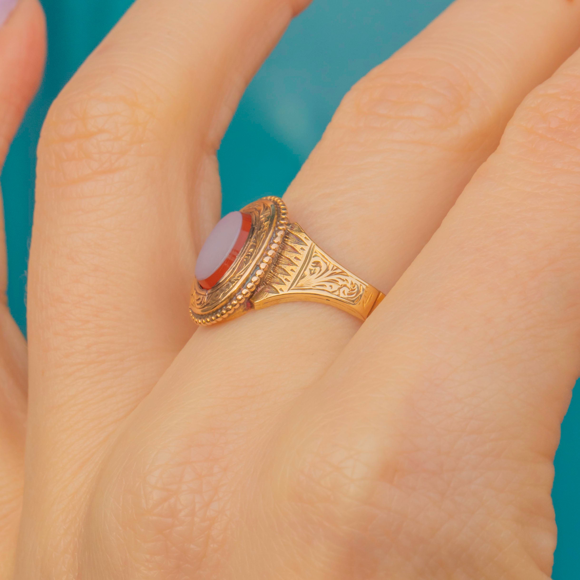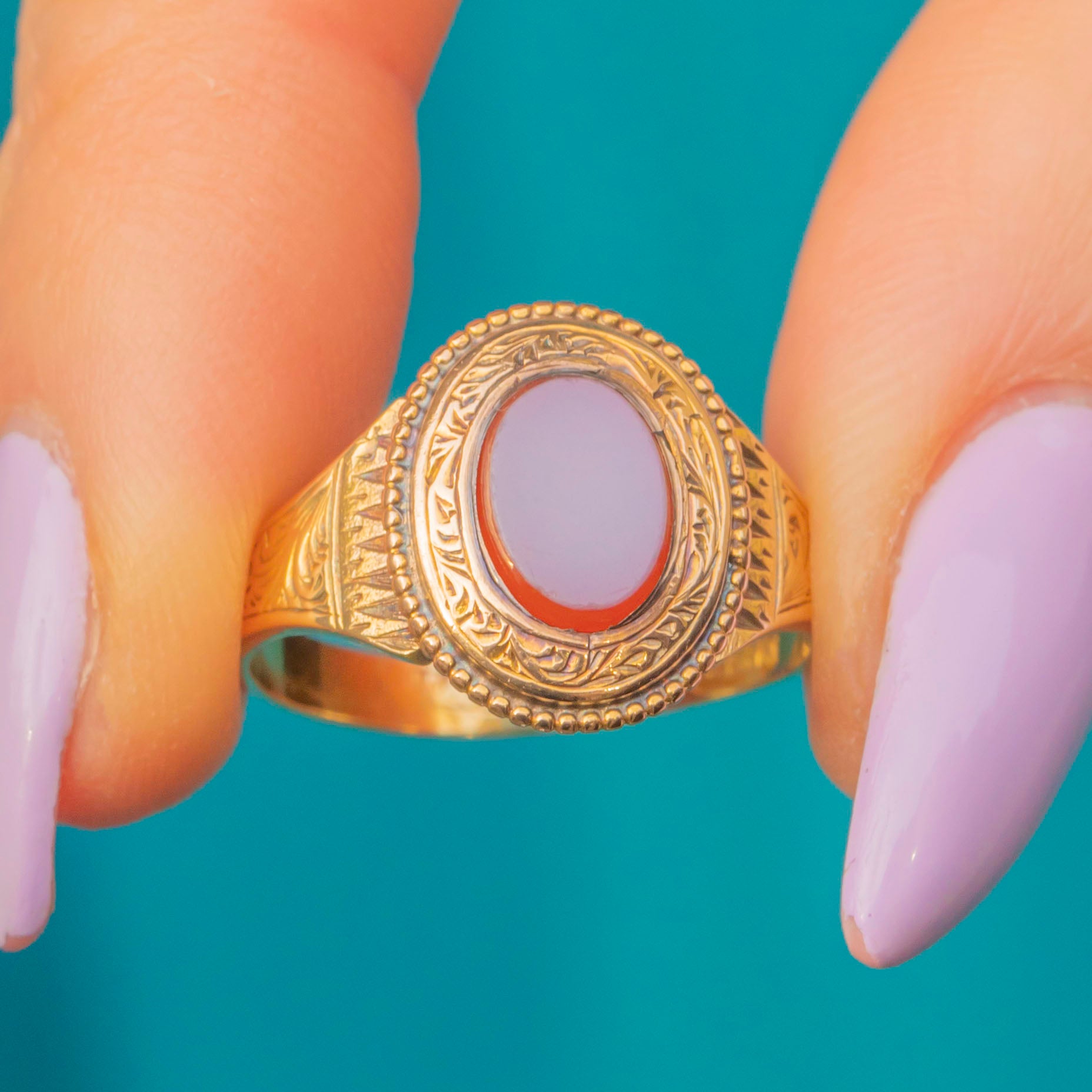 We adore this antique 15ct Gold engraved Sardonyx signet ring! Crafted from rare 15ct Gold, this Victorian ring boasts intricate details that will span the width of your finger. The Sardonyx stone has been cut to perfection, with a lilac top and a rich orange base providing wonderful contrast, and is framed by exquisite engravings.