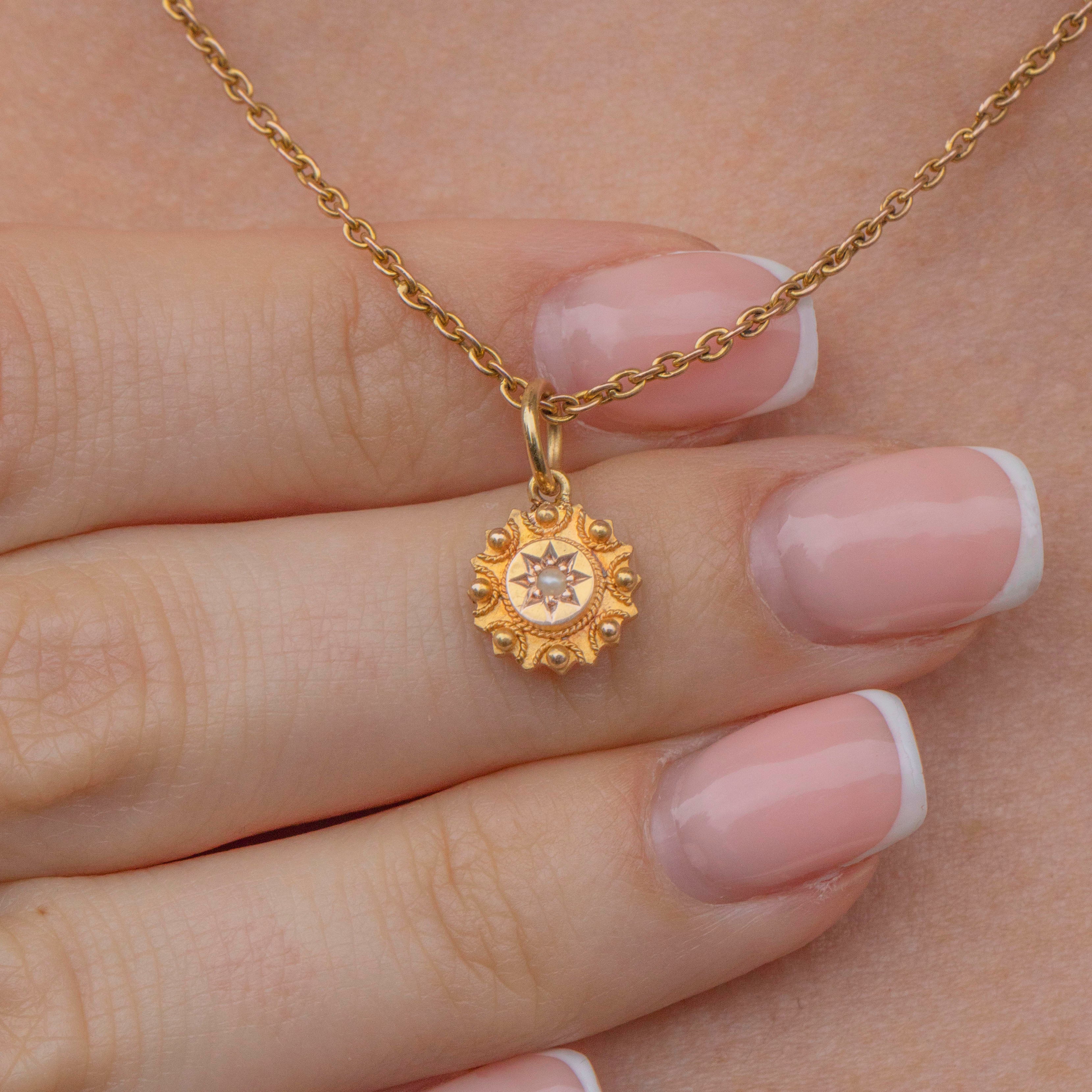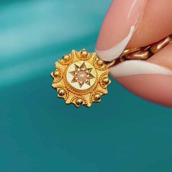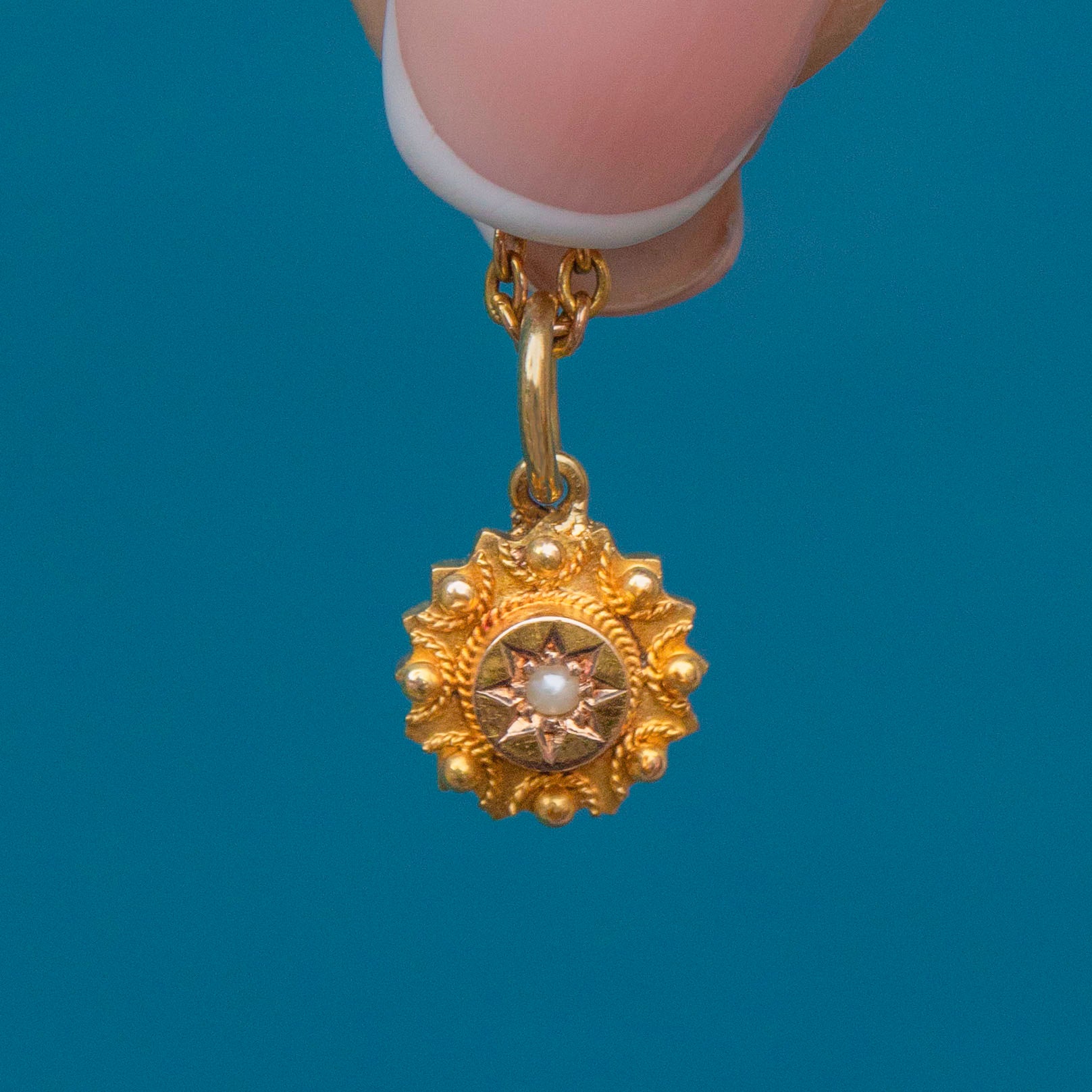 Add a touch of celestial charm to your outfit with this antique 15ct Gold Etruscan Pearl charm! Crafted from solid 15ct Gold, this antique pendant showcases a silky Pearl at her centre surrounded by intricate details for a refined finish; this Etruscan beauty will feel right at home in your jewellery box!
