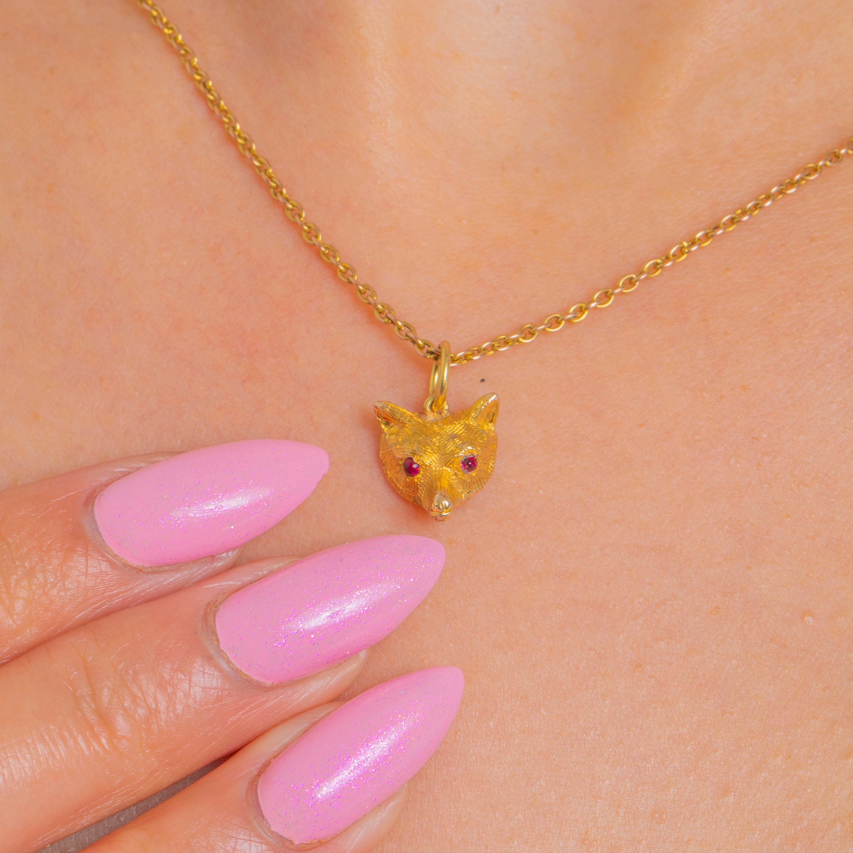 A charming Victorian fox head rendered in rich 15ct Gold, brimming with lifelike texture and personality. The fur is finely detailed, while a pair of tiny Ruby cabochon eyes add a subtle crimson sparkle and a wonderfully foxy glint.