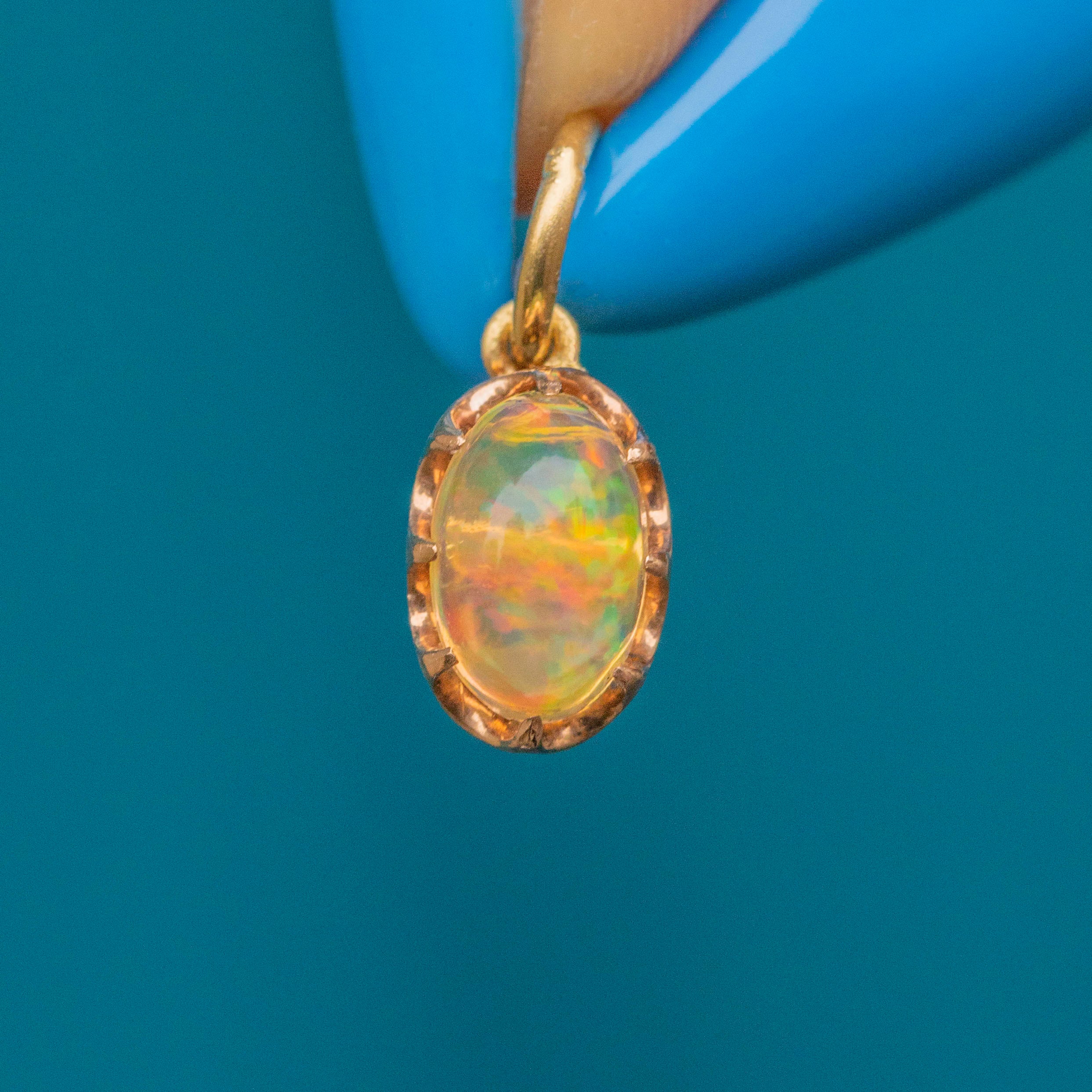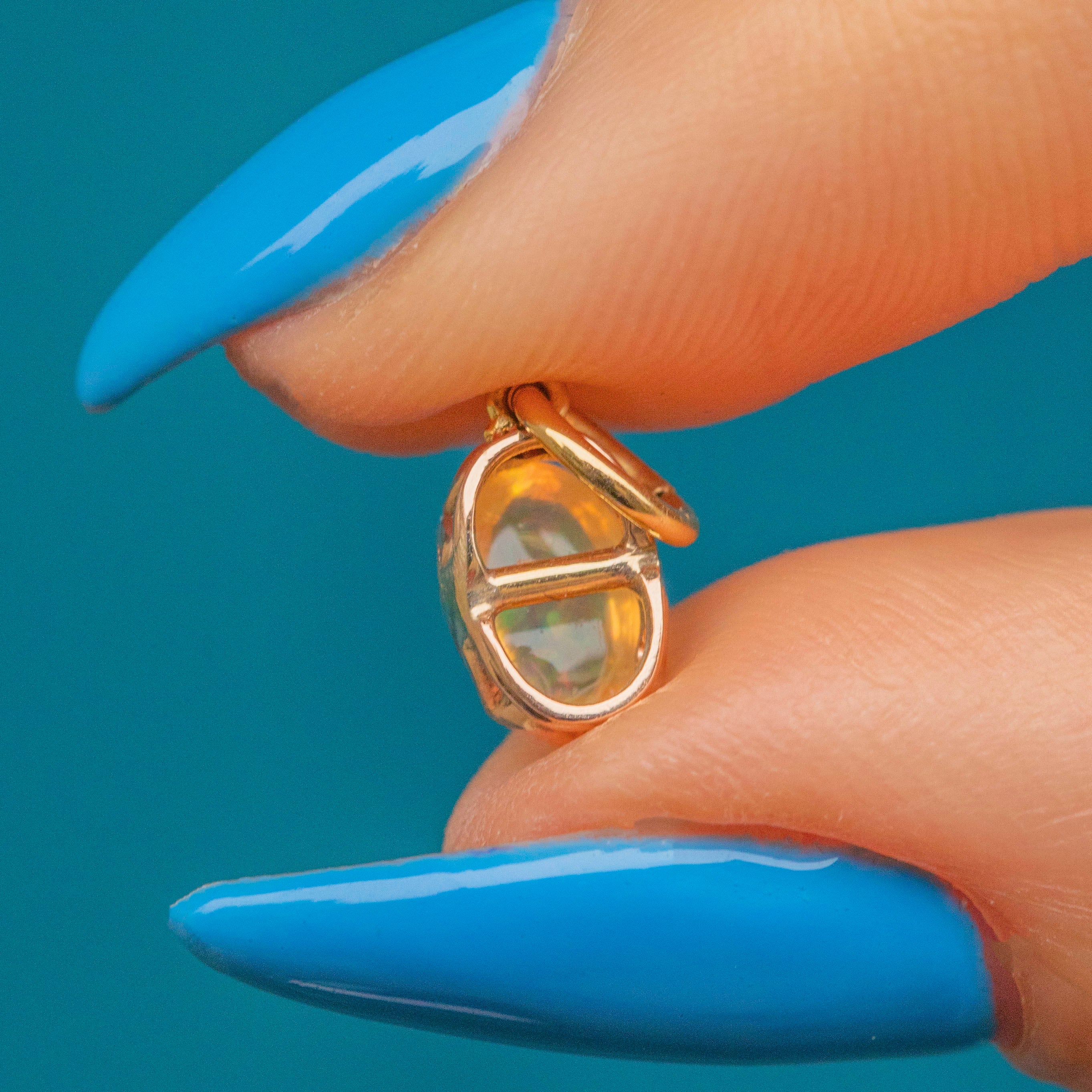 The splendour of this antique 15ct Gold Jelly Opal charm cannot be underestimated! She boasts an array of spectacular colours exuding from her surface, from lightning flashes of green to freckles of fiery orange with dashes of glossy yellow hues.