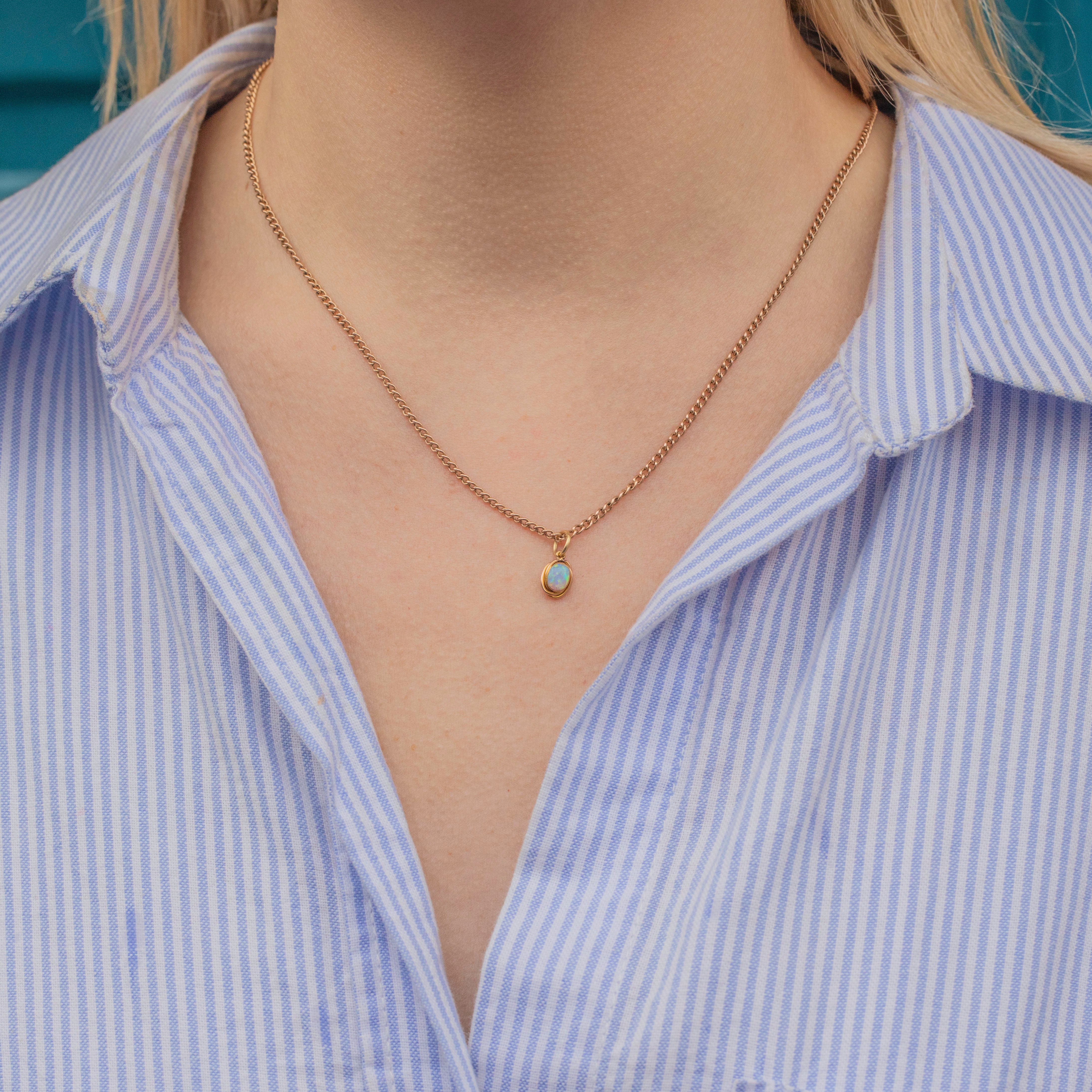 EXCELLENT. This antique 15ct Gold Opal charm is in excellent condition. The Opal cabochon has a lively display of colour, is smooth with no signs of wear, and securely held within its bezel setting. The Gold has a bright saturation throughout and the rare 15CT stamp on the back has remained crisp. All this antique Opal charm needs is a skinny Gold chain to adorn!