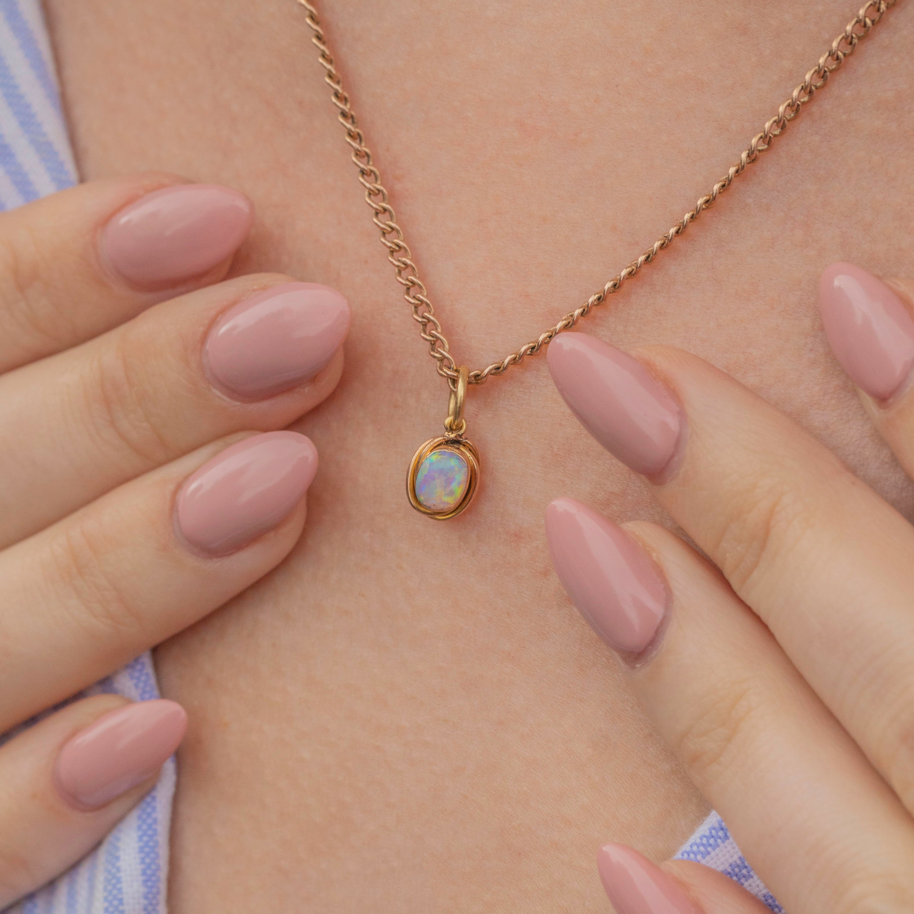 Add a vibrant pop of colour to your décolletage with this sensational antique 15ct Gold Opal charm! This Edwardian charm is dainty in size and is bursting with zingy hues, from azure blue with flecks of neon green, graduating to peachy pink dappled with acid orange.
