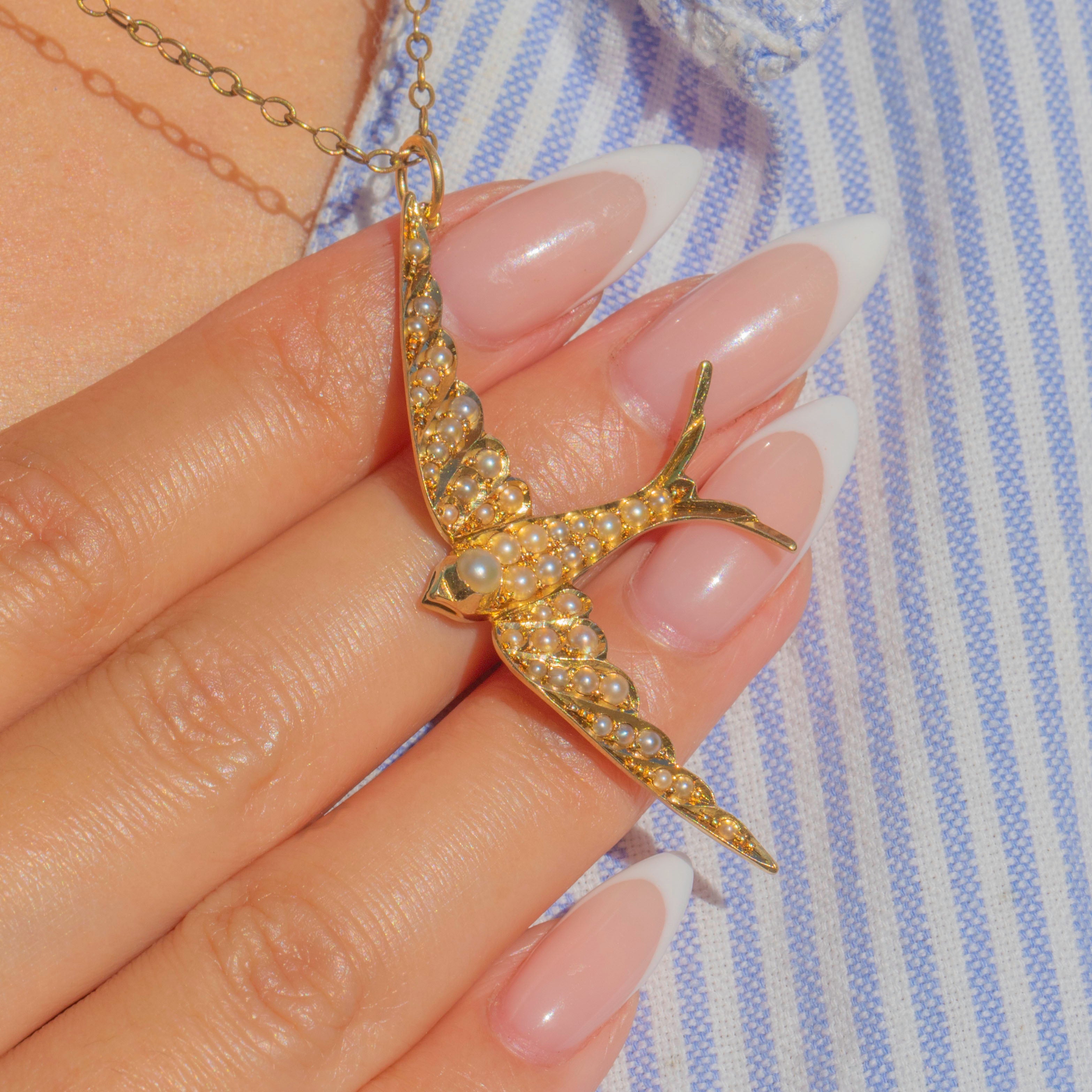 This magnificent Victorian Swallow pendant is crafted in rich 15ct Gold and set with luminous natural Pearls. The swallow, a beloved Victorian motif symbolising love, loyalty, and safe return, is beautifully rendered in a dynamic, sweeping pose that seems to capture the bird mid-flight.