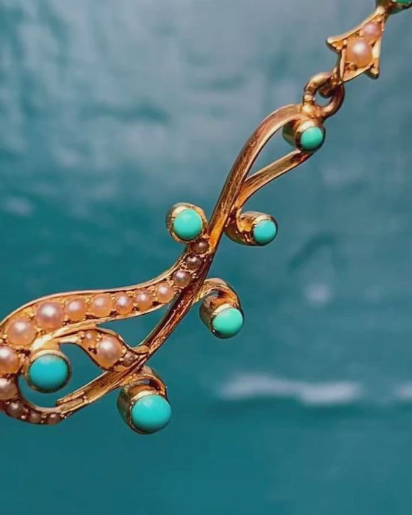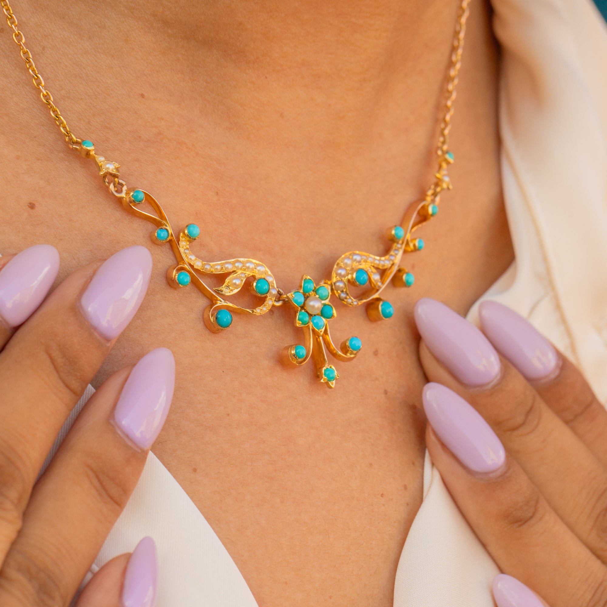 This antique 15ct Gold Pearl & Turquoise flower necklace is a magnificent example of Victorian craftsmanship! Inlaid with iridescent Pearls and smooth robin-egg blue Turquoise, this necklace exudes an undeniably feminine allure.