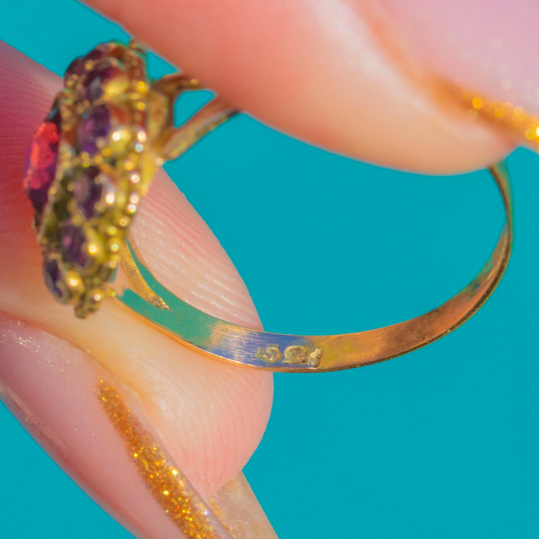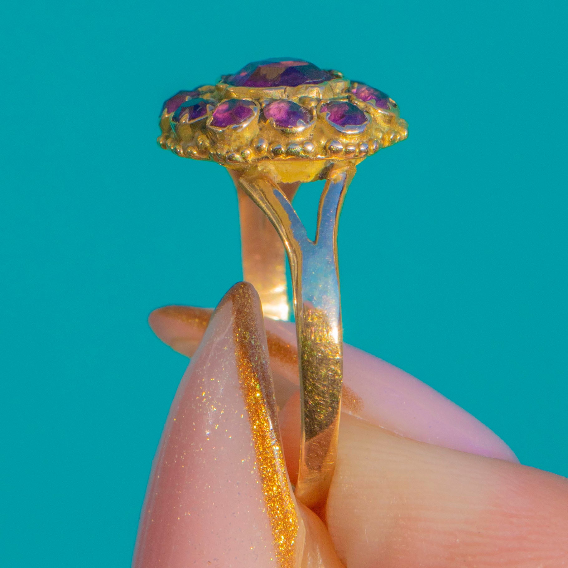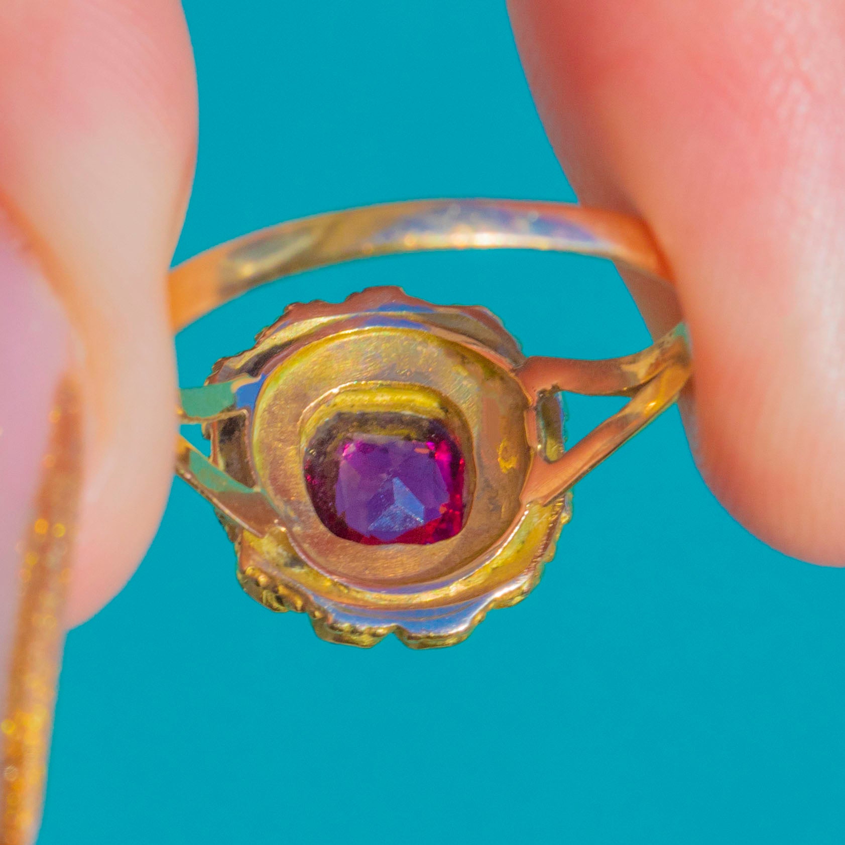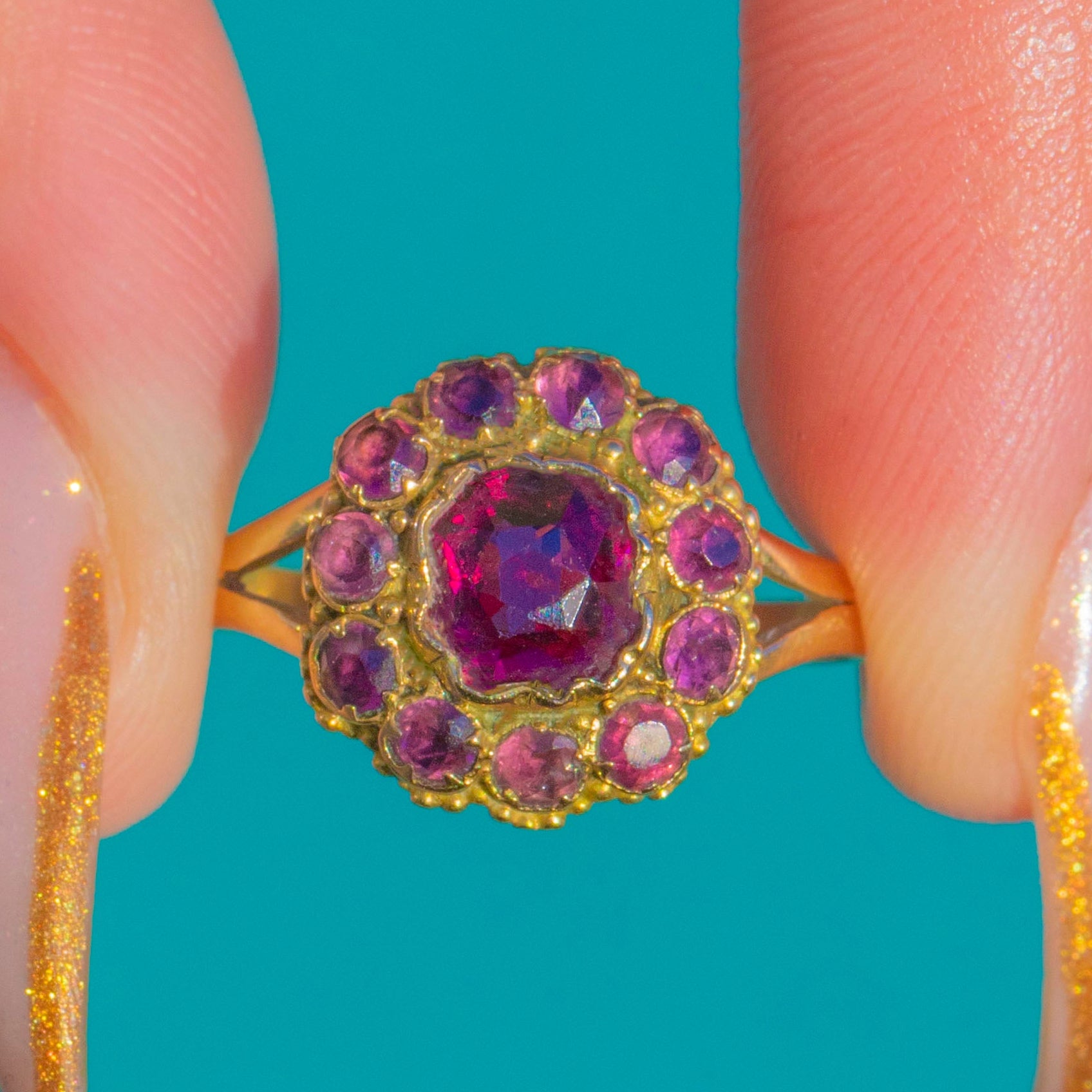 The buttery 15ct Gold setting gives it an unmistakably antique feel, with a slender band that makes the cluster the star of the show. A timeless and romantic Victorian design, perfect for everyday wear or as a meaningful antique gift.
