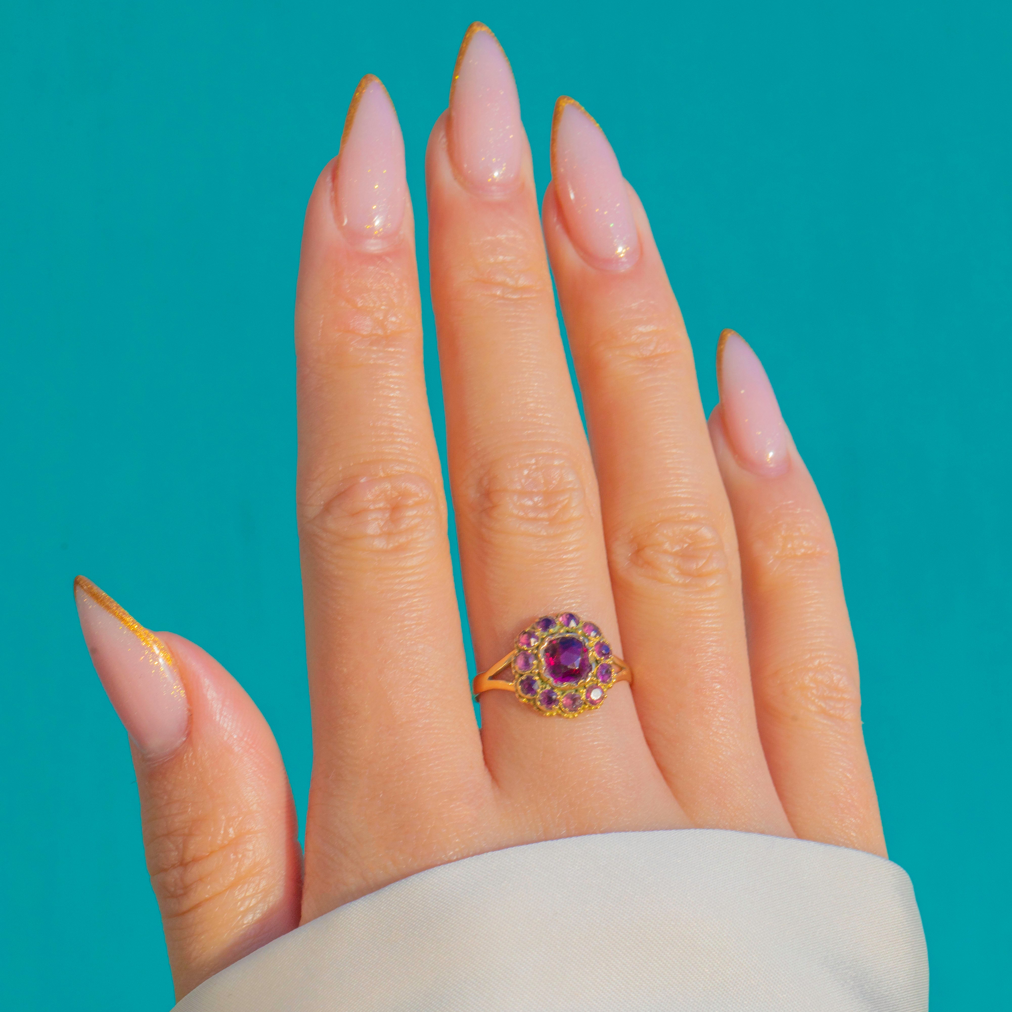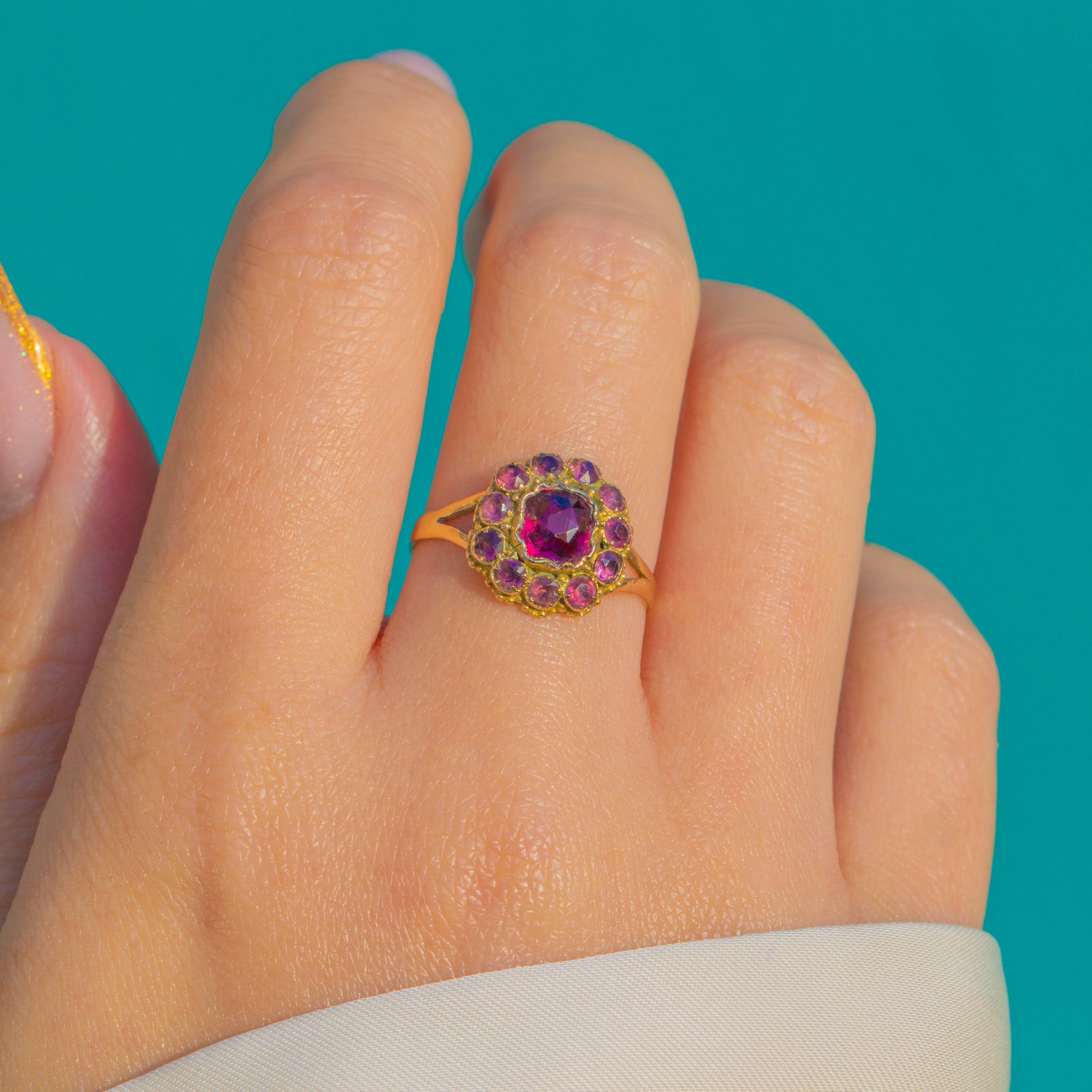 This beautiful Victorian 15ct Gold ring features a vibrant cluster of rich hot pink Garnets, arranged in a classic antique halo formation. The central stone sits proudly at the heart of the ring, framed by smaller, well-matched Garnets that add depth and warmth.