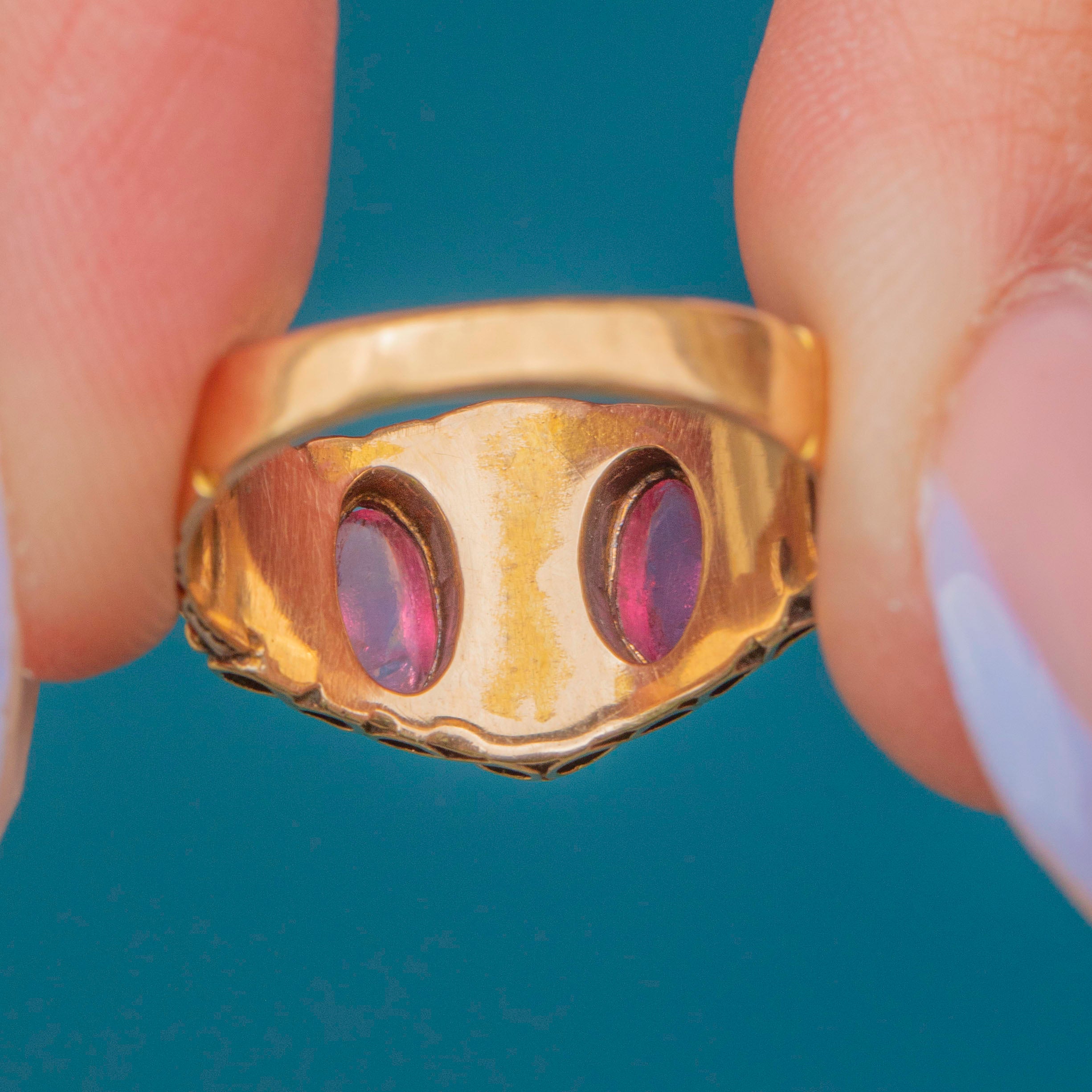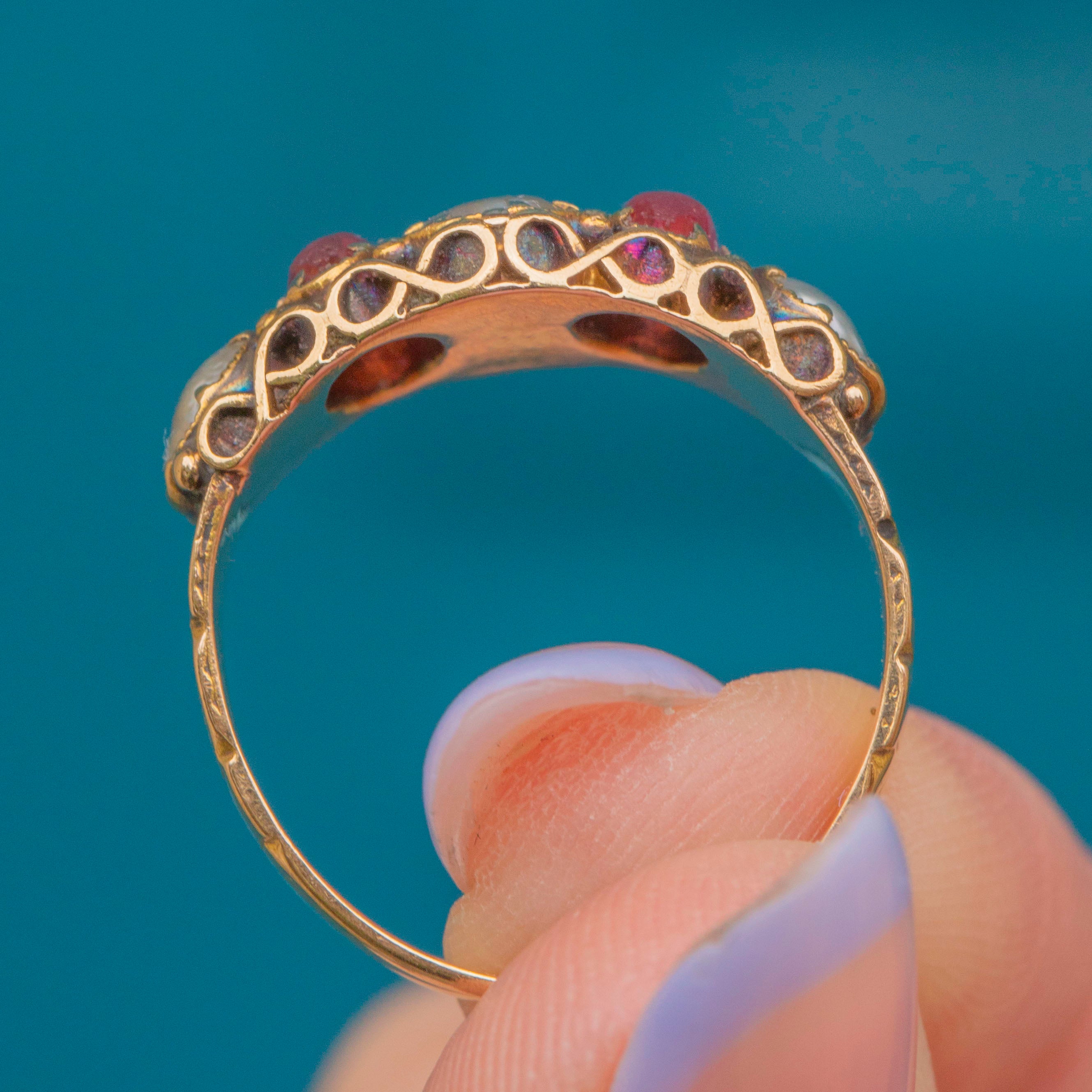 This antique ring is an exemplar of Victorian craftsmanship, formed from buttery 15ct Gold throughout with ornate settings and engraved shoulders providing her with a lovely texture. A brilliant piece to stack or wear alone, this antique Paste and Pearl ring is a must-have!