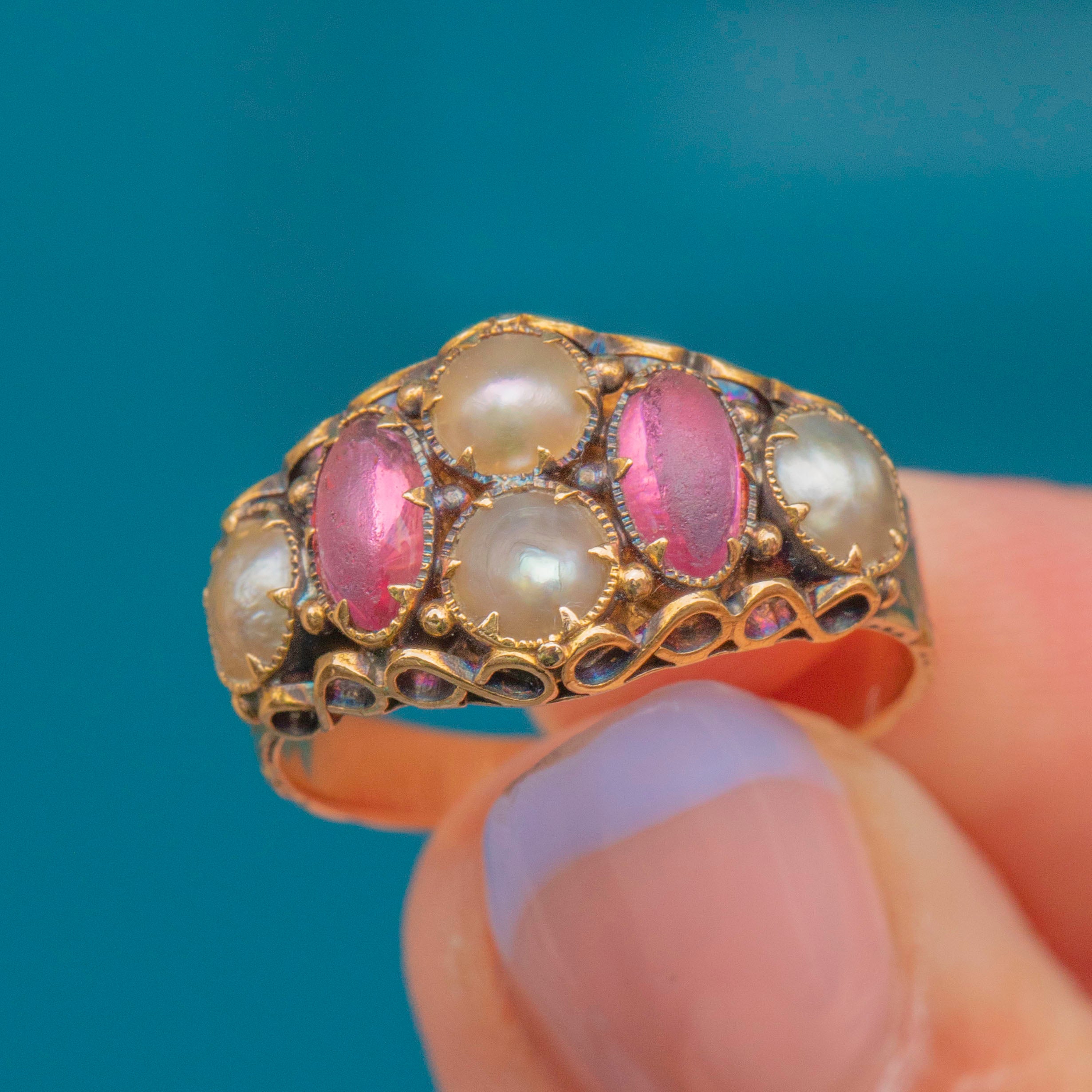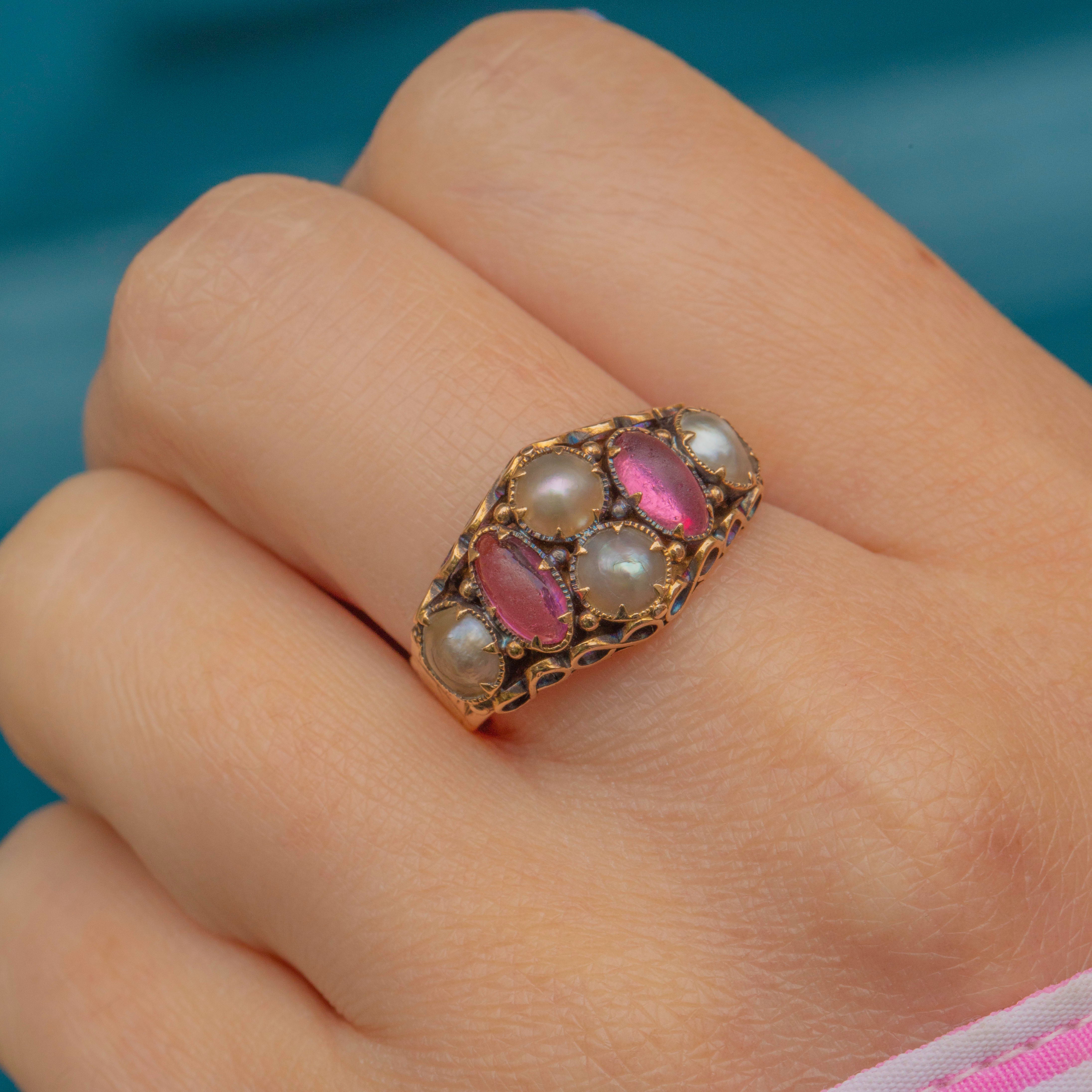 Radiating Victorian charm, this six stone ring flaunts two vibrant fuchsia pink Paste stones flanked by four iridescent Pearls, giving this ring a decadent and feminine appeal.