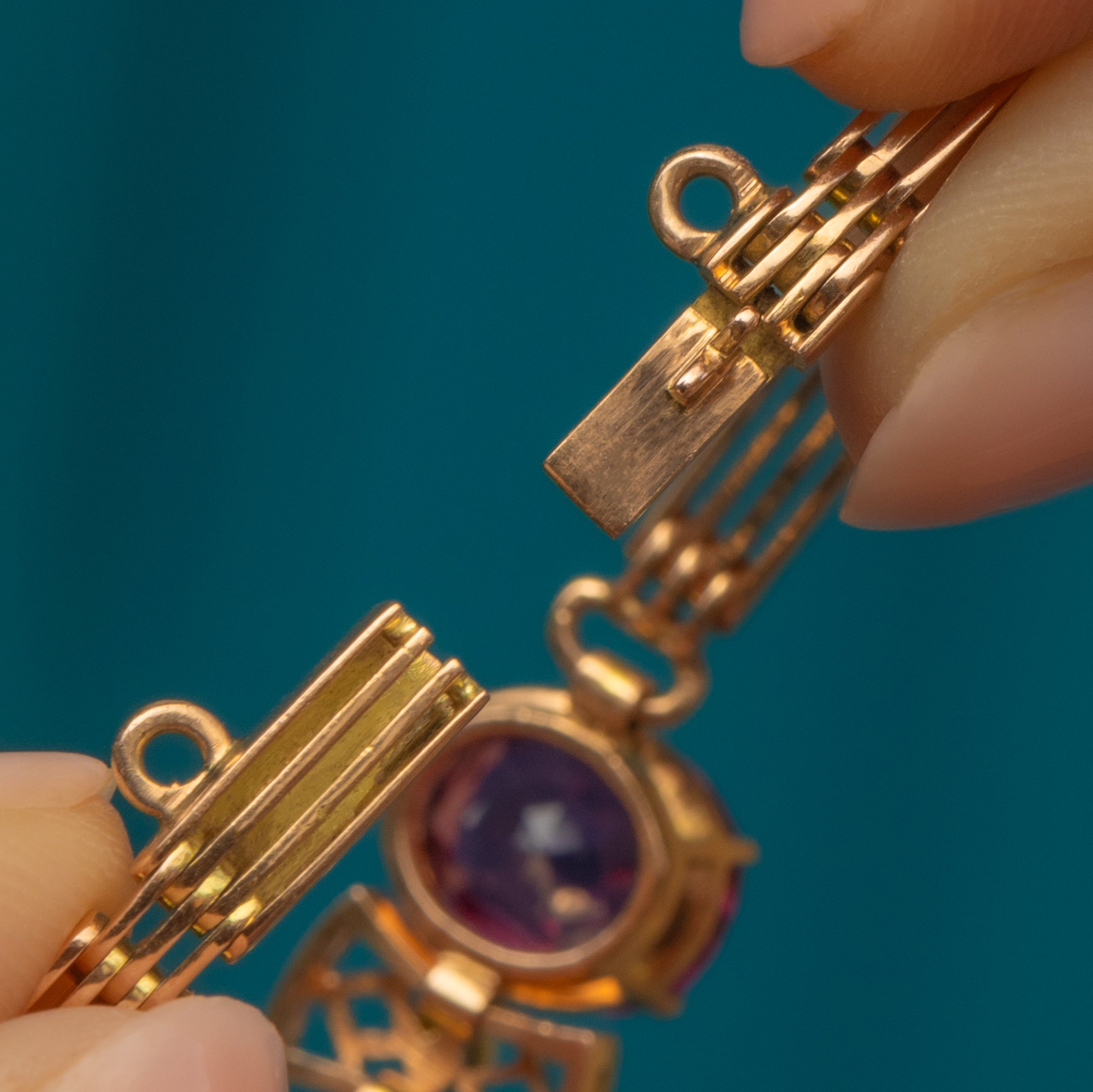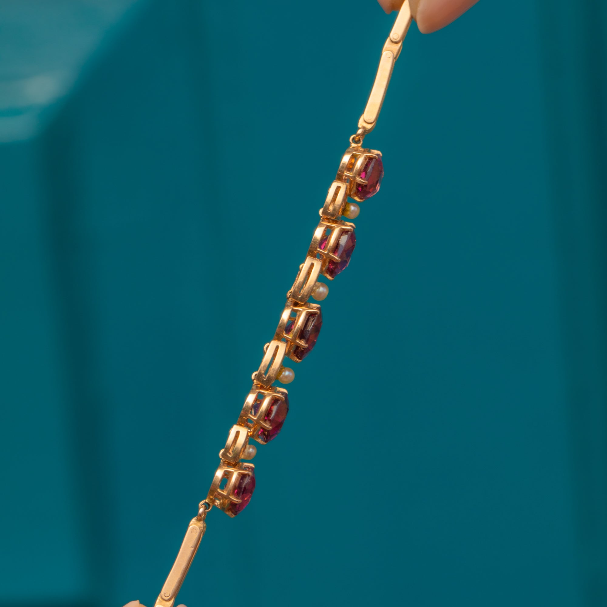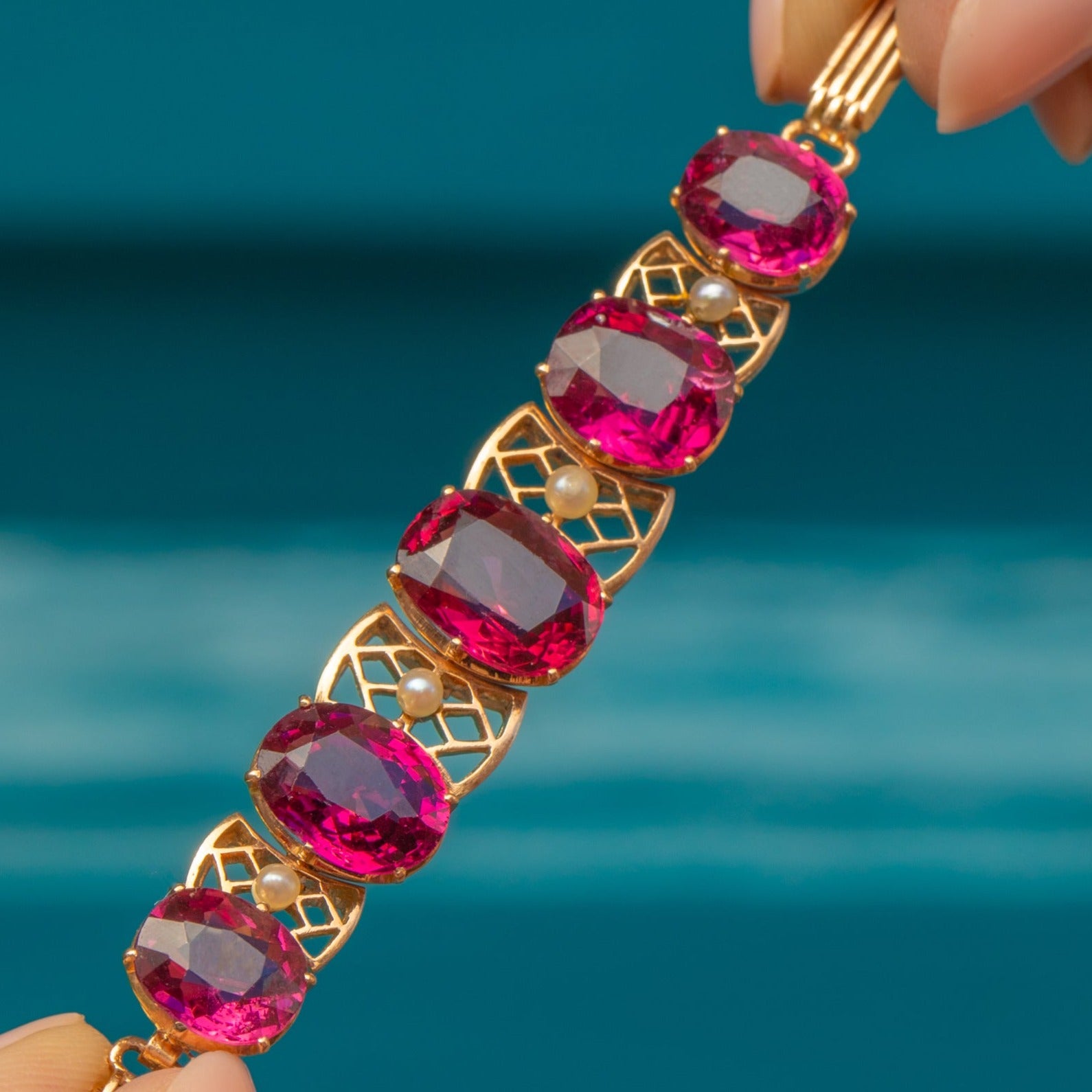 Discover the epitome of luxury with this antique 15ct Gold pink Tourmaline Pearl bracelet! Adorning her front are five exquisite graduating Tourmaline flaunting vibrant magenta hues, with a combined carat weight of 8.00ct and accompanied by lustrous Pearls set amongst geometric Gold work links.
