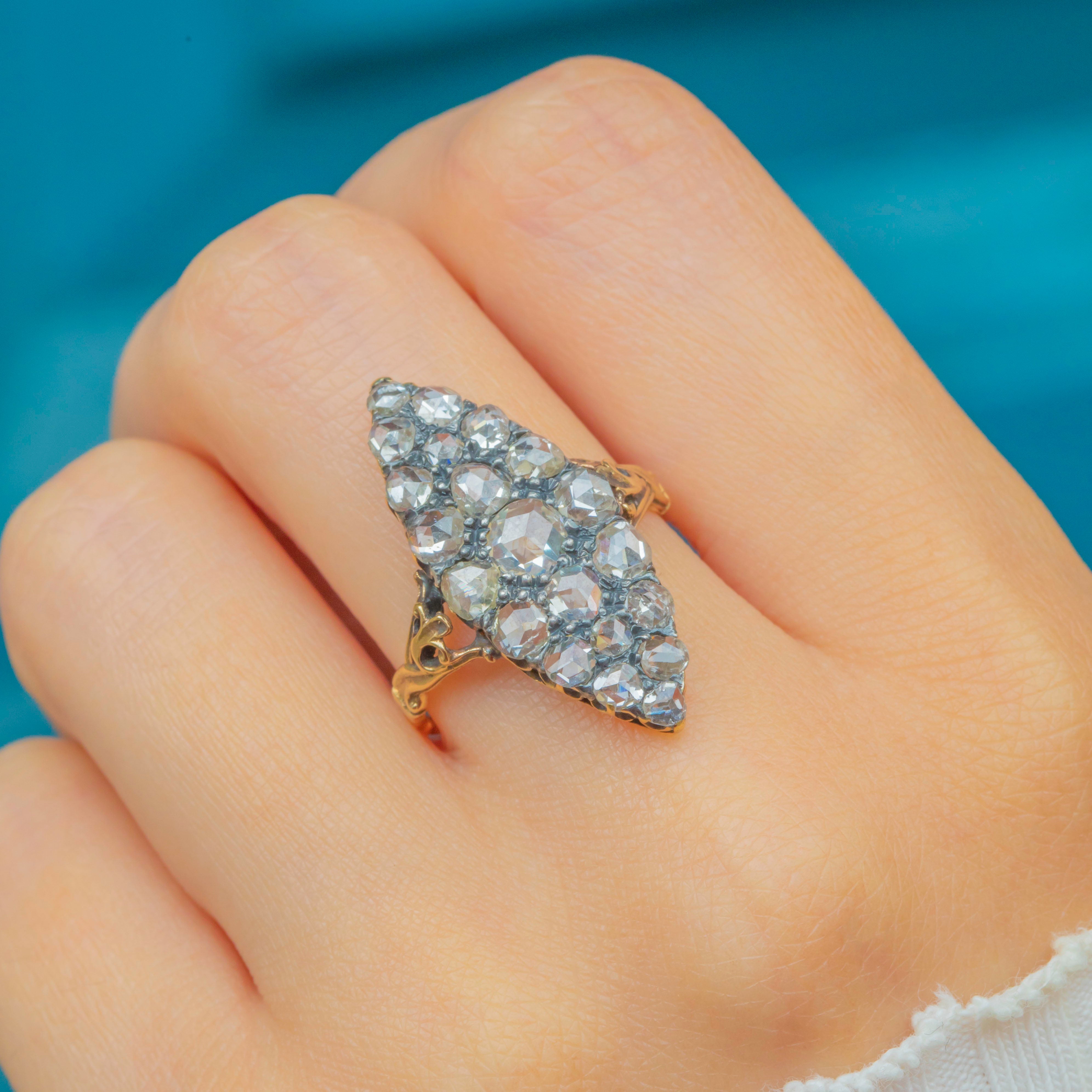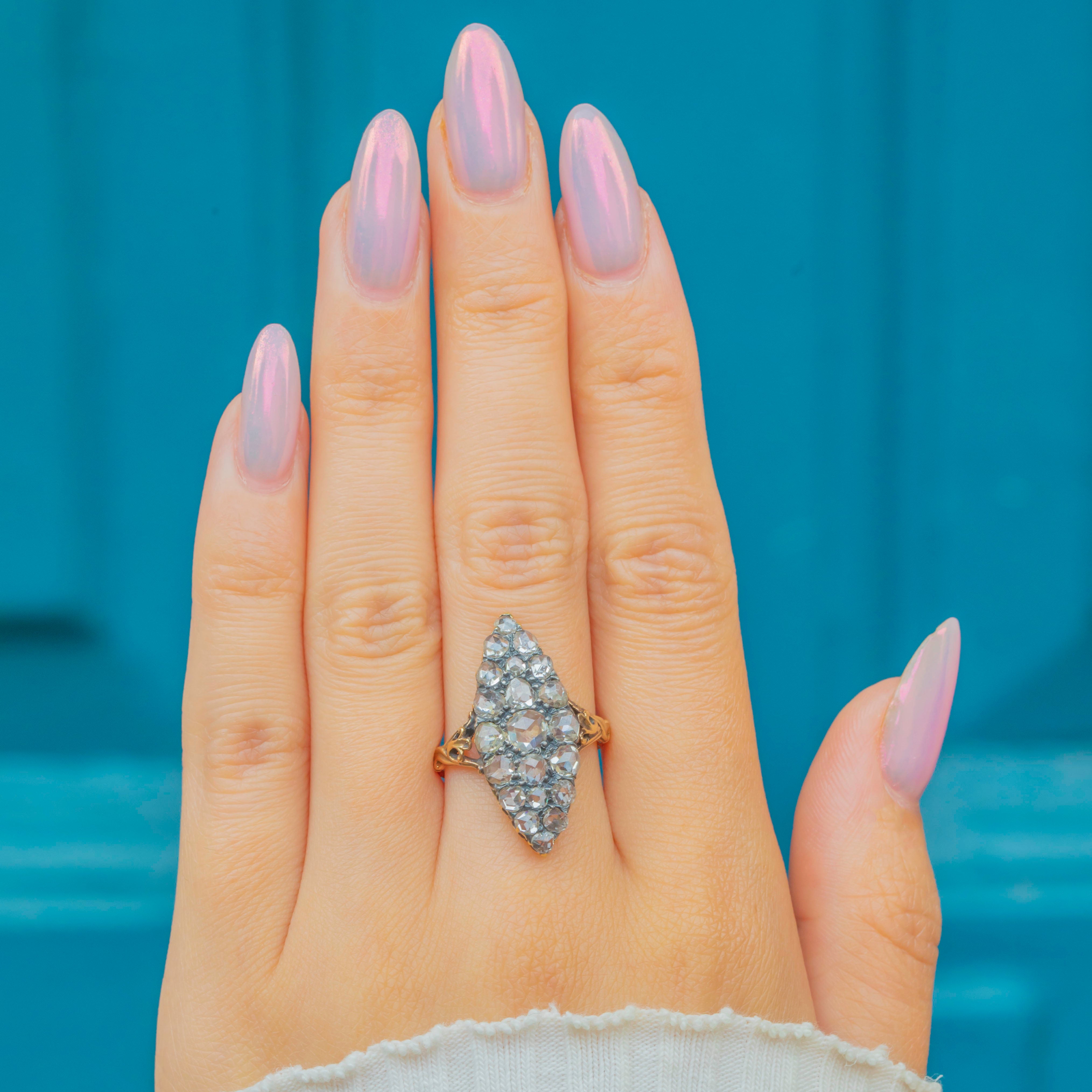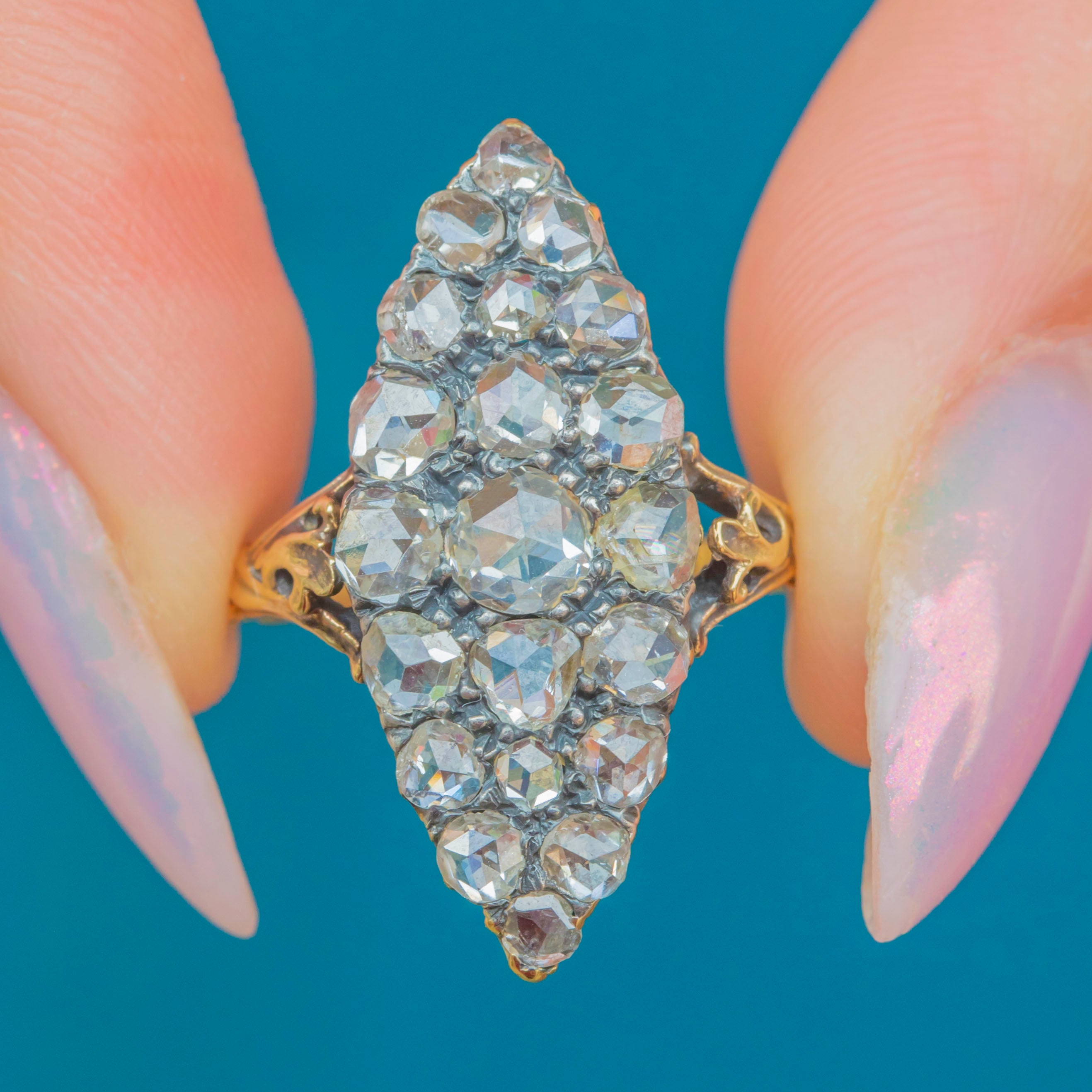 Boasting 1.80cts, this Victorian rose-cut Diamond navette ring dazzles from every angle!