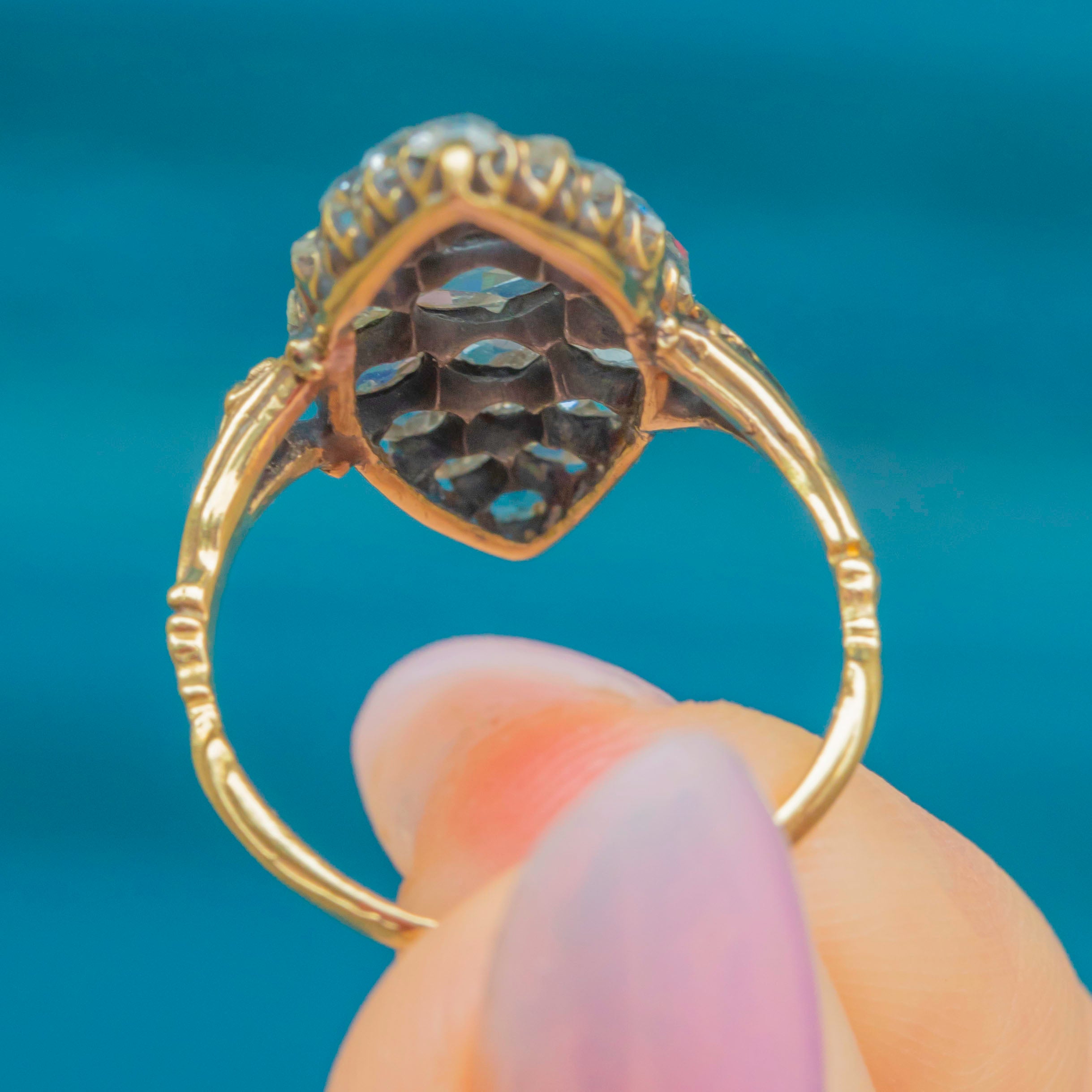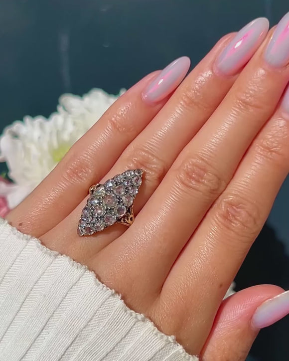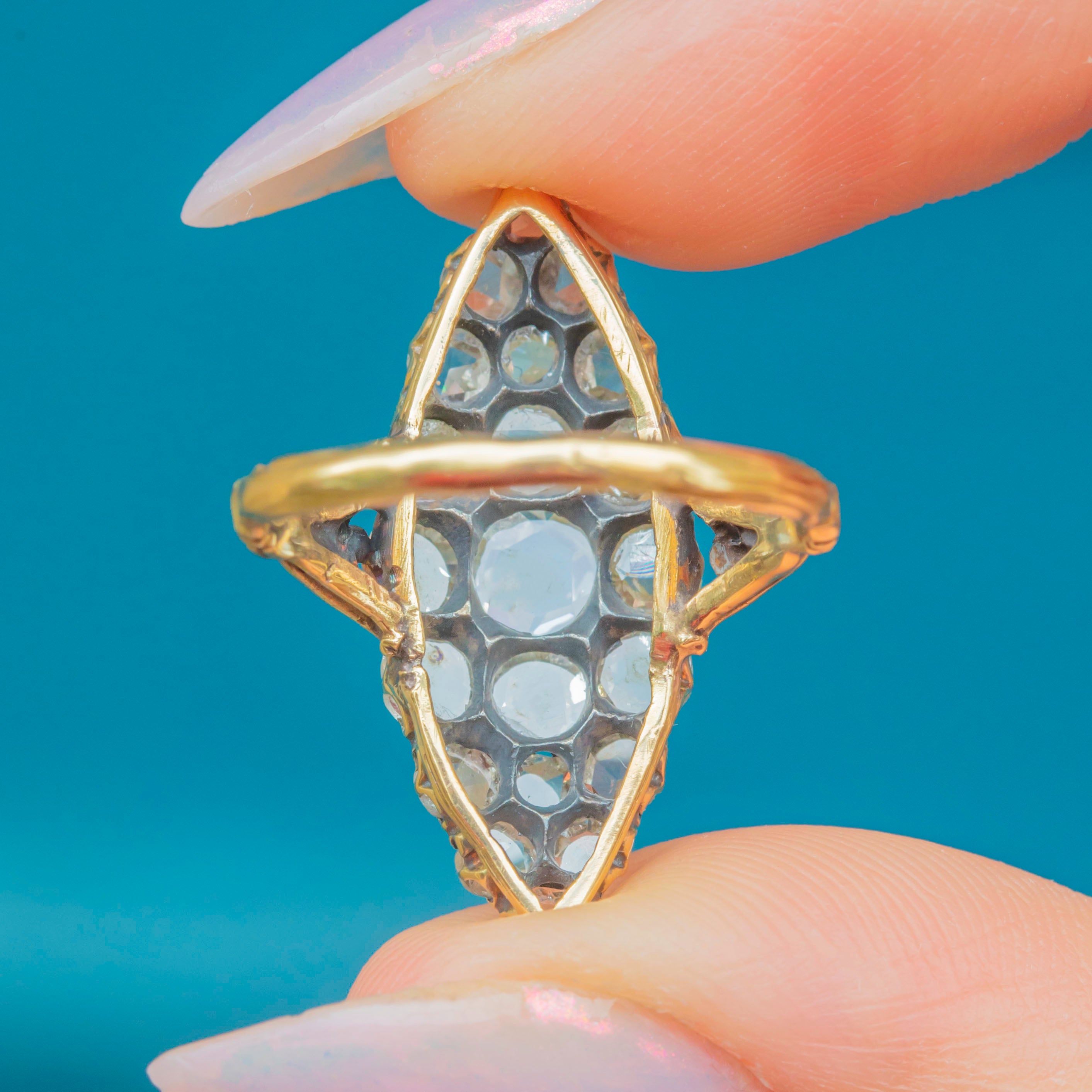 Boasting 1.80cts, this Victorian rose-cut Diamond navette ring dazzles from every angle!