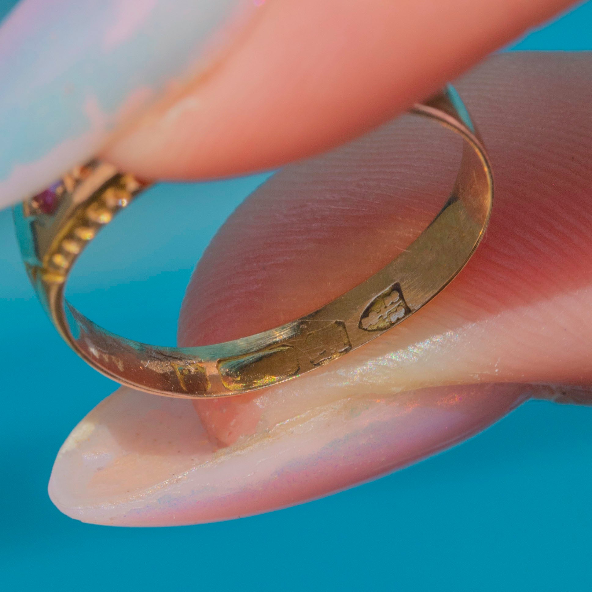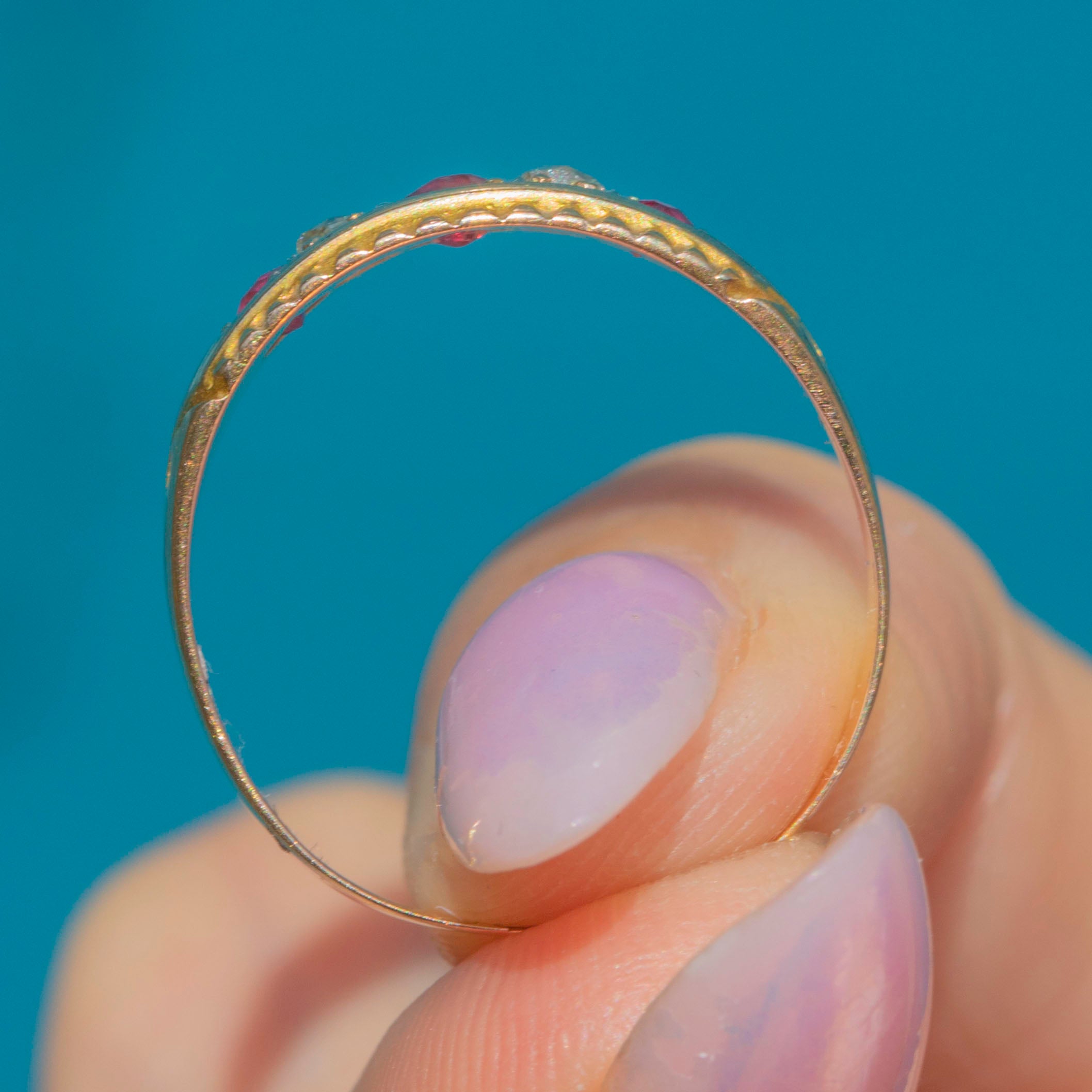VERY GOOD: Each gemstone is secure within its setting with no damage to note. The Rubies have a wonderful, deep crimson hue and no chips or abrasions, while the rose-cut Diamonds are charmingly bright and lively. The ring band has maintained a great shape. On the back of the band, there is some variation to the Gold tone due to a previous resizing, which has resulted in the loss of some hallmarks; however, this cannot be seen when worn. This Ruby Diamond ring will make a gorgeous addition to your collection!