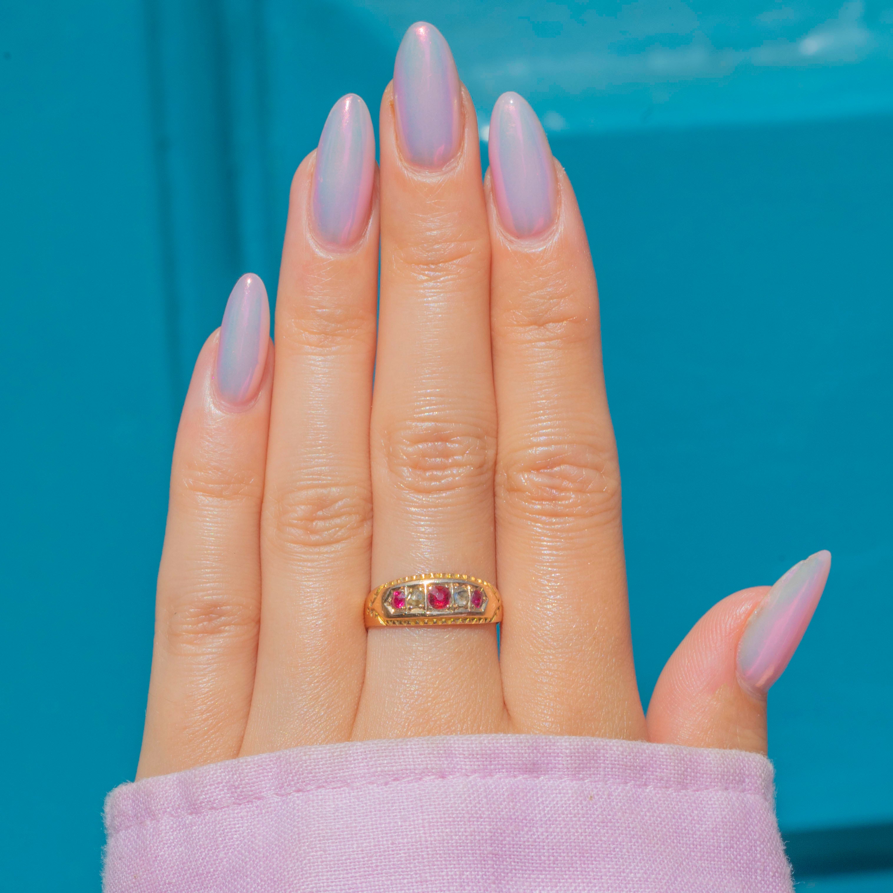 Prepare to feel opulent with this antique Ruby Diamond gypsy ring adorning your hand! The ring face is bursting with a myriad of sparkles, with vivid fuchsia flashes from her three Rubies, complemented by the icy sparkle from her rose-cut Diamonds, bringing bundles of character.