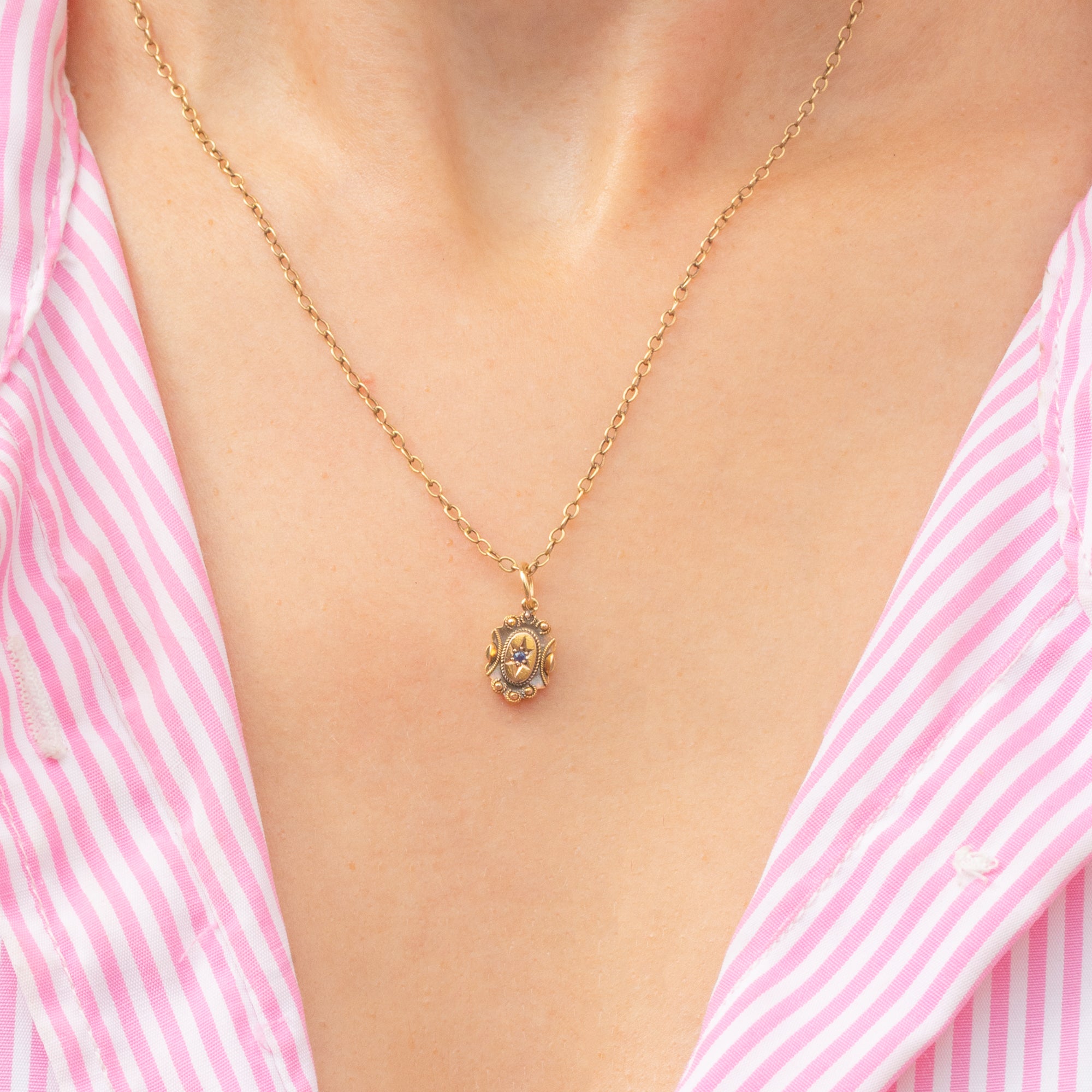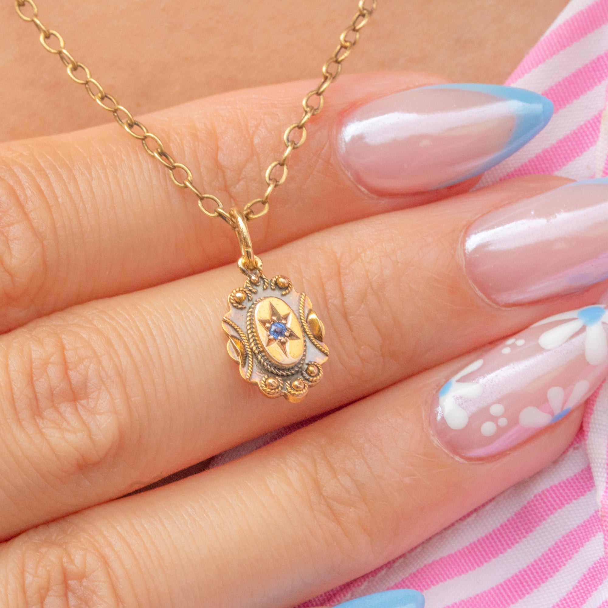 A star-set Sapphire takes centre stage, adorned with typical Etruscan detailing to create a striking adornment for a skinny Gold chain.