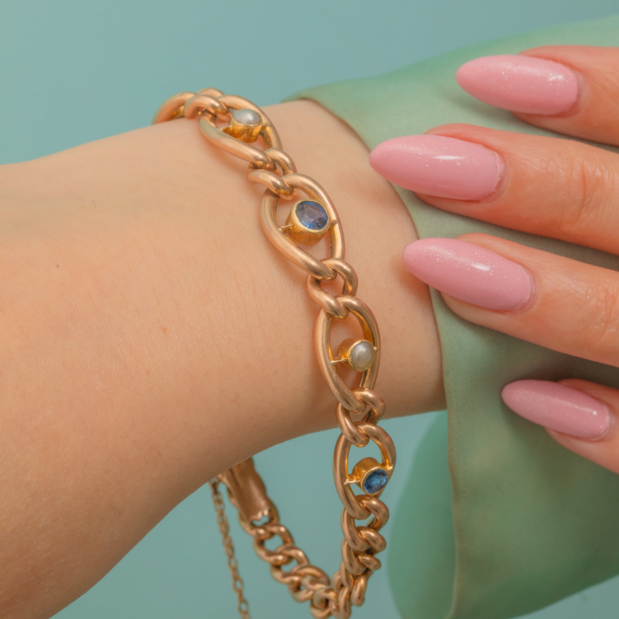 Antique 15ct Gold Sapphire Pearl Curb Link Bracelet