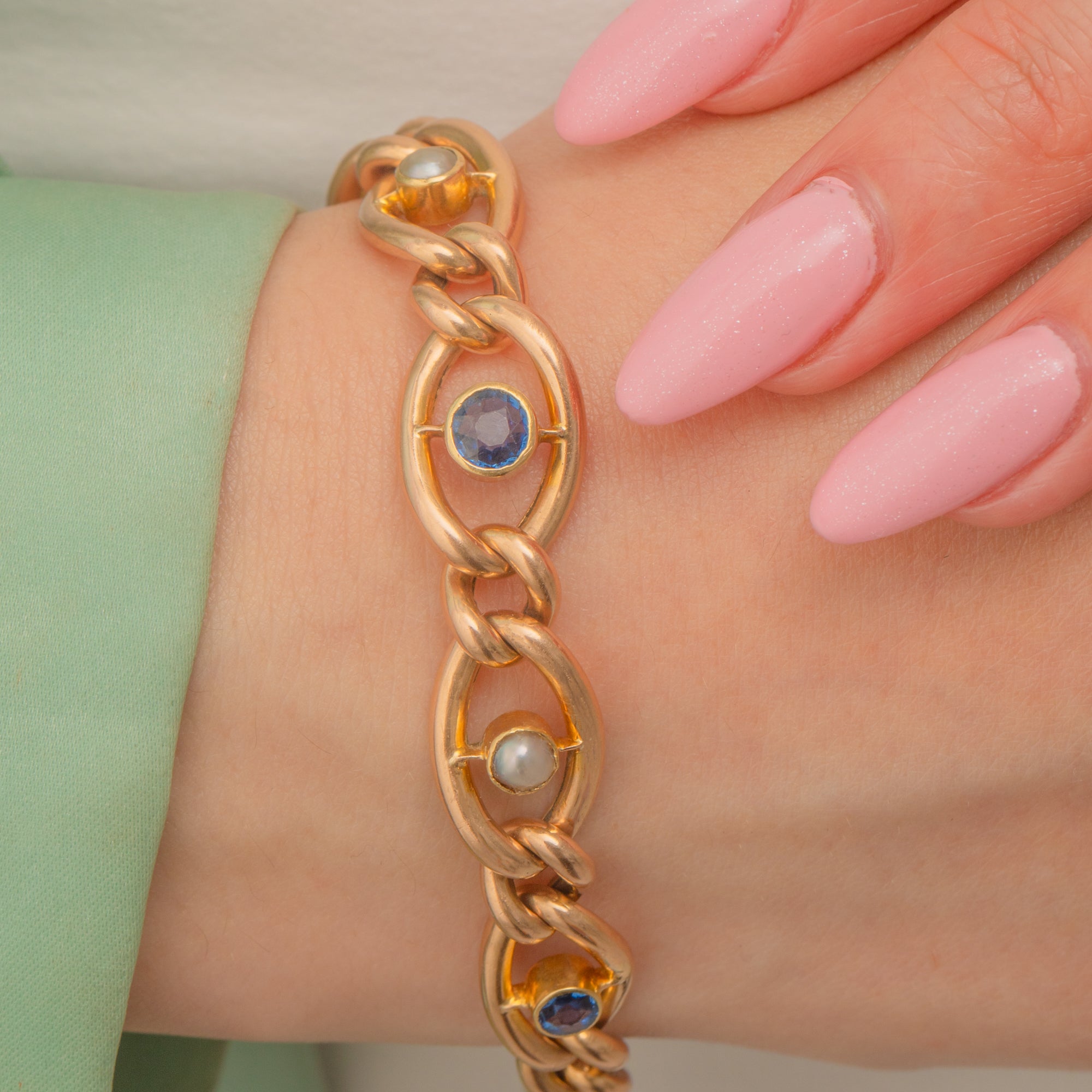VERY GOOD-EXCELLENT: This antique 15ct Gold Sapphire and Pearl curb link bracelet is in great condition. The Gold is bright and buttery, with only minor signs of wear to the clasp and settings. Each of her stones are securely set, and her clasp is in perfect working order. With a safety chain for added security, this antique Victorian curb link bracelet can be worn with utmost confidence!