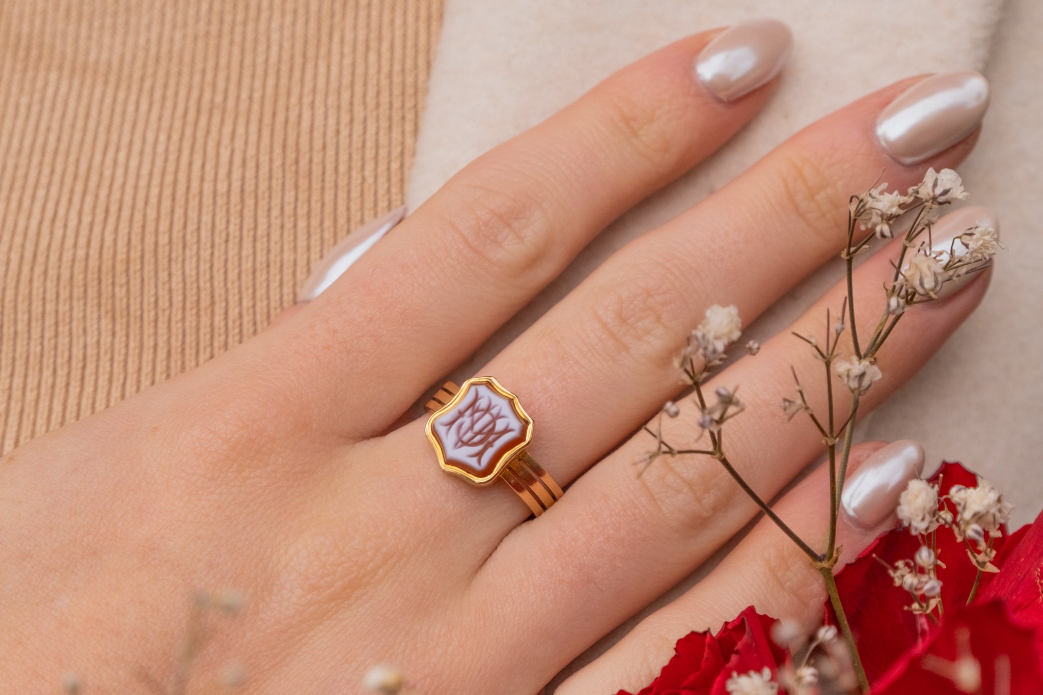 VERY GOOD. This beautiful antique 15ct Gold Sardonyx signet ring is in very good condition. The ring has a lovely triple band style and a securely set Sardonyx stone in a lovely shield design. The engraved stone is crisp and has gorgeous colouring. The hallmarks are obscured but the Gold has been tested and confirmed as 15ct.