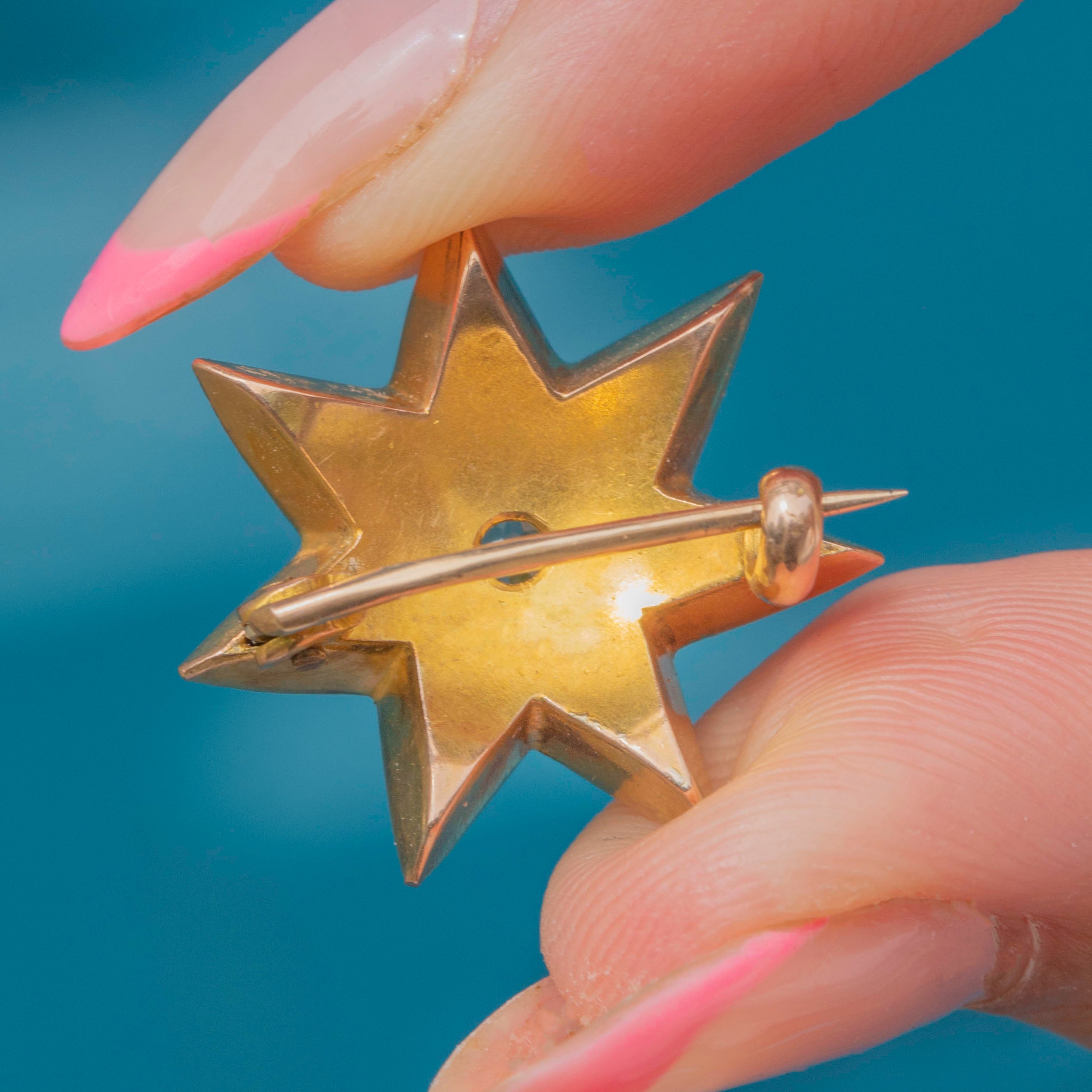 This antique 15ct Gold Turquoise Diamond star brooch is an undeniably striking piece! This seven-point star is crafted from rare, solid 15ct Gold, with a gorgeous satin finish that provides an exquisite backdrop for the resplendent gems displayed across its form.