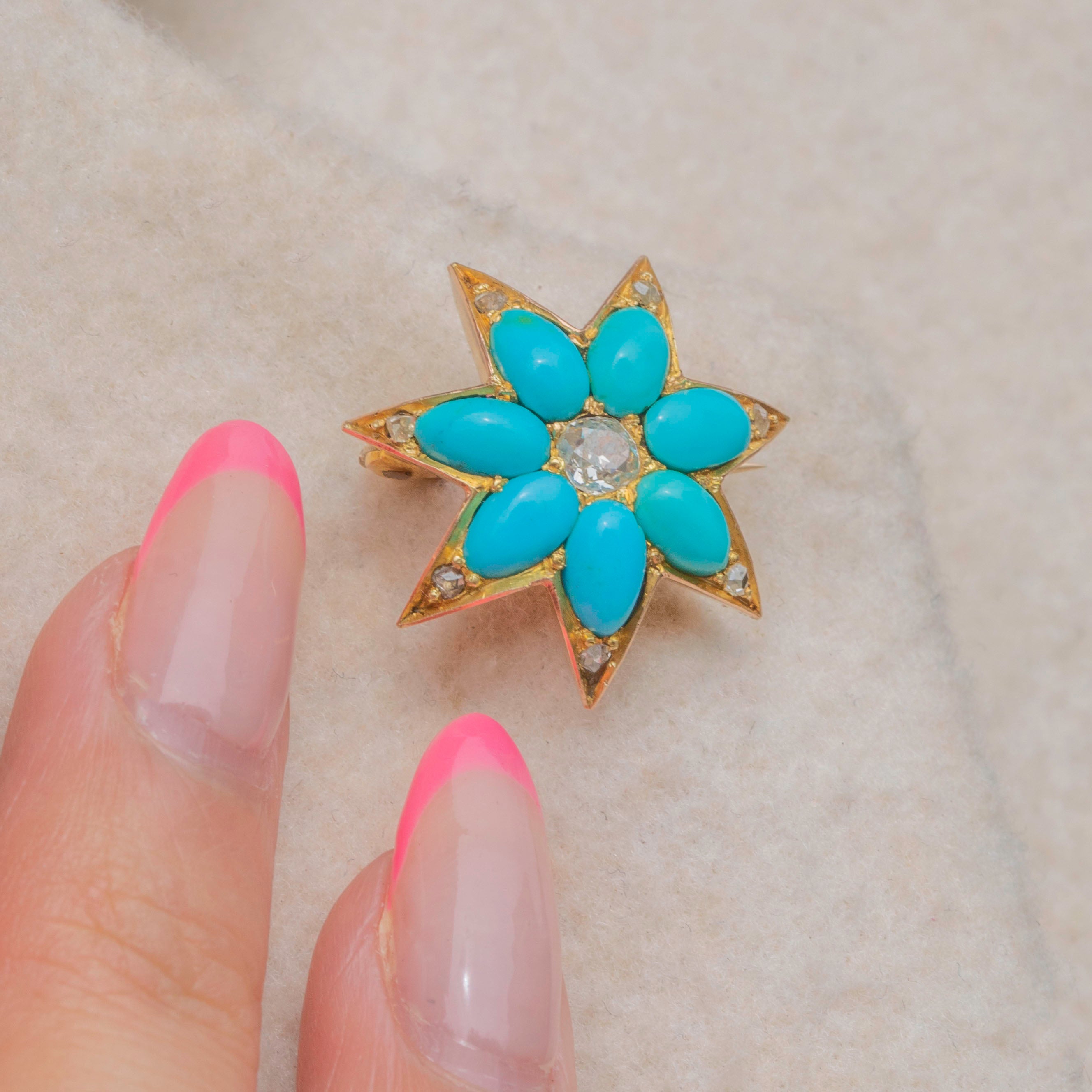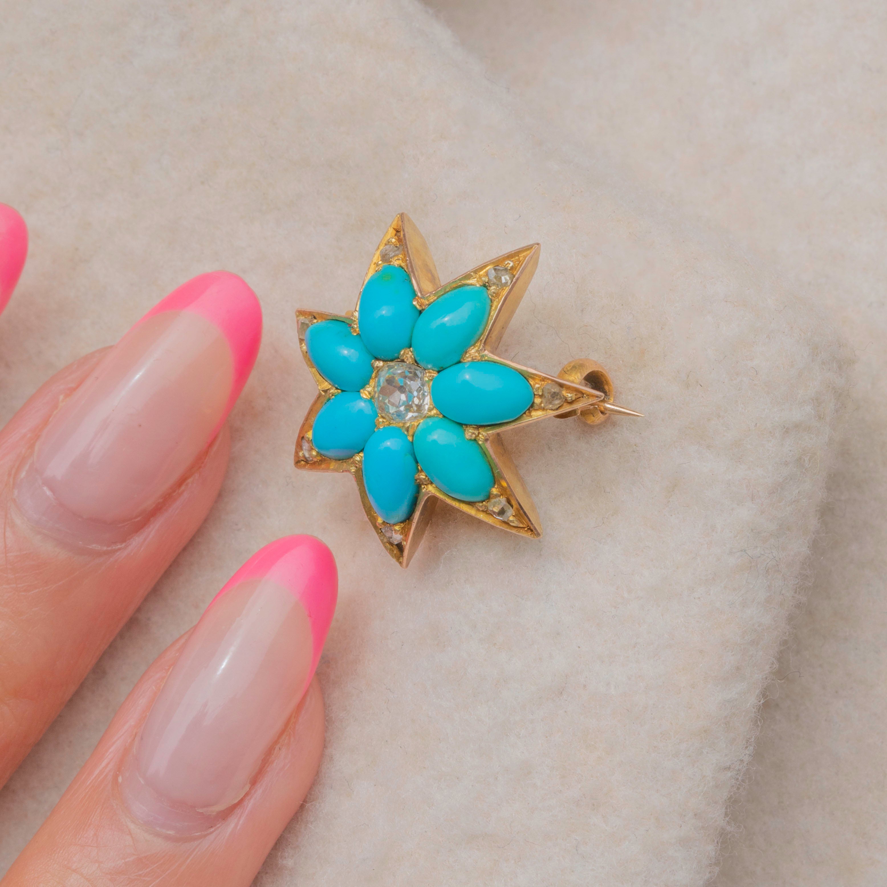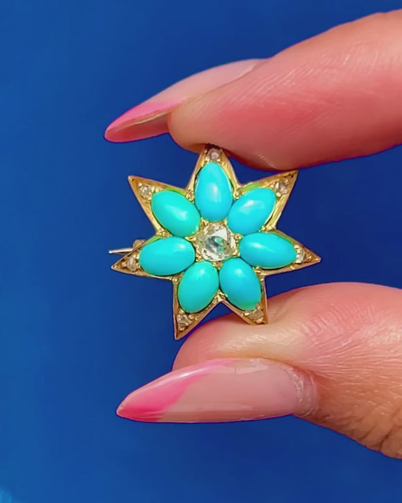 VERY GOOD-EXCELLENT: This antique 15ct Gold Turquoise Diamond star brooch is in wonderful condition. The gemstones are all present and securely set, with no visible chips or surface marks. The Gold has a gorgeous saturation, with only mild variation in hue on the back of the brooch. The brooch pin is robust, and although it requires a bit of a push, it slots into its c-clasp, allowing you to wear it confidently!