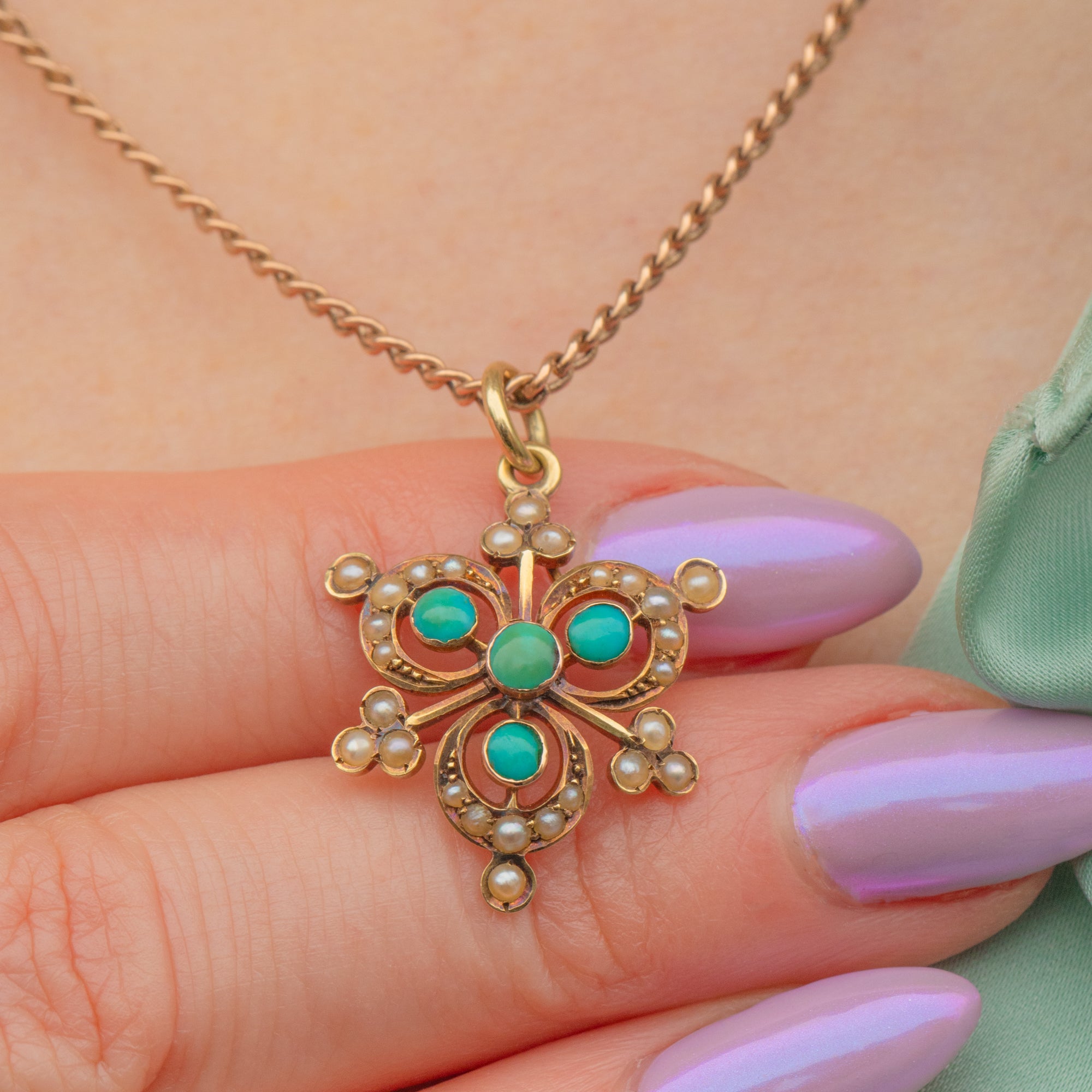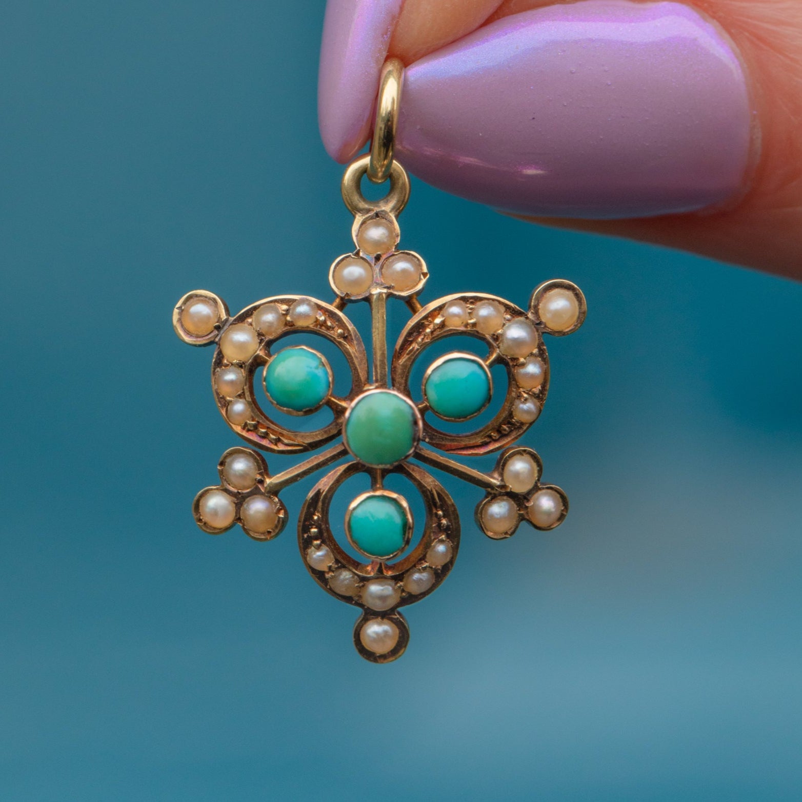 Antique 15ct Gold Turquoise Pearl Trefoil Pendant