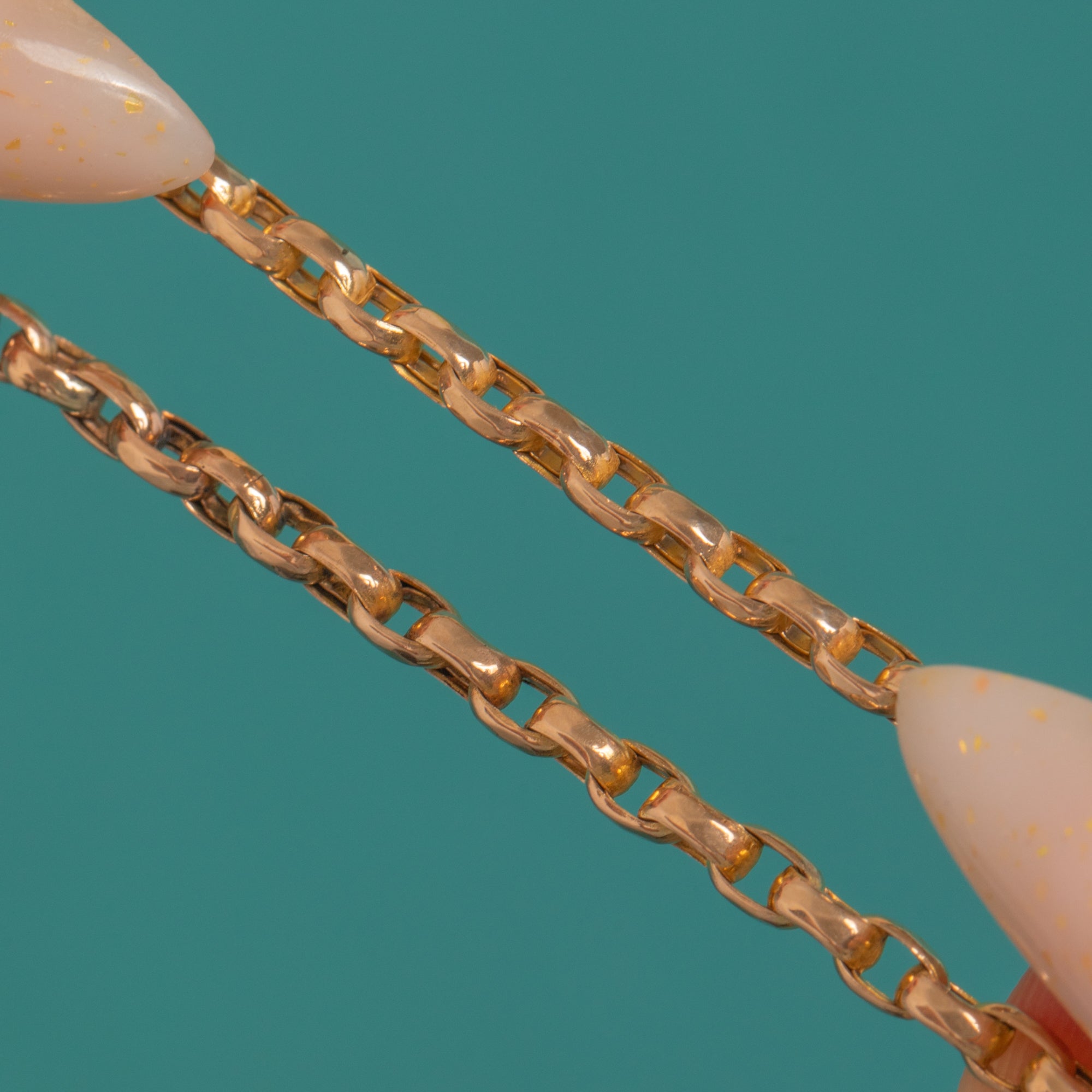 EXCELLENT: The links are bright and well-preserved with only light surface wear consistent with age. The chain articulates smoothly with no visible breaks or repairs. Beautifully cared for, retaining a high polish throughout.