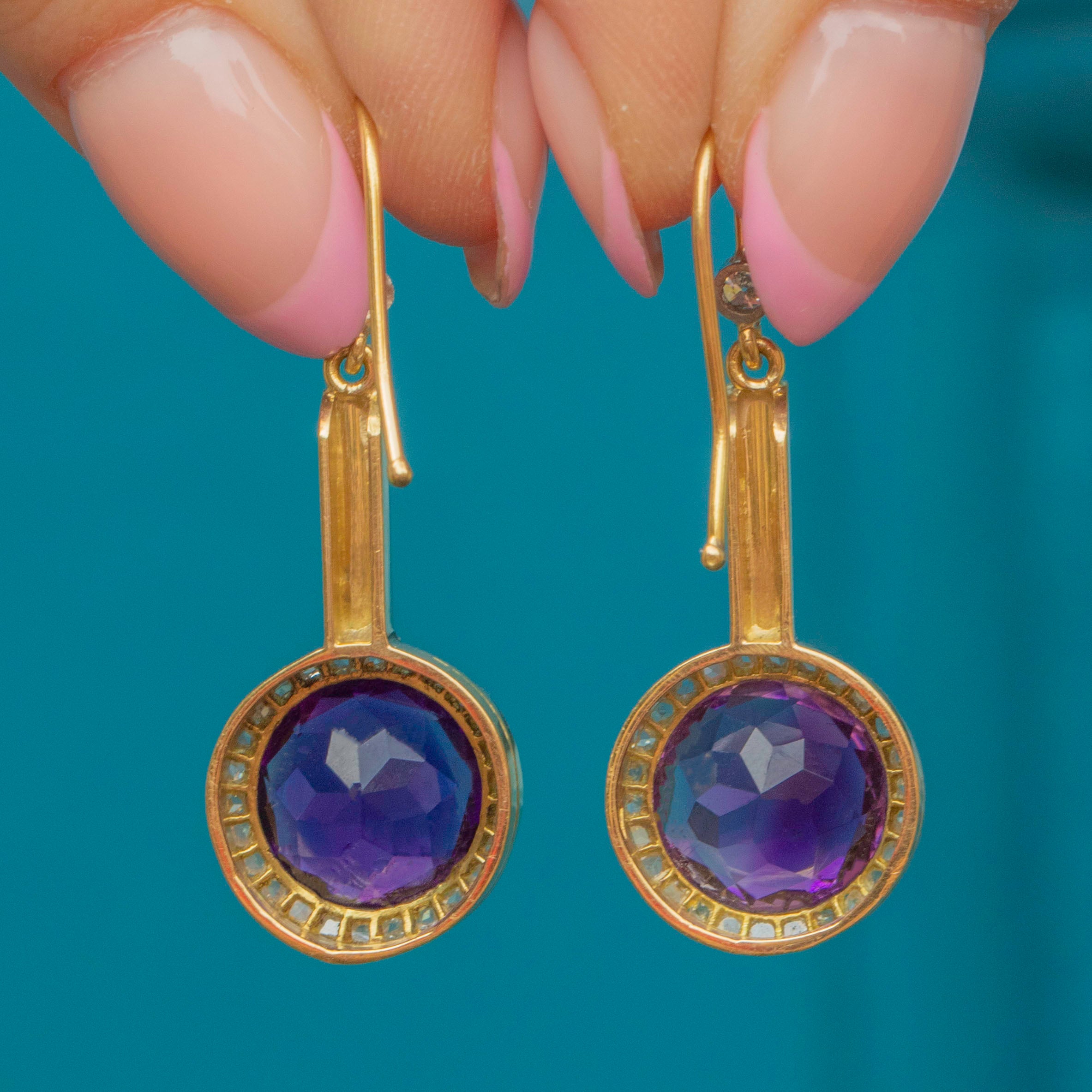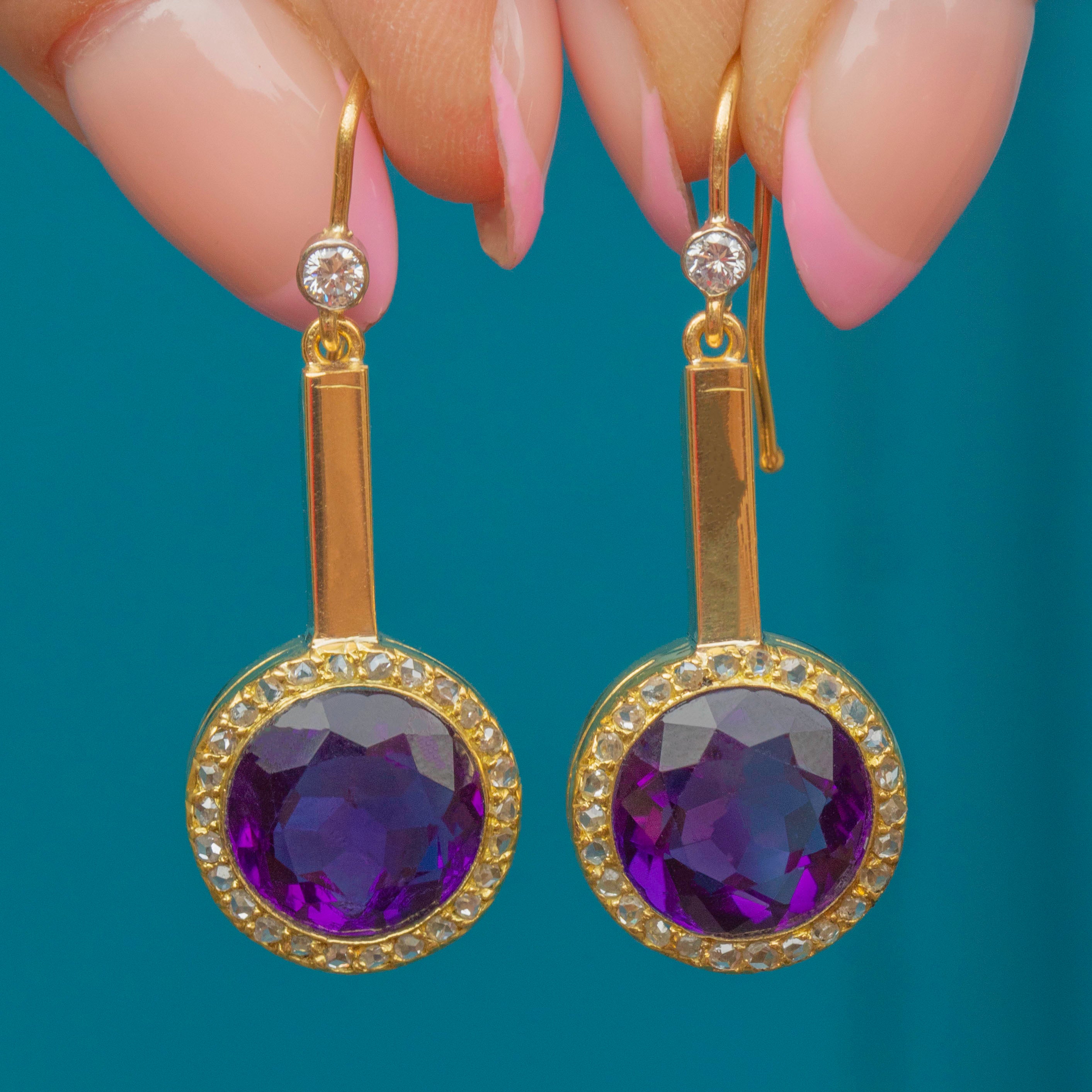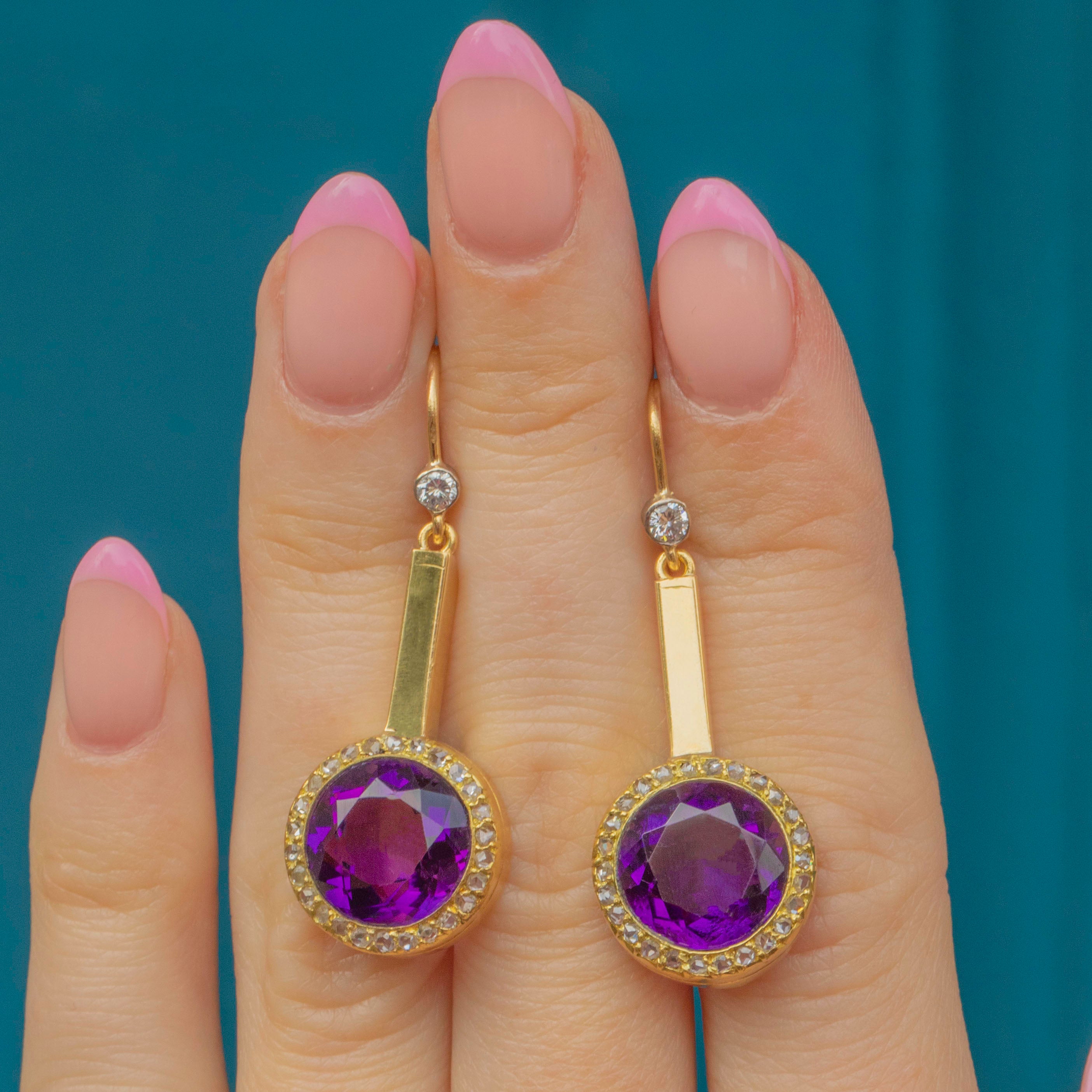 Each earring features a vivid Siberian Amethyst centre with the most intense rich and noble purple hue, in a halo of twinkling Rose-cut-Diamonds. They nestle into buttery 18ct Gold settings and fall pendulously with just the right amount of swing and movement to feel (and look) amazing!