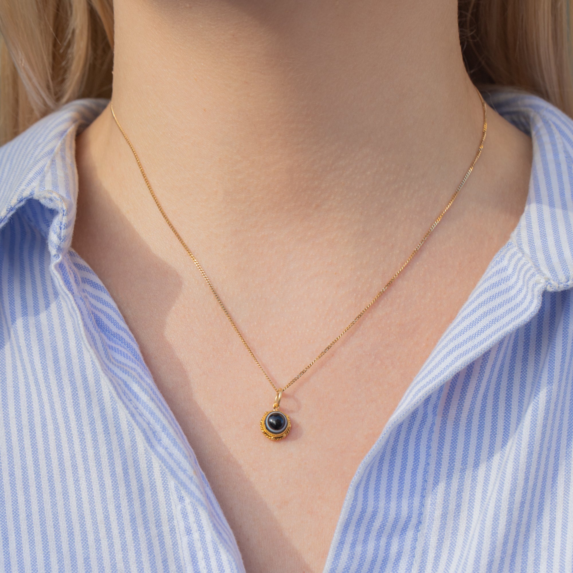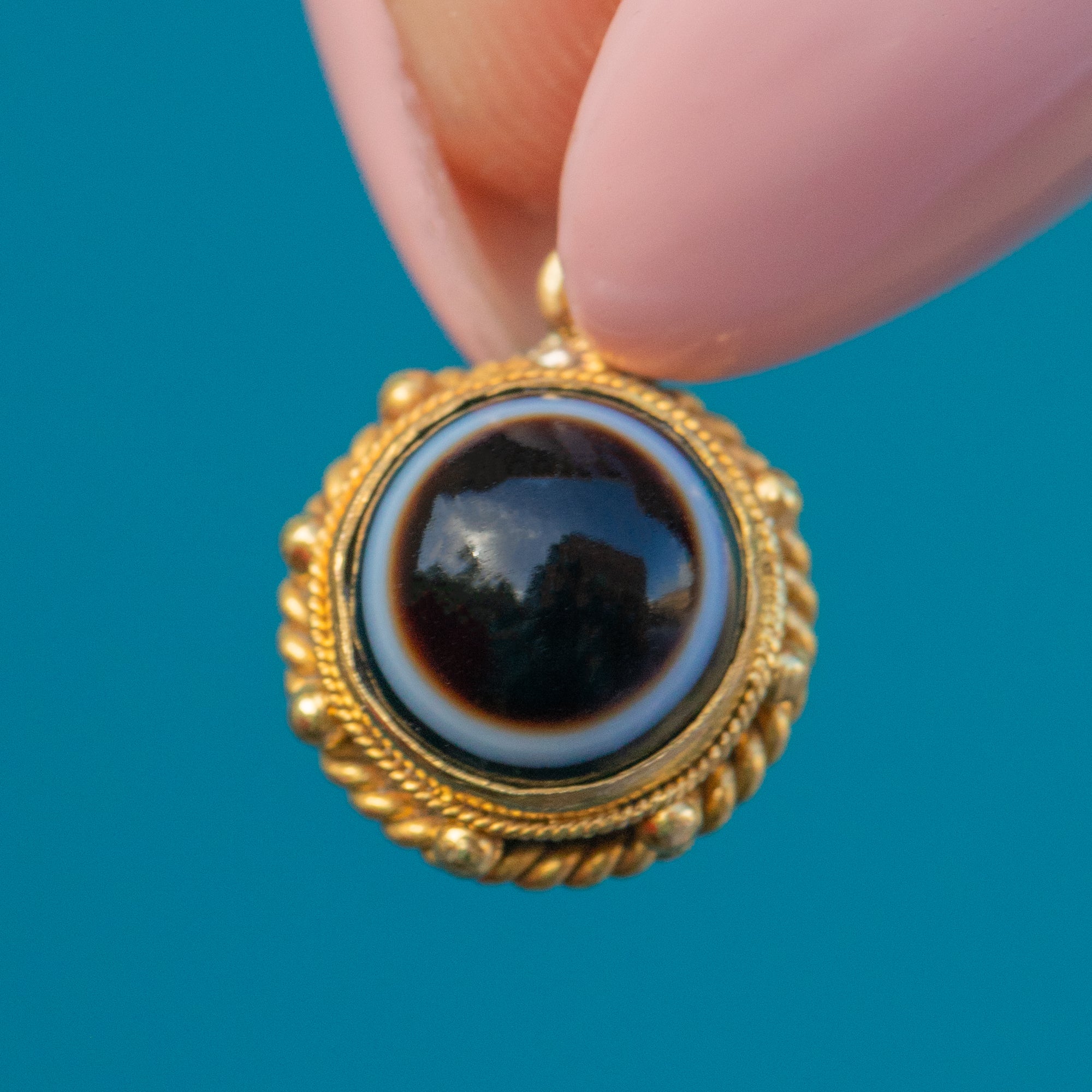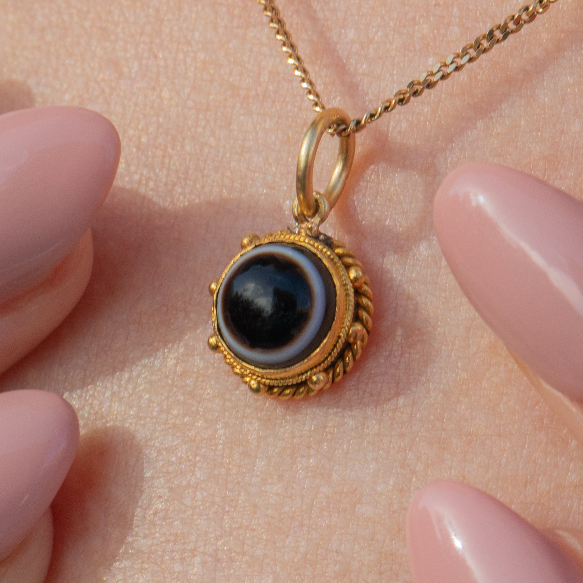 This timeless antique 18ct Gold Banded Agate charm is a must for your neck stack!