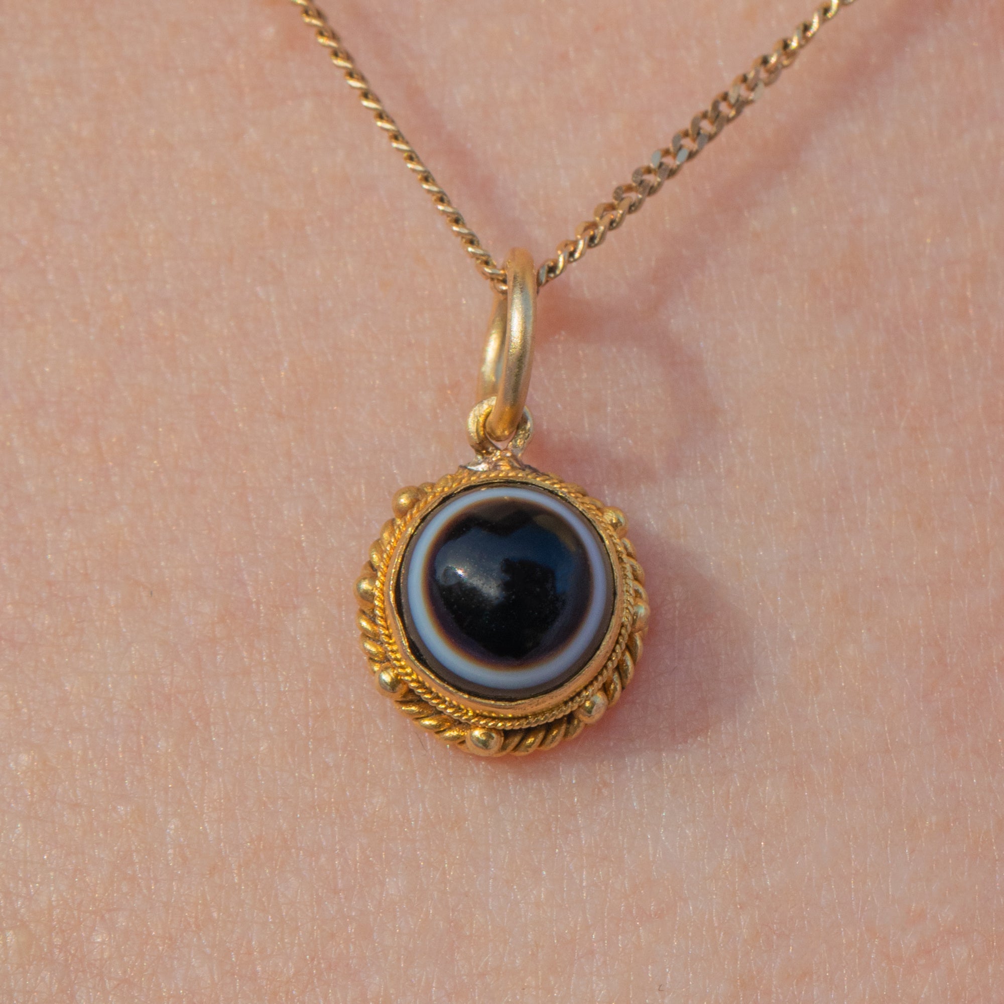 We simply adore the petite size of this 18ct Gold Agate charm making it the perfect everyday accessory, complete with a smooth top and wonderful transitions in colour from jet black, a milky band of white to deep caramel!